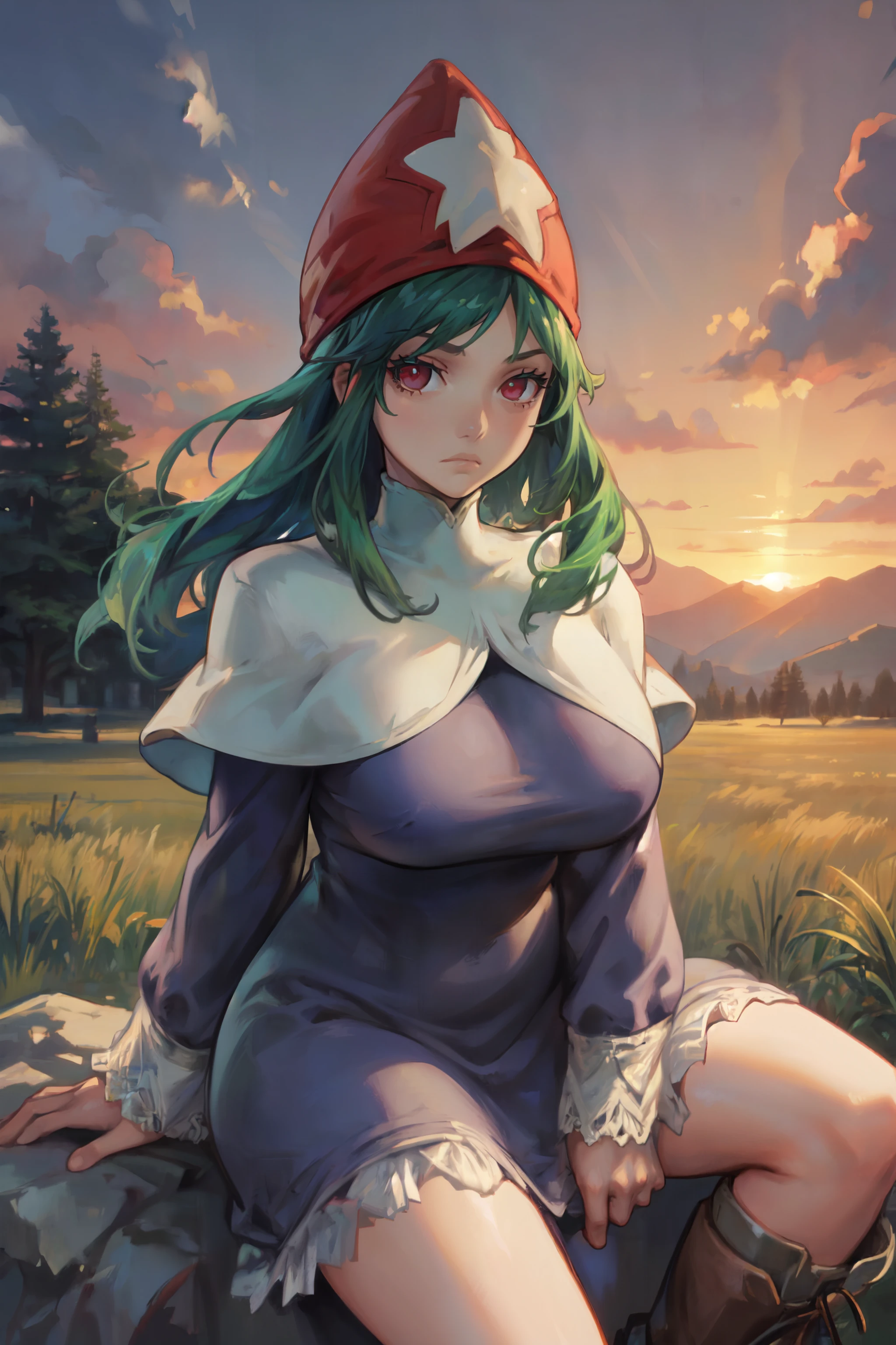 Default Outfit: TimeMageFFT, blonde hair, long hair, sidelocks, hat,((long dress)), capelet, boots,