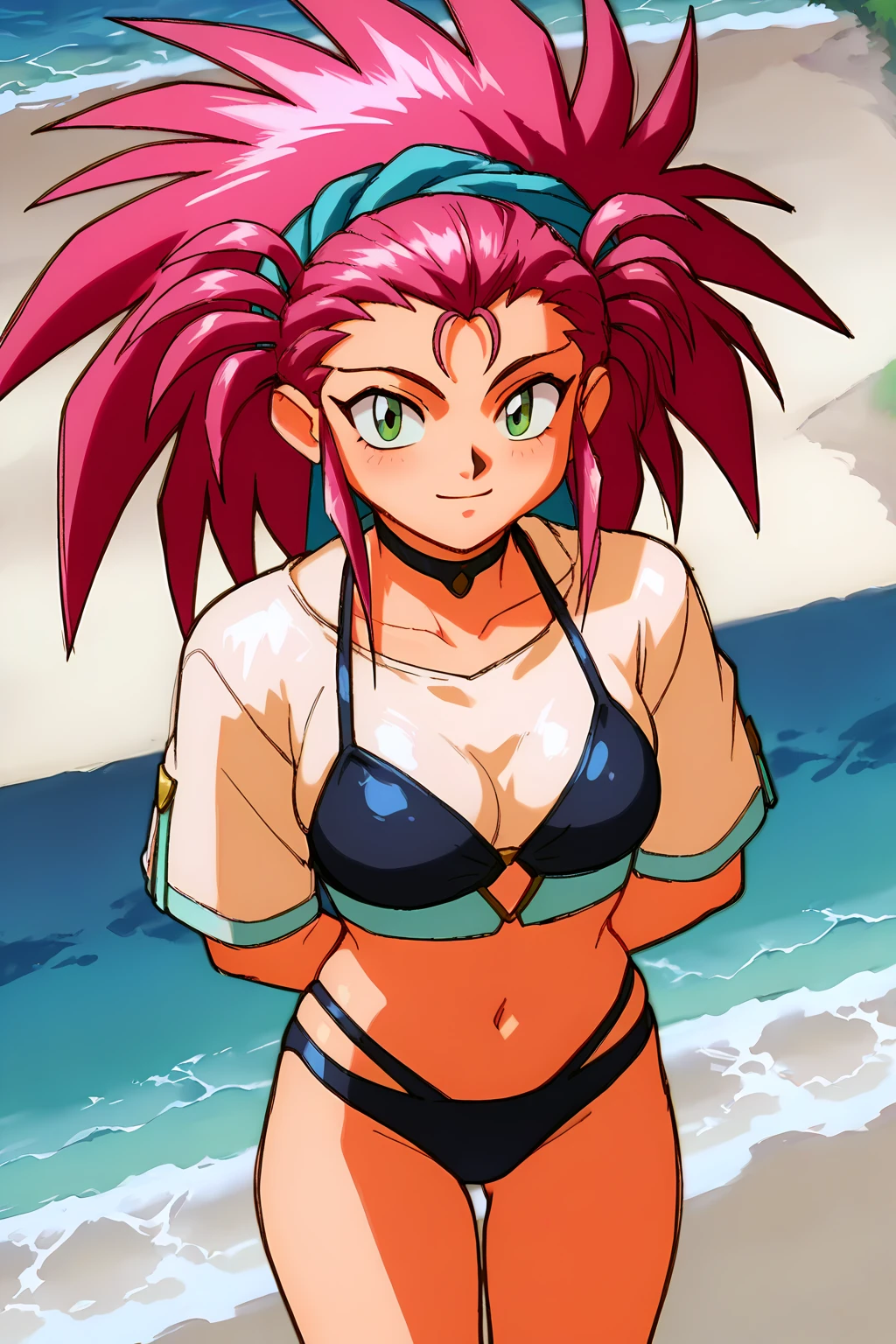 (Try adding palm leaf, floral pattern to negative prompt when generating beach environments if you get undesirable patterns in the background.)