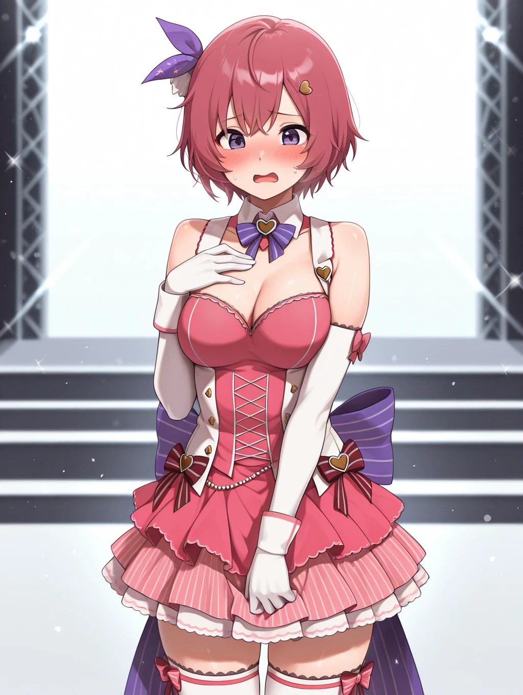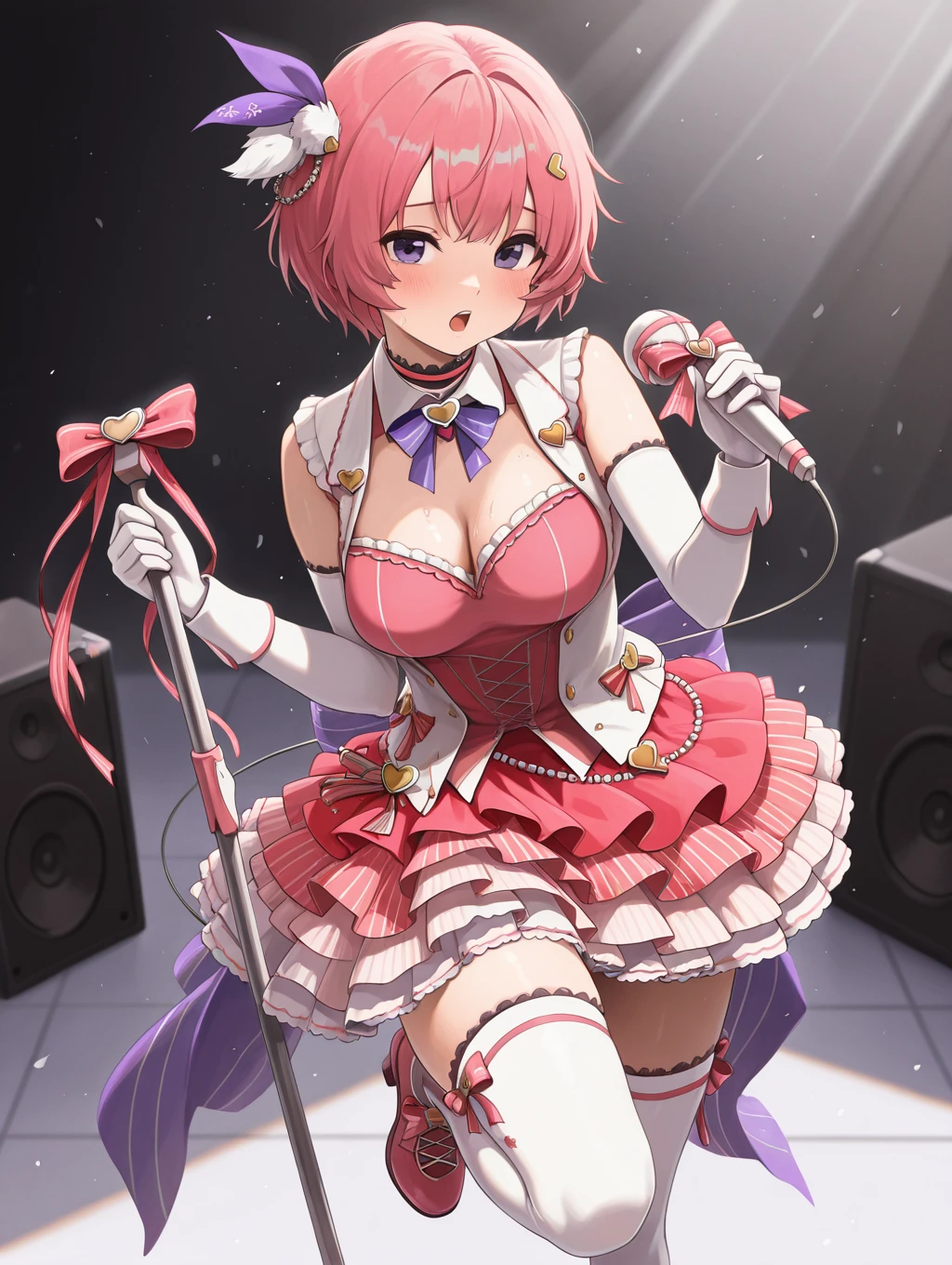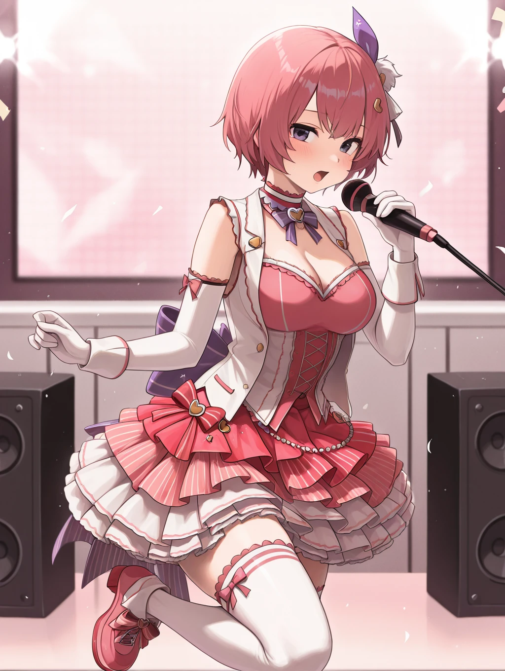 idol_eva, 1girl, solo, short hair, skirt, thighhighs, gloves, bow, standing, pink hair, shoes, elbow gloves, white gloves, white thighhighs, idol clothes,