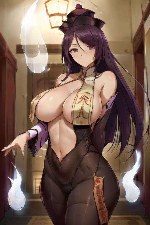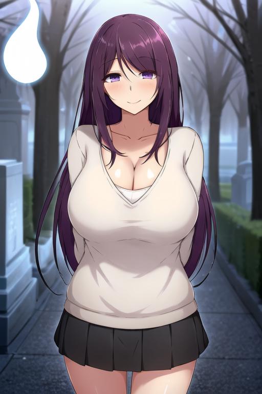 Recommended tags - purple hair, long hair, purple eyes, / ghost, / triangular headpiece,