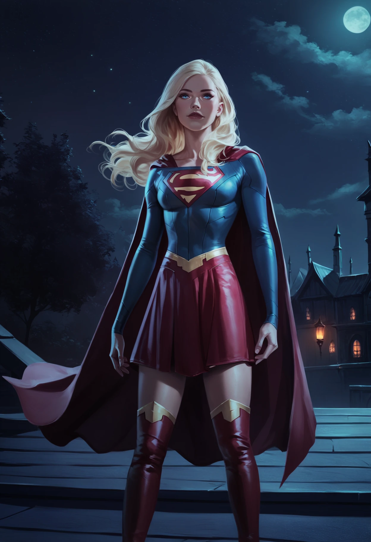 Outfit prompts : bodysuit, long sleeves, red cape, red skirt, red high heels thigh boots