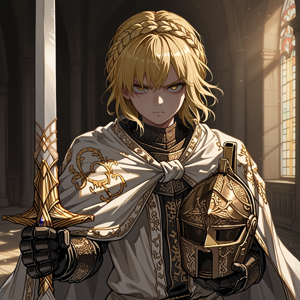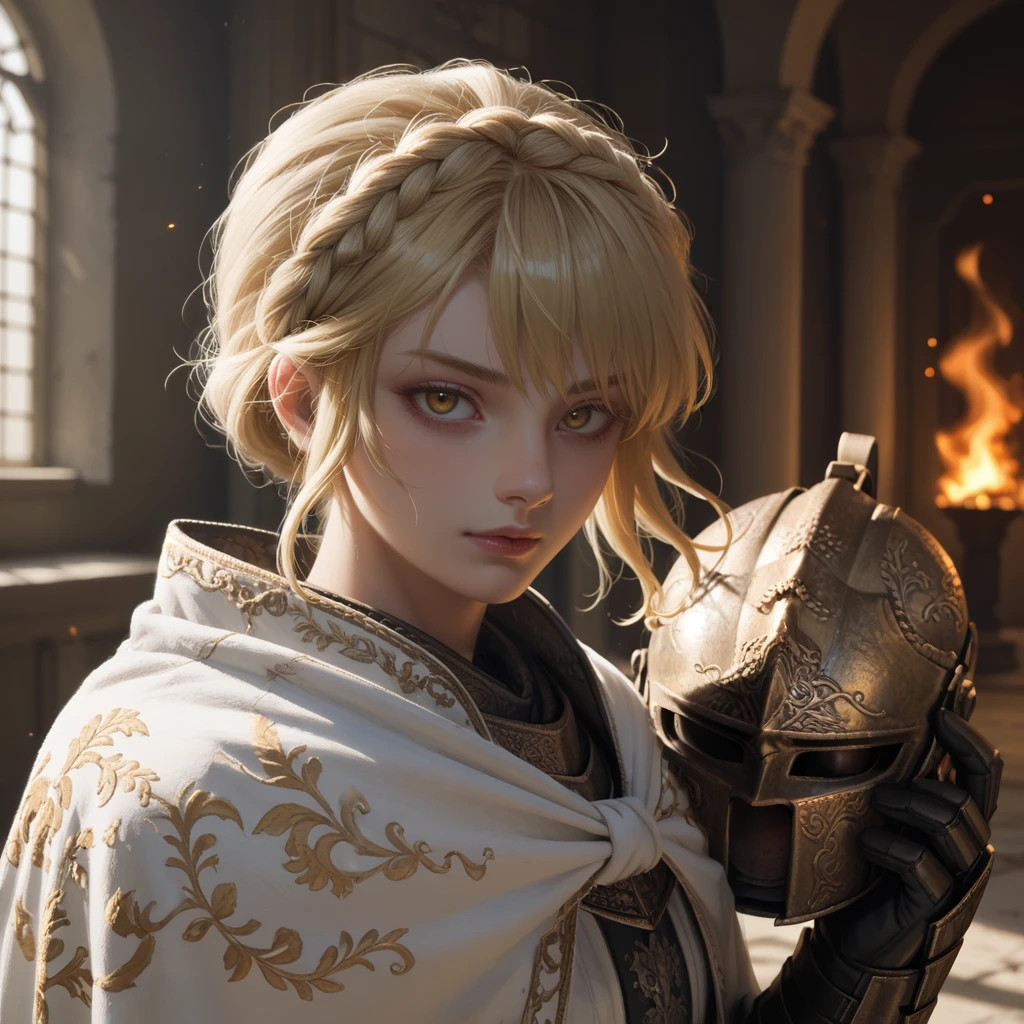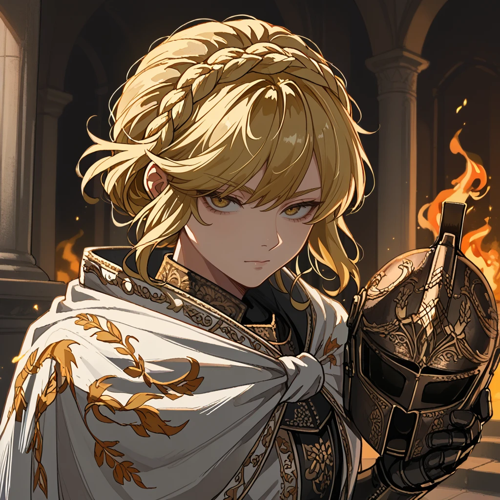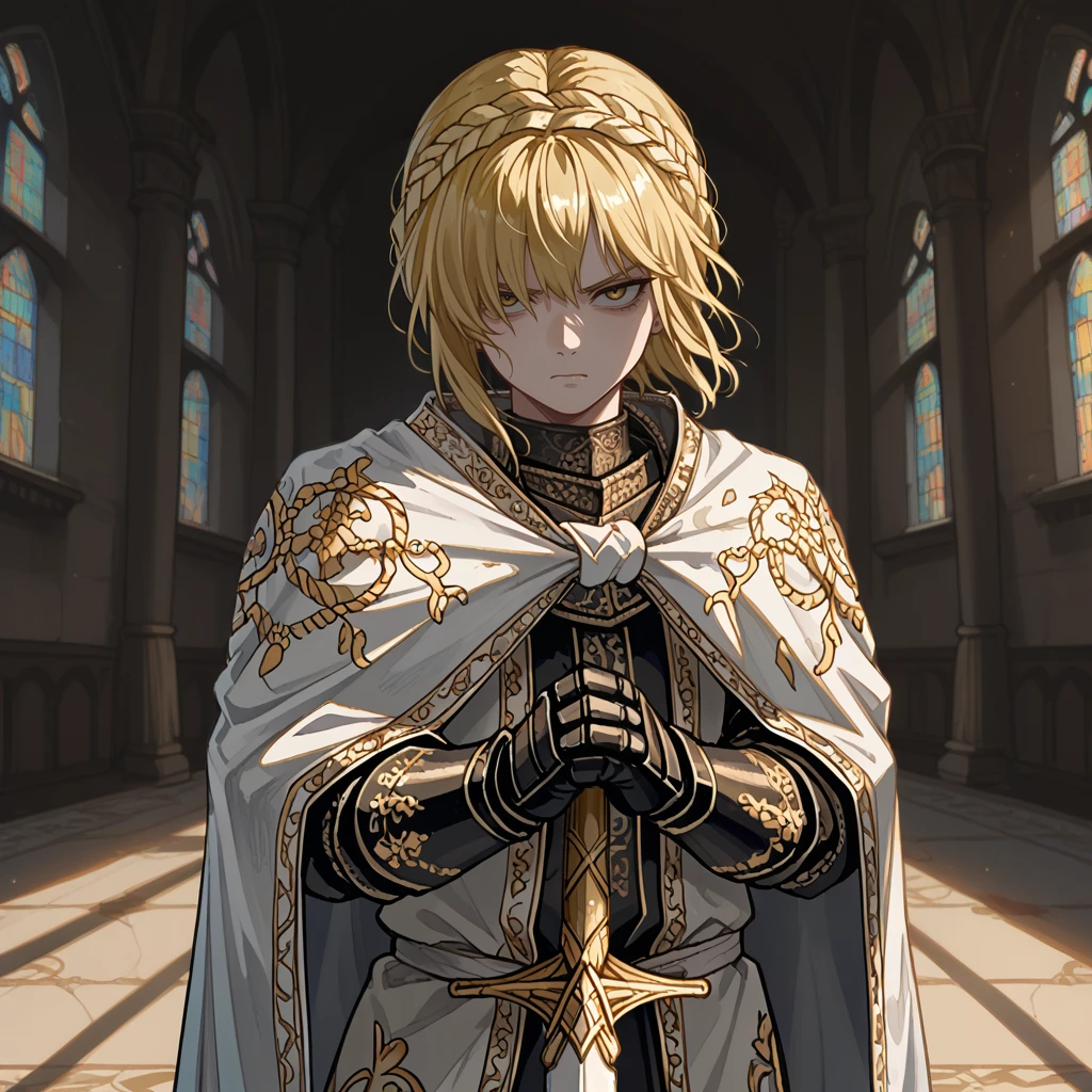 needle knight leda,blonde hair,hair between eyes,medium hair,crown braid,yellow eyes,white cloak,ornate armor,gauntlets,