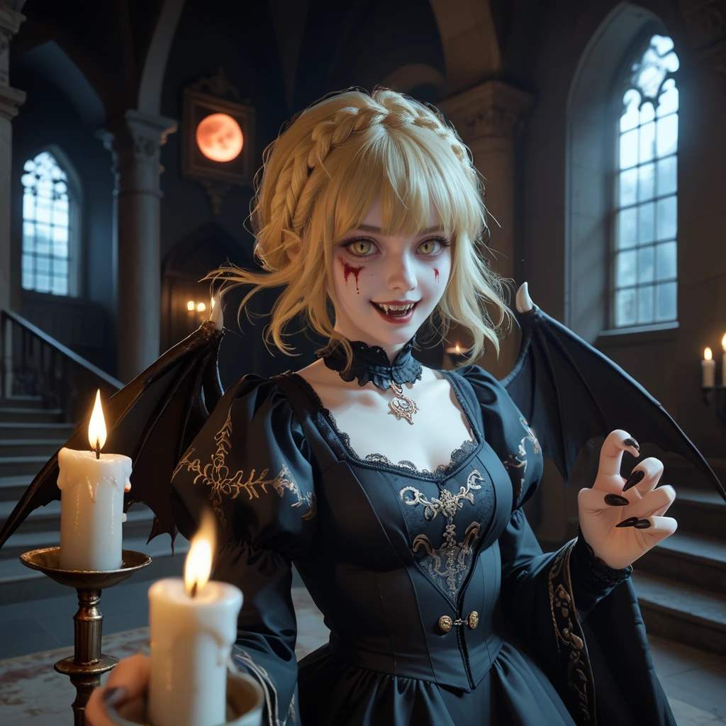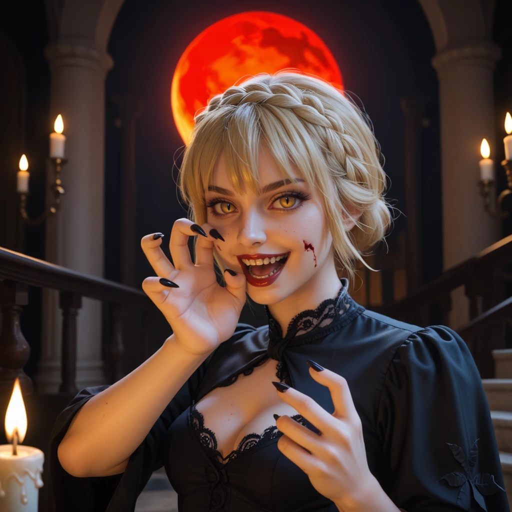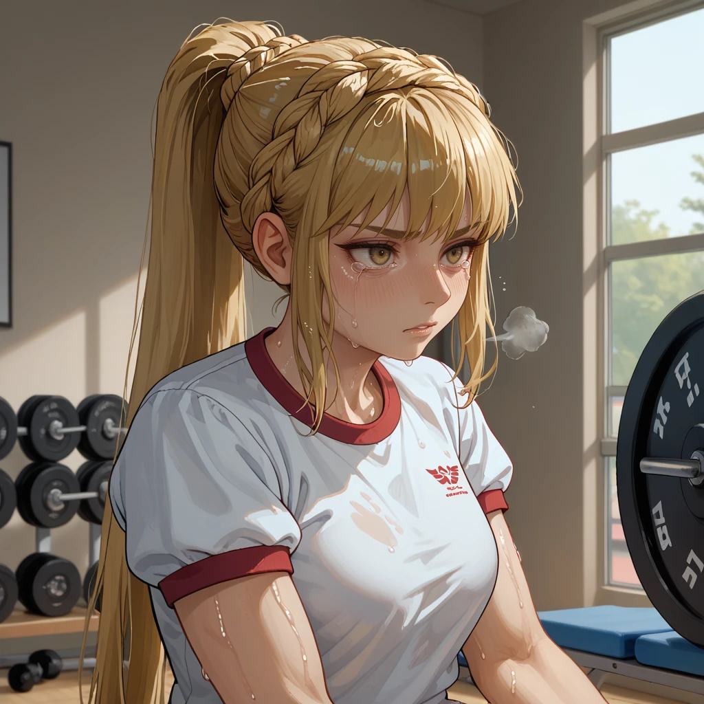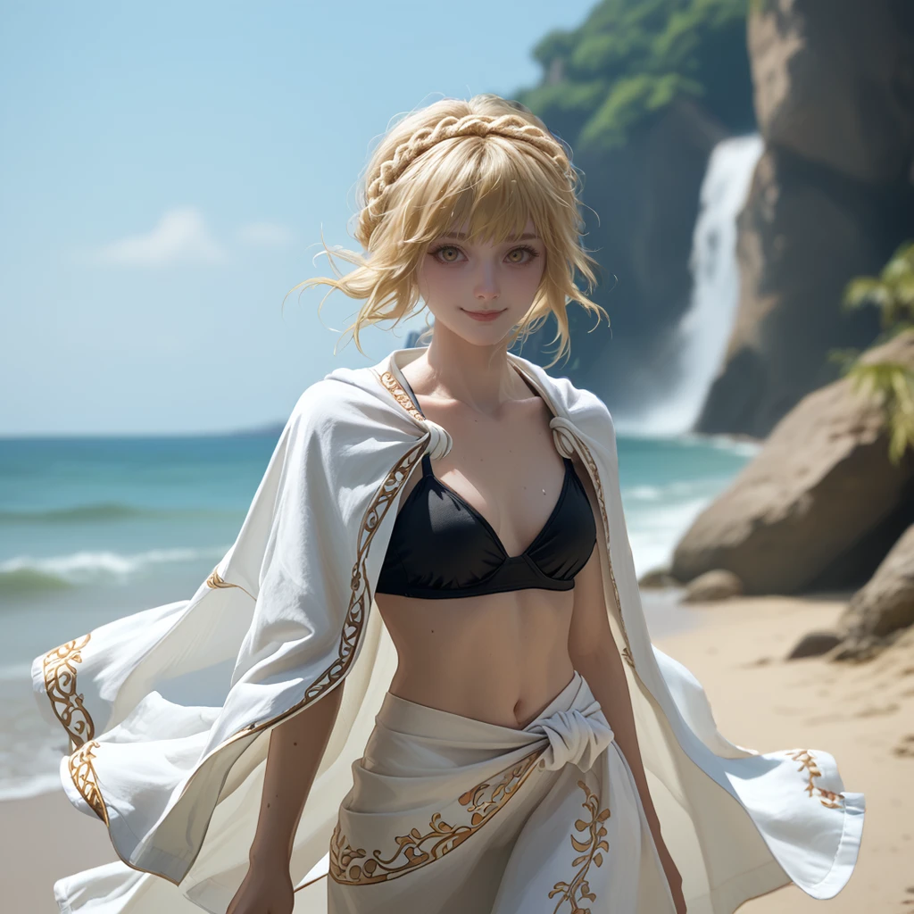 needle knight leda,blonde hair,hair between eyes,medium hair,crown braid,yellow eyes,white cloak,ornate armor,gauntlets,
