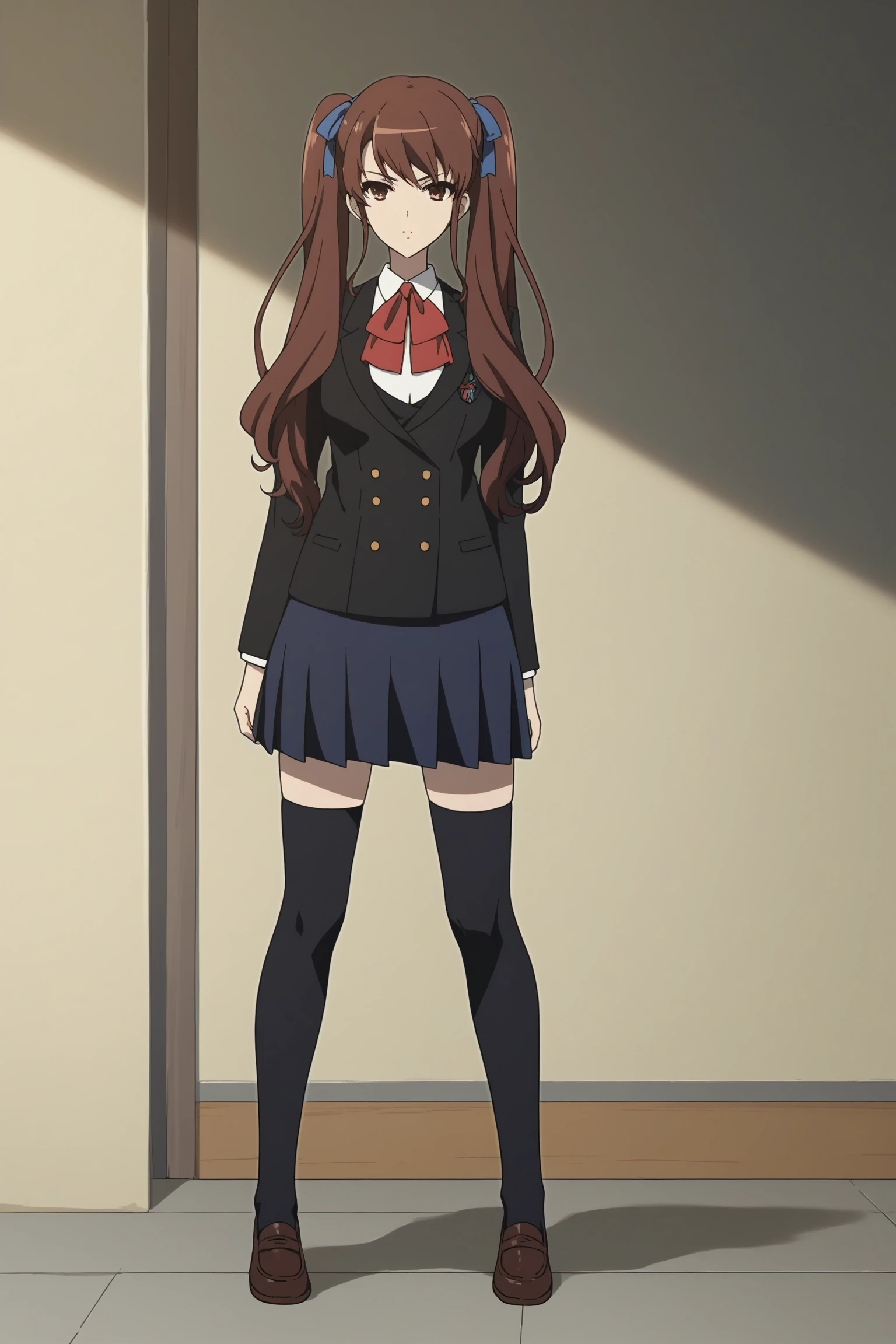 akazawa izumi, brown hair, long hair, twintails, blue hair ribbon, brown eyes, akazawaschoolwin, school uniform, blazer, long sleeves, black jacket, white shirt, collared shirt, red neckerchief, school emblem, blue skirt, pleated skirt, black thighhighs, loafersSchool uniform (summer)