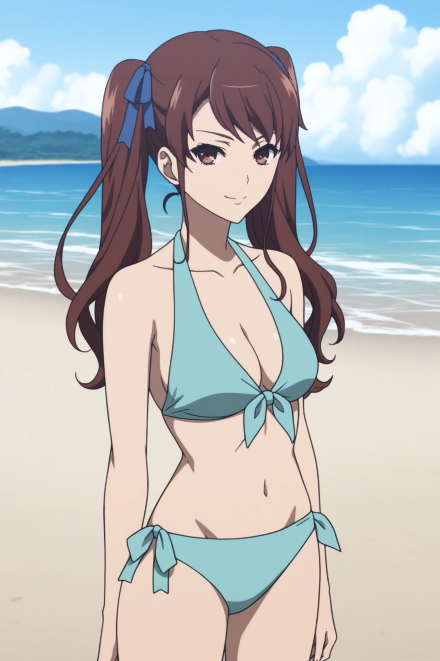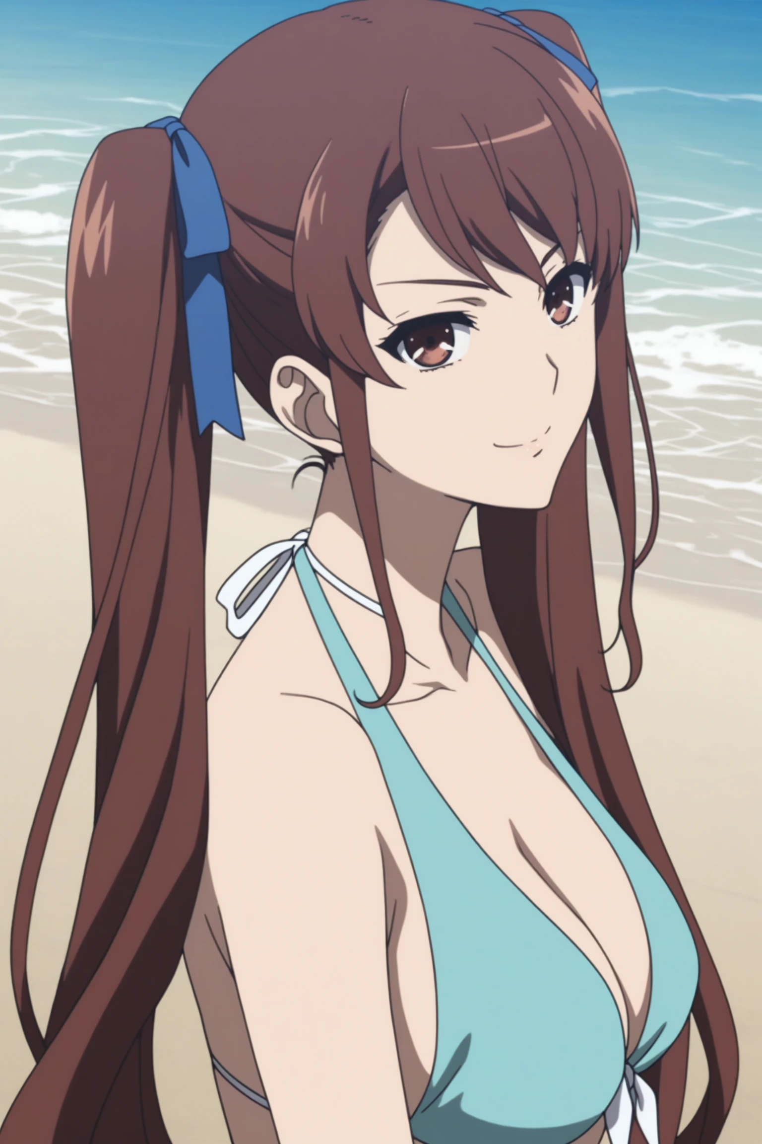 akazawa izumi, brown hair, long hair, twintails, blue hair ribbon, brown eyes, akazawaswim, swimsuit, blue bikiniNOTE