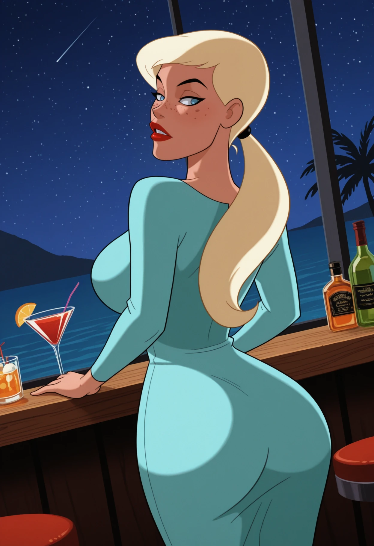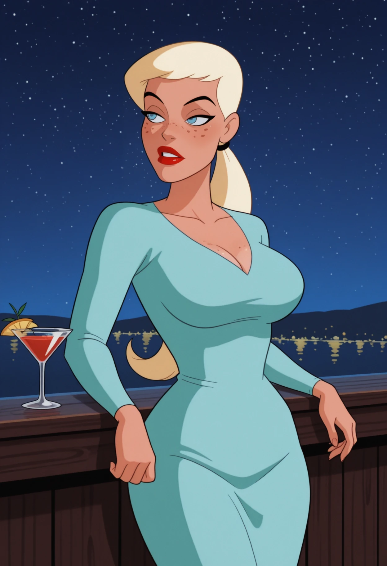 1girl, solo, blue eyes, blonde hair, white hair, long hair, ponytail, low ponytail, hair tie, breasts, large breasts, freckles, lipstick, red lips,