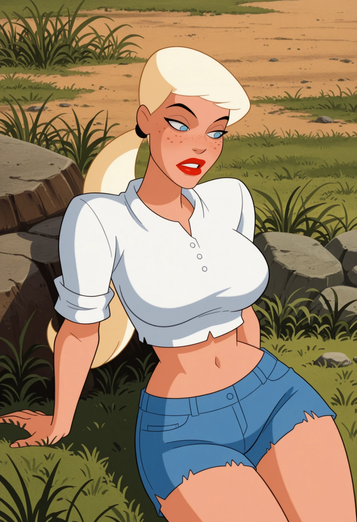 1girl, solo, blue eyes, blonde hair, white hair, long hair, ponytail, low ponytail, hair tie, breasts, large breasts, freckles, lipstick, red lips,outfit tags: