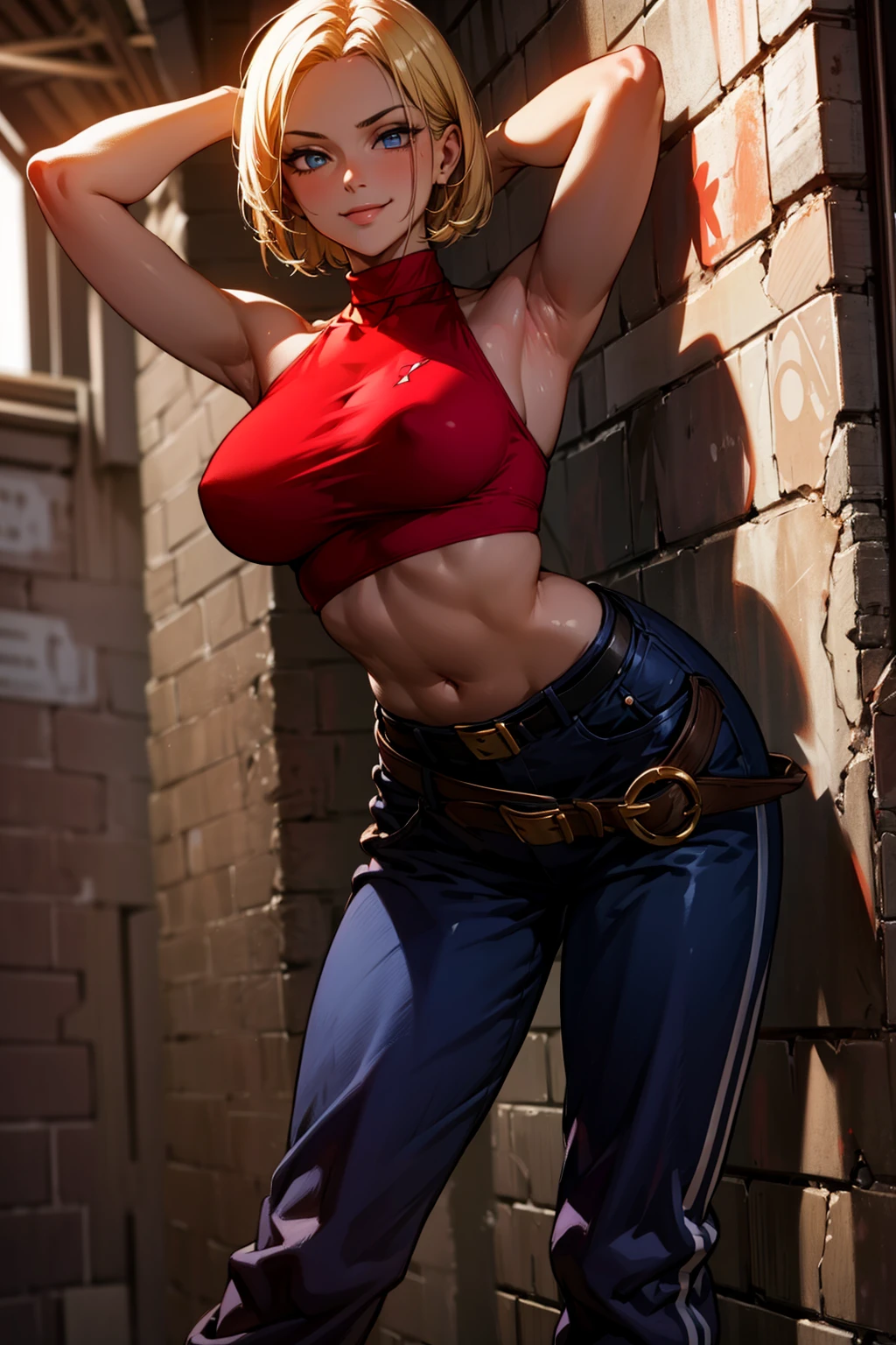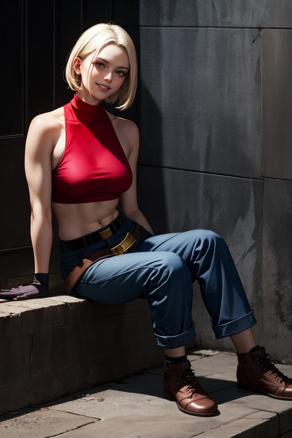 also: blonde hair, red turtleneck, sleeveless tankop, fingerless gloves, black belt, big belt, blue pants, star symbol, boots