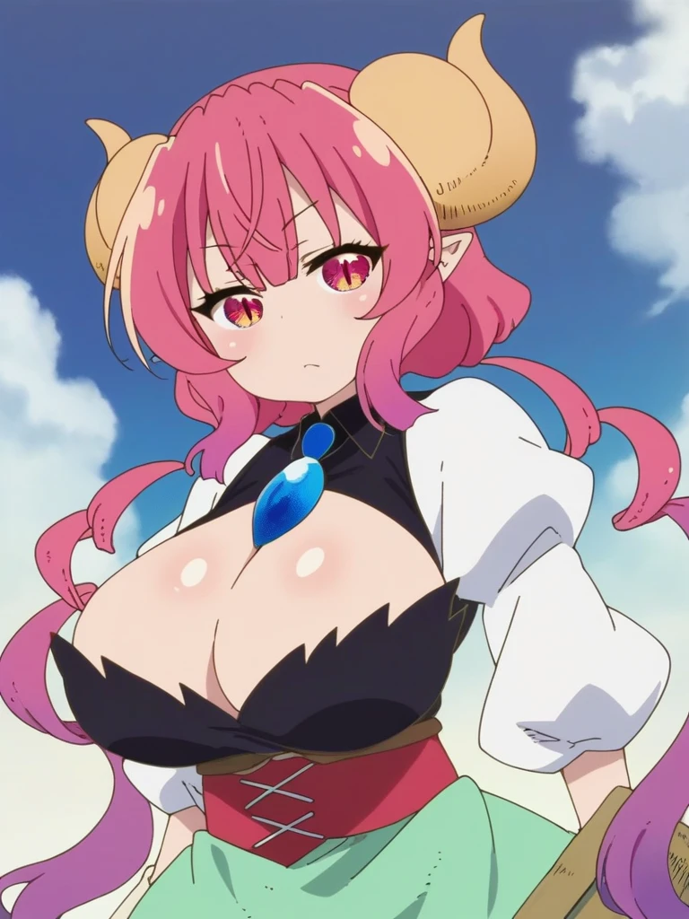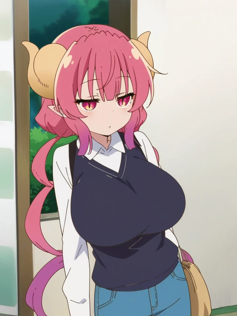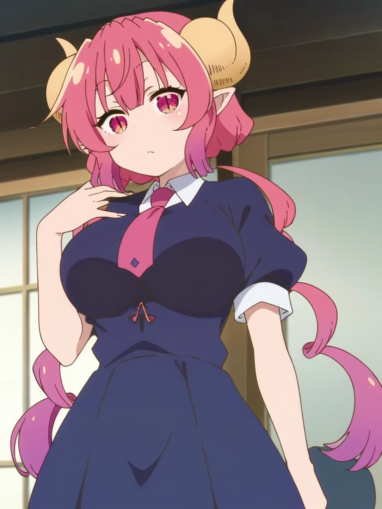 iruru, dragon girl, long hair, pink hair, dragon horns, pointy ears, multicolored hair, red hair, bangs, slit pupils