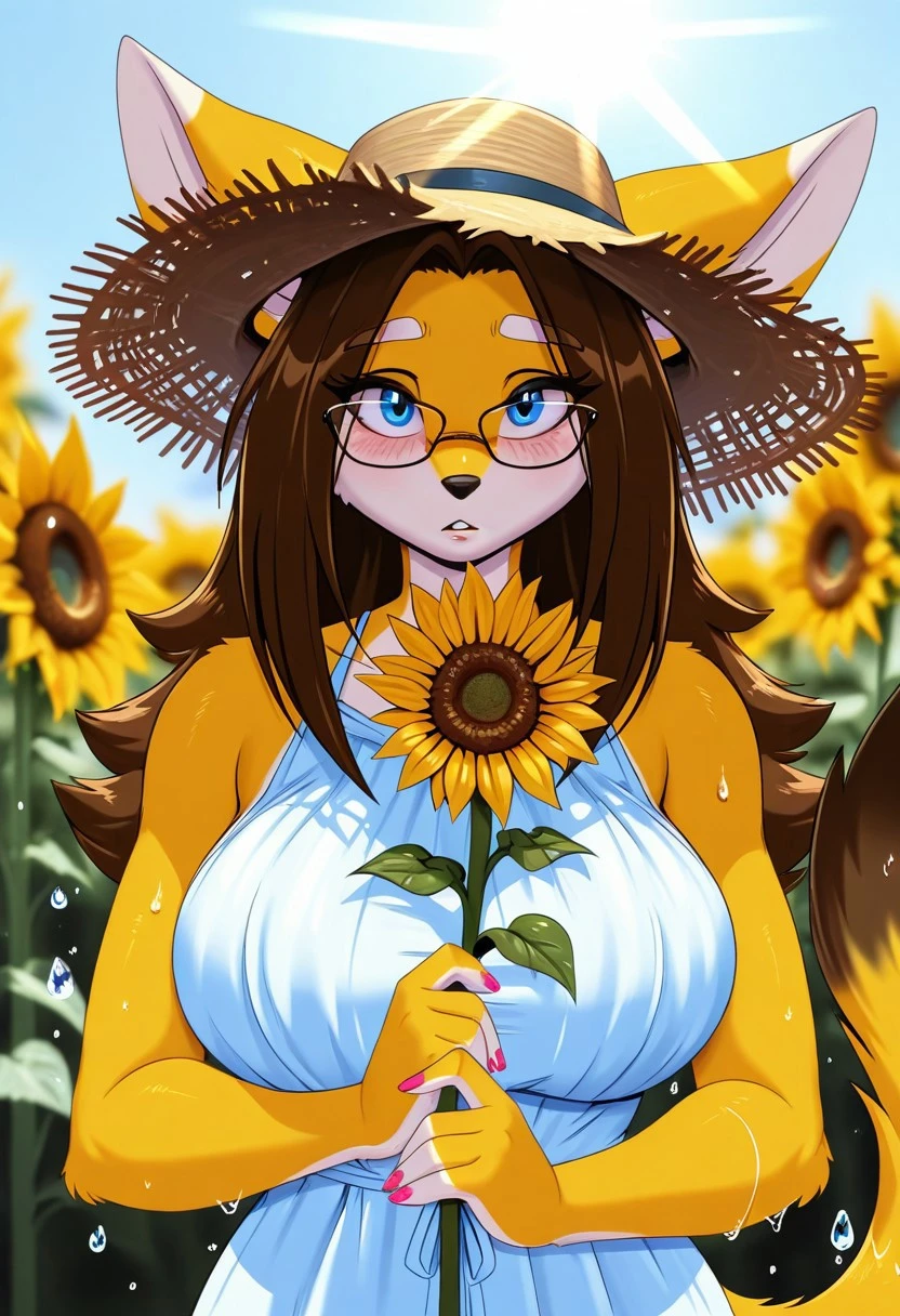 claire_o_sd, 1girl, solo, animal ears, furry, furry female, brown hair, large breasts, tail, blue eyes, animal nose, long hair, fox ears, body fur, yellow fur, fox girl, two-tone fur,