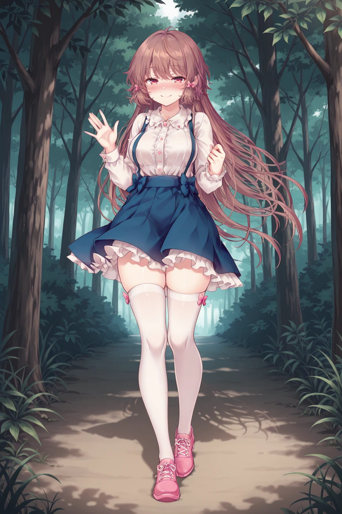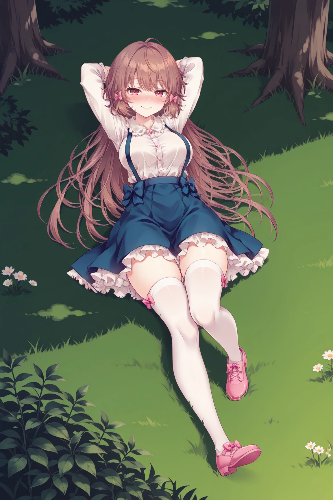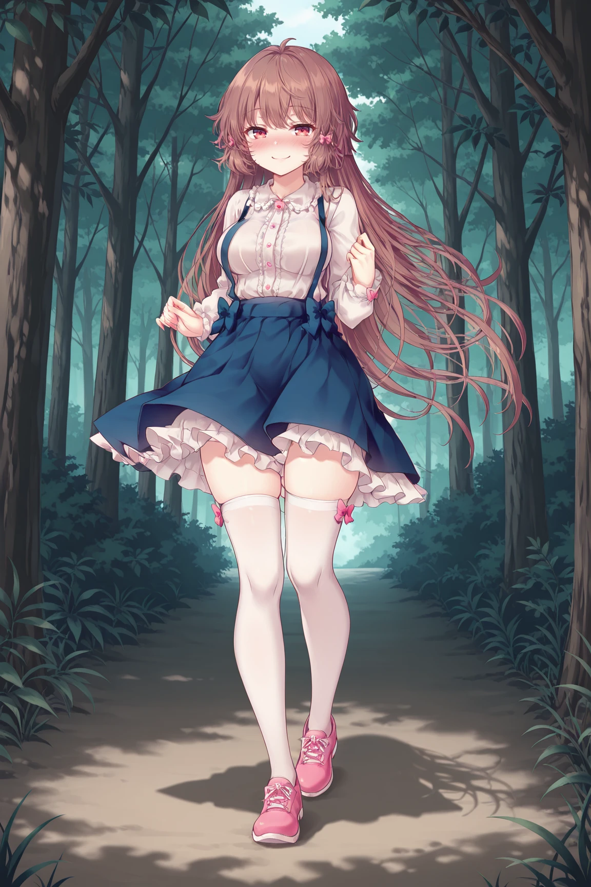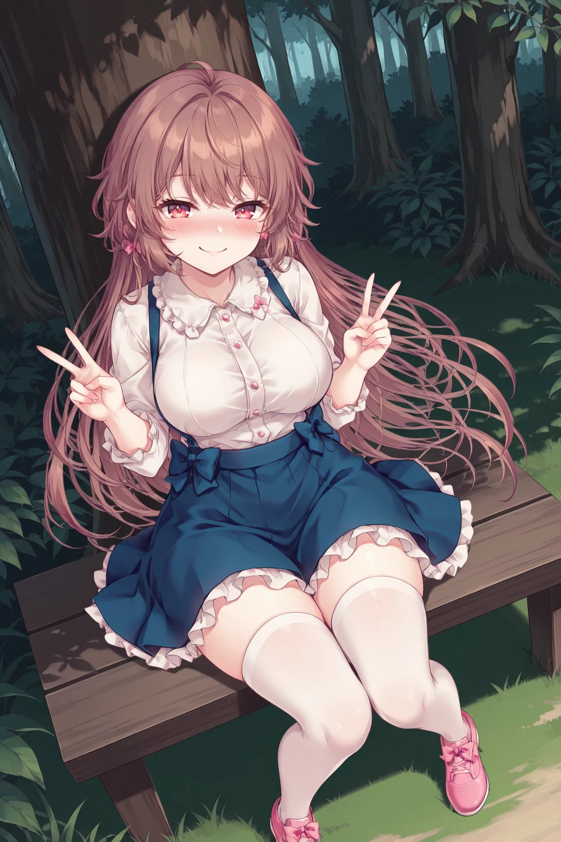 GPMILXL, red eyes, brown hair, long hair, bangs, pink bow hair, large breasts, wide hips, white shirt, suspenders, blue bow, blue skirt, white thighhighs, pink shoes