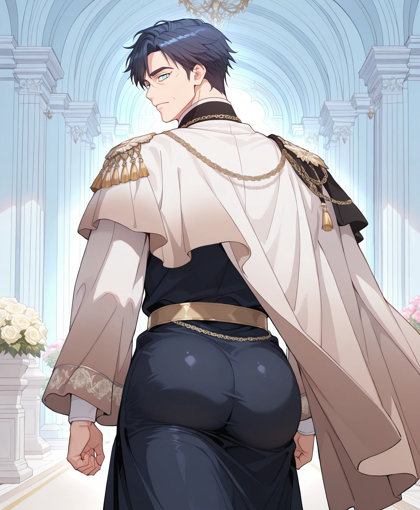 Outfit: ornate royal outfit,pastel blue brocade coat,black high collar tunic,gold chains and epaulette,white cape,