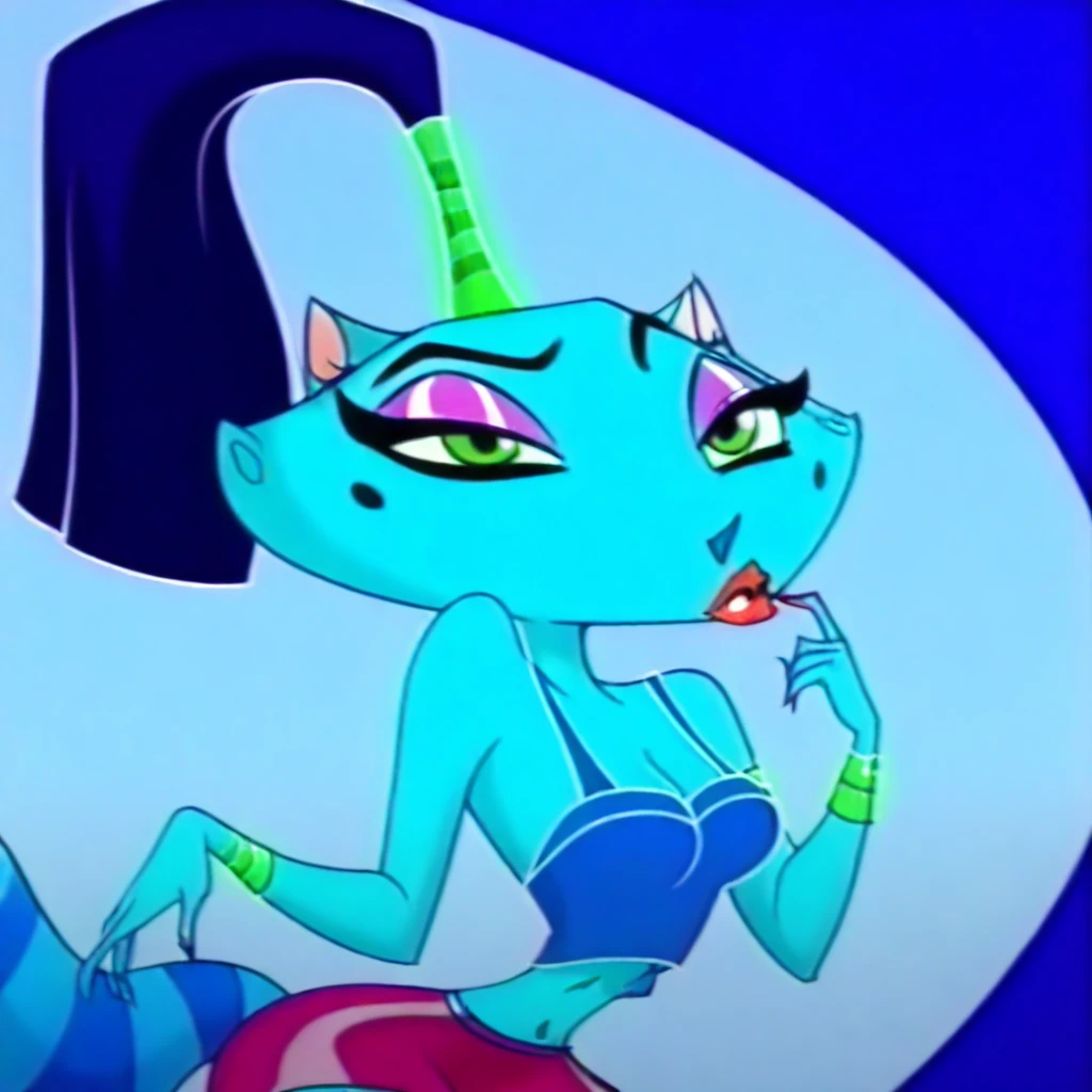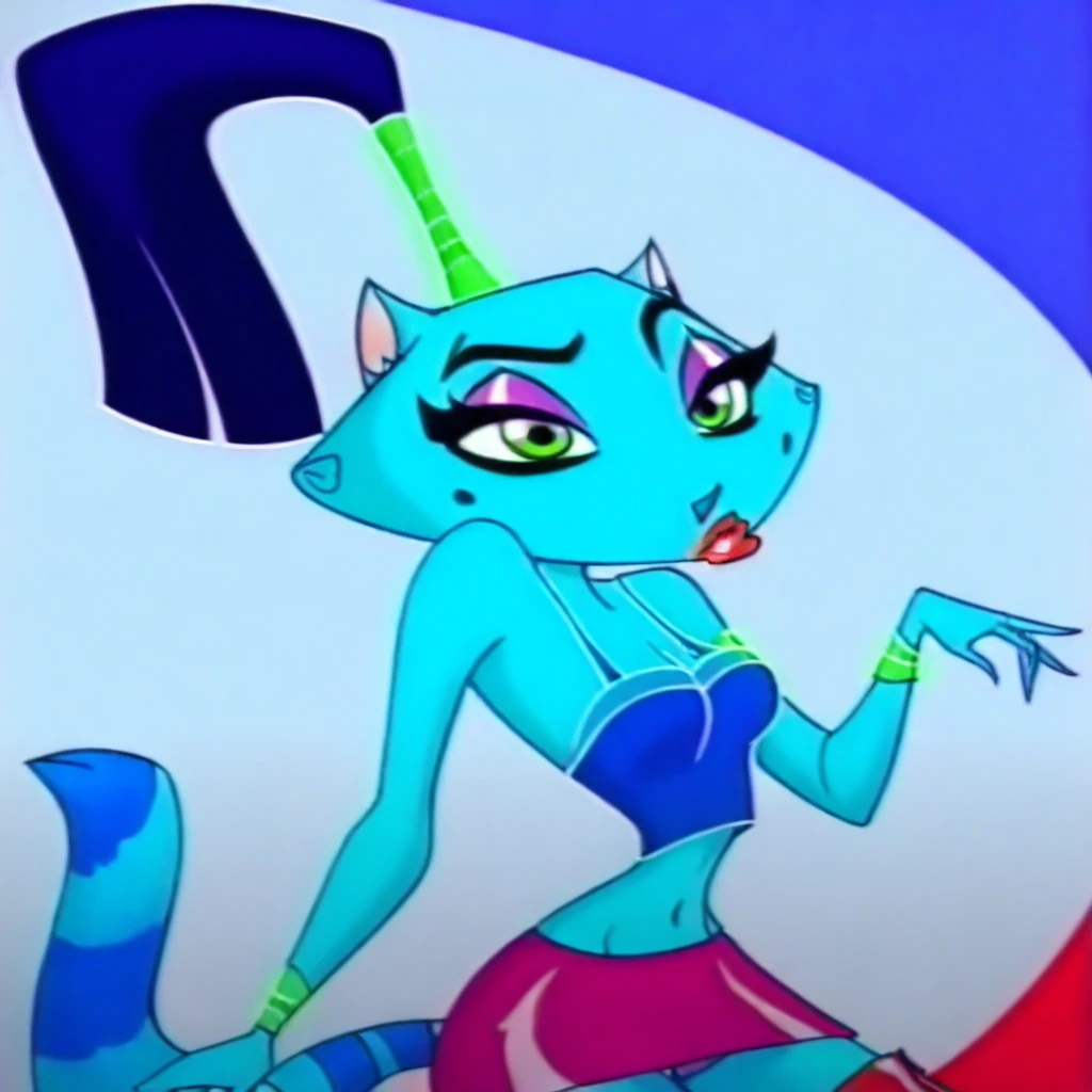 PussinBootsESC, 1girl, solo, cat girl, furry female, anthro, colored skin, blue skin, high ponytail, cat ears, green eyes, eyeshadow, lips, red lipstick, makeup, bare shoulders, large breast, cleavage, blue crop top, navel, midriff, groin, magenta short skirt, large butt, thick thighs, red over the knee boots, high heels, bracelets, striped fluffy cat tail,