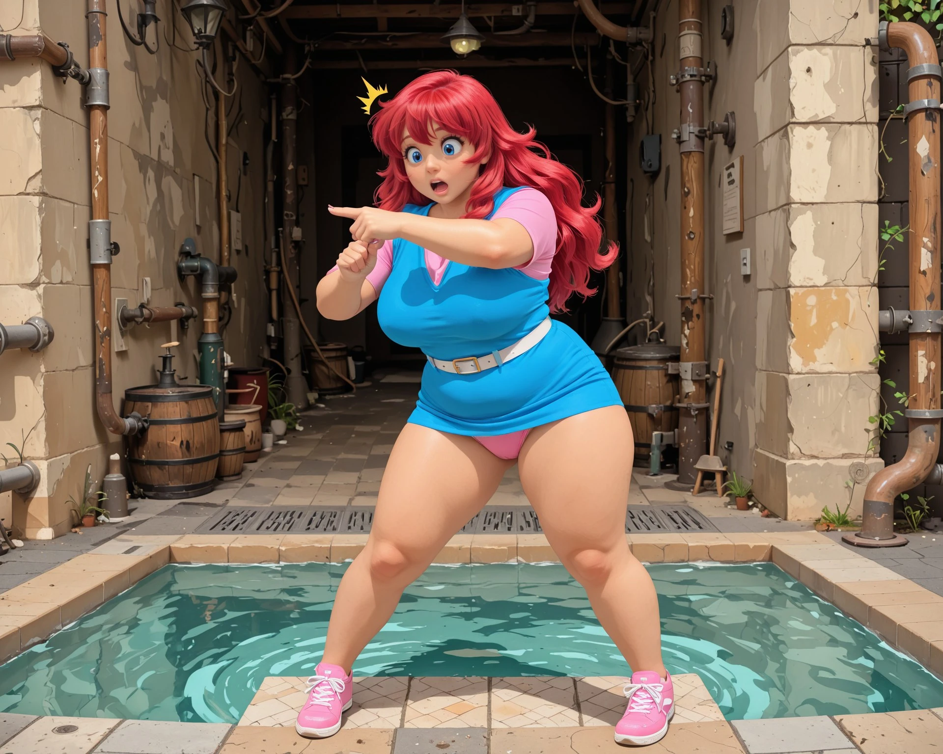 Her features: red hair, long hair, big eyes, blue eyes, chubby, thick thighs