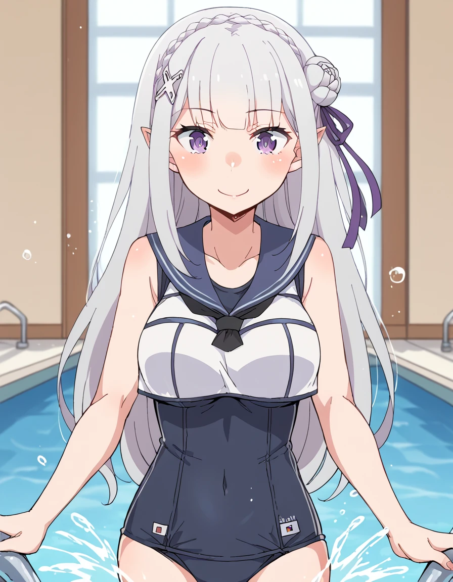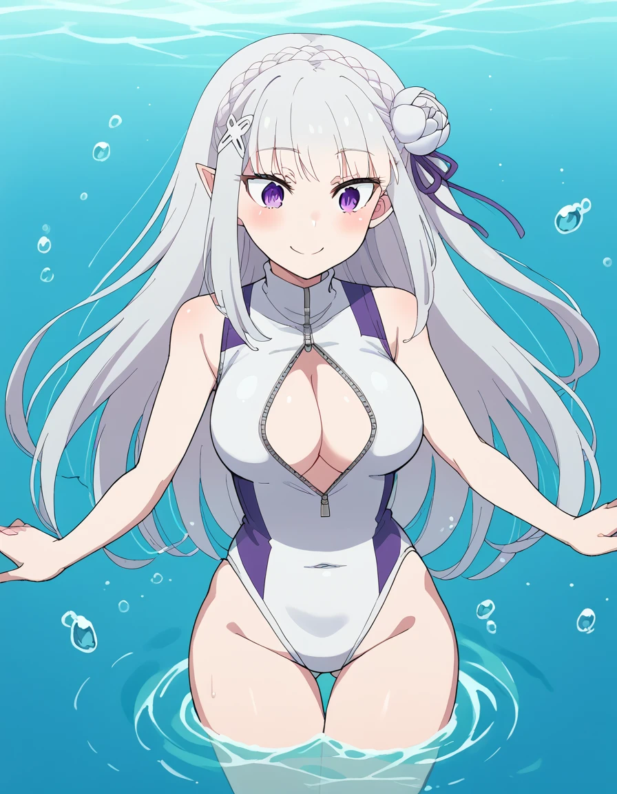 emilia, braid, crown braid, flower, hair flower, hair ornament, hair ribbon, long hair, pointy ears, purple eyes, white hair, x hair ornament, large breasts,