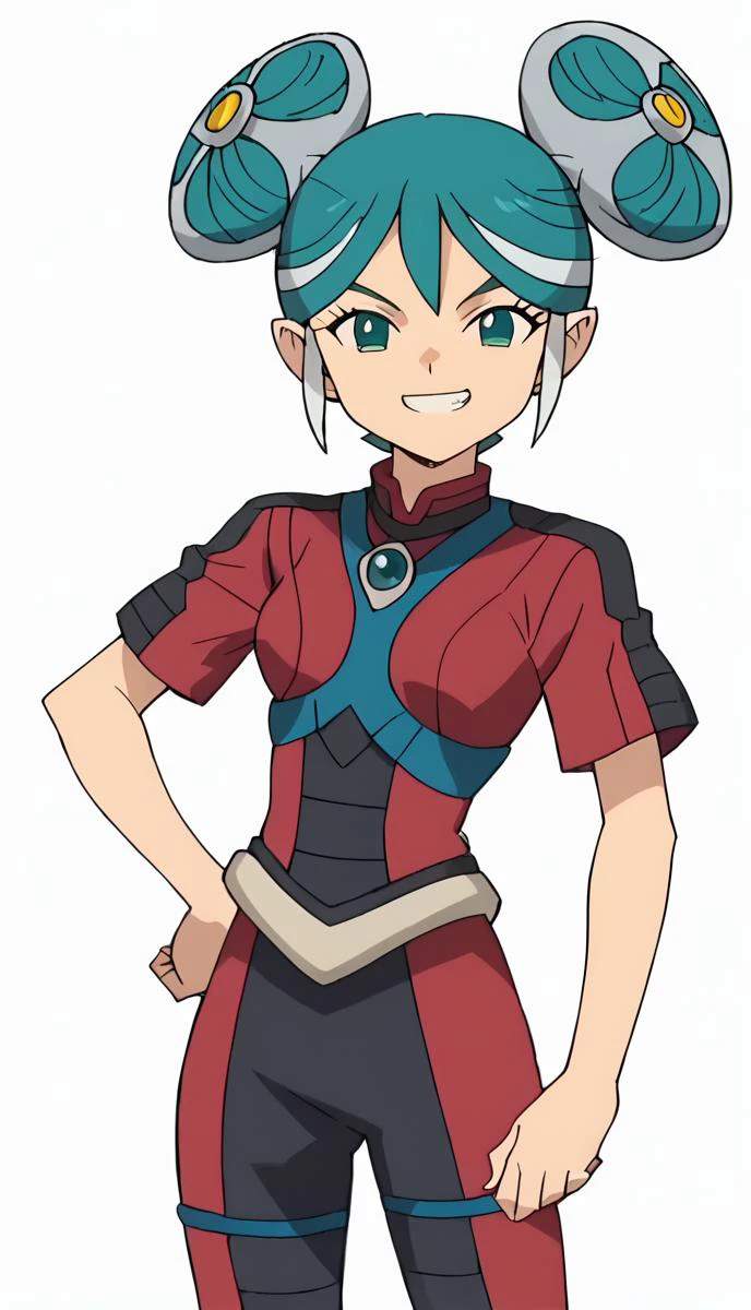 1girl, maquia, two-tone hair, aqua hair, aqua eyes, no pupils, red bodysuit, short sleeves