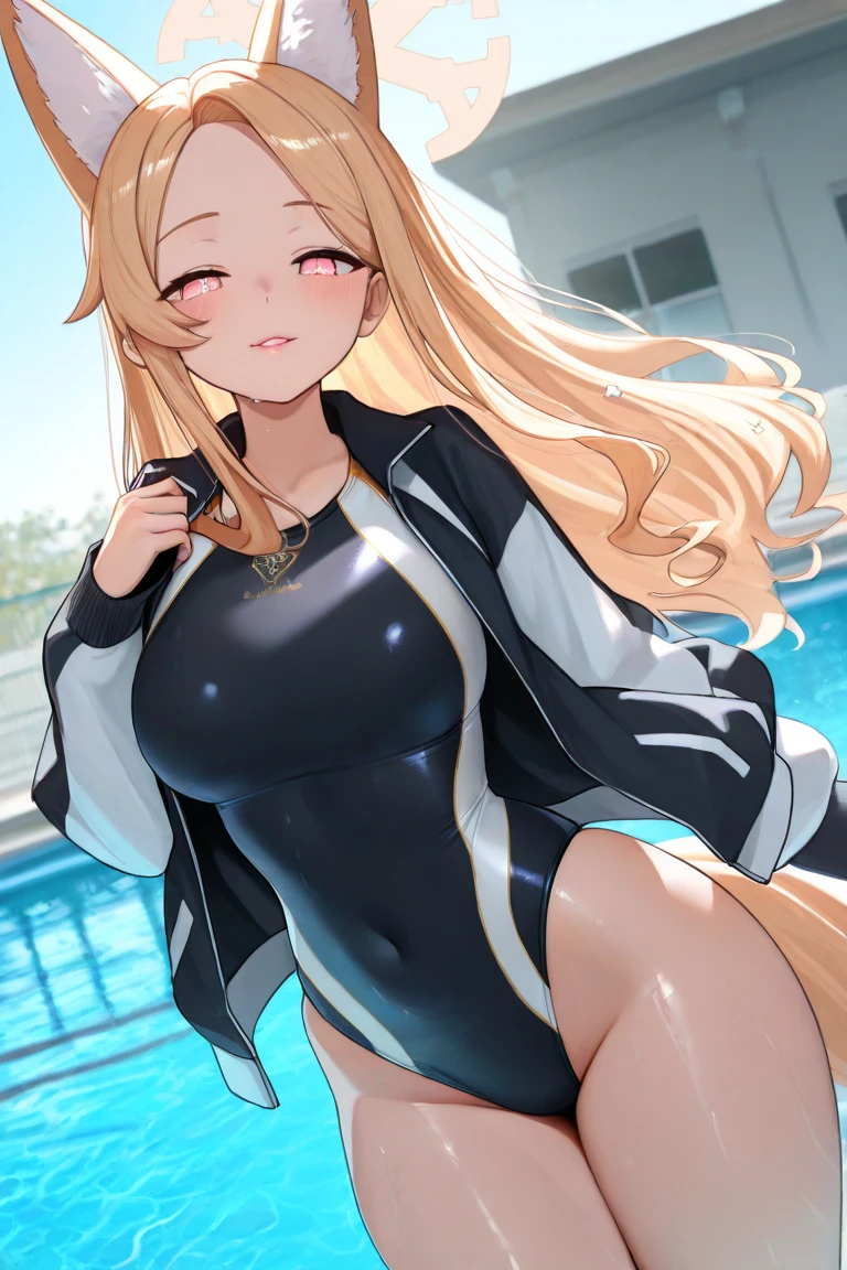 Seia_TrinitySw, blonde hair, long hair, parted bangs, sidelocks, pink eyes, halo, fox girl, extra ears, fox ears, animal ear fluff, fox tail, black one-piece swimsuit, competition swimsuit, covered navel,