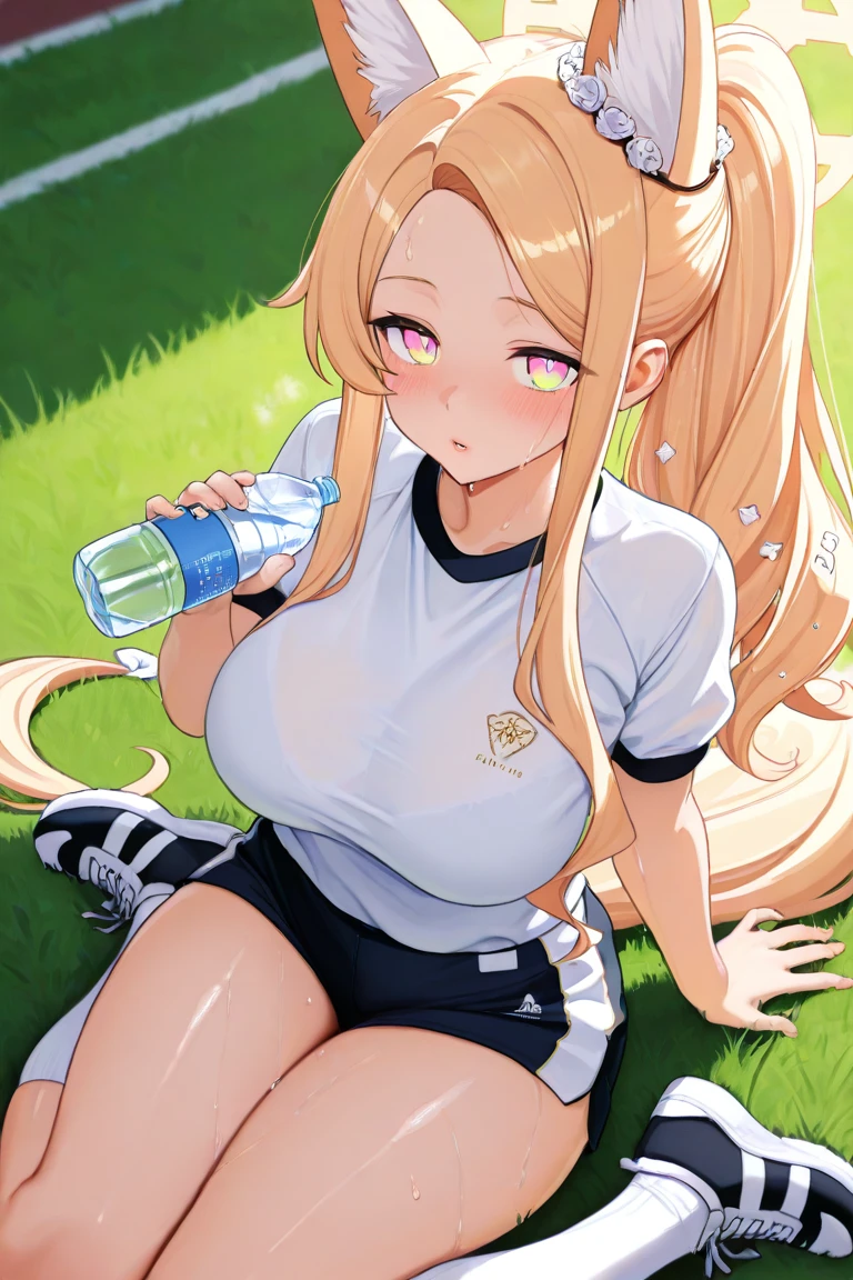 Seia_Sports,blonde hair, long hair, parted bangs, ponytail, sidelocks, pink eyes, halo,fox girl, extra ears, fox ears, animal ear fluff, fox tail,gym uniform, track jacket, black jacket, long sleeves, open jacket,white shirt, short sleeves,blue shorts,black footwear, sneakers,Trinity Swimsuit: