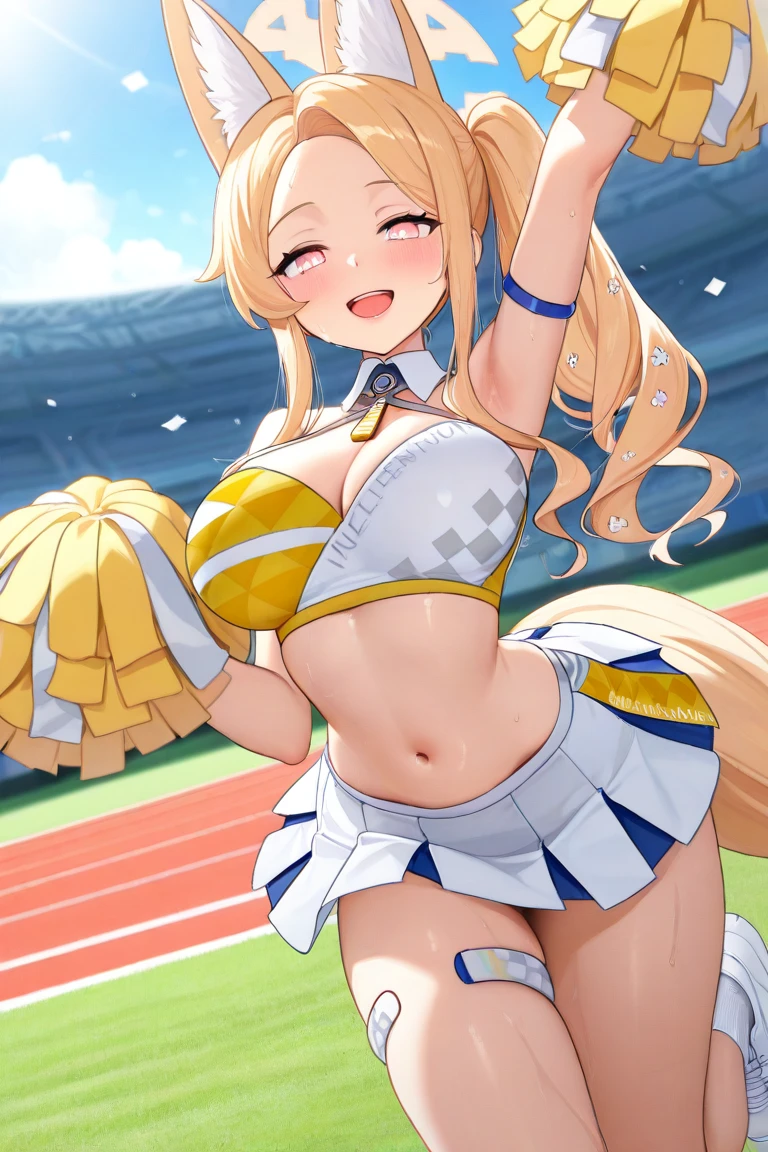 Seia_Cheerleader,blonde hair, long hair, side ponytail, sidelocks, pink eyes, yellow halo,fox girl, extra ears, fox ears, animal ear fluff, fox tail,cheerleader, yellow crop top, miniskirt, pleated skirt, yellow skirt, white skirt,sneakers, white footwear,Optional: