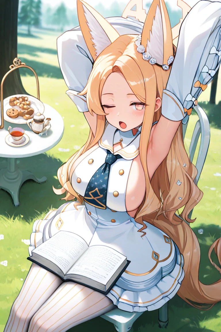 Seia_Base, blonde hair, long hair, parted bangs, sidelocks, pink eyes, halo, fox girl, extra ears, fox ears, animal ear fluff, fox tail, white dress, frilled dress, sleeveless dress, long sleeves, detached sleeves, sleeves past fingers, puffy long sleeves, sailor collar, short necktie, white pantyhose, striped pantyhose, white footwear, high heels, hair ornament, hair flower,