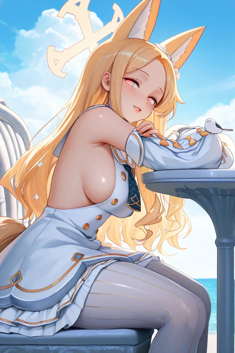 Seia_Base,blonde hair, long hair, parted bangs, sidelocks, pink eyes, halo,fox girl, extra ears, fox ears, animal ear fluff, fox tail,white dress, frilled dress, sleeveless dress, long sleeves, detached sleeves, sleeves past fingers, puffy long sleeves,sailor collar, short necktie,white pantyhose, striped pantyhose,white footwear, high heels,hair ornament, hair flower,Swimsuit: