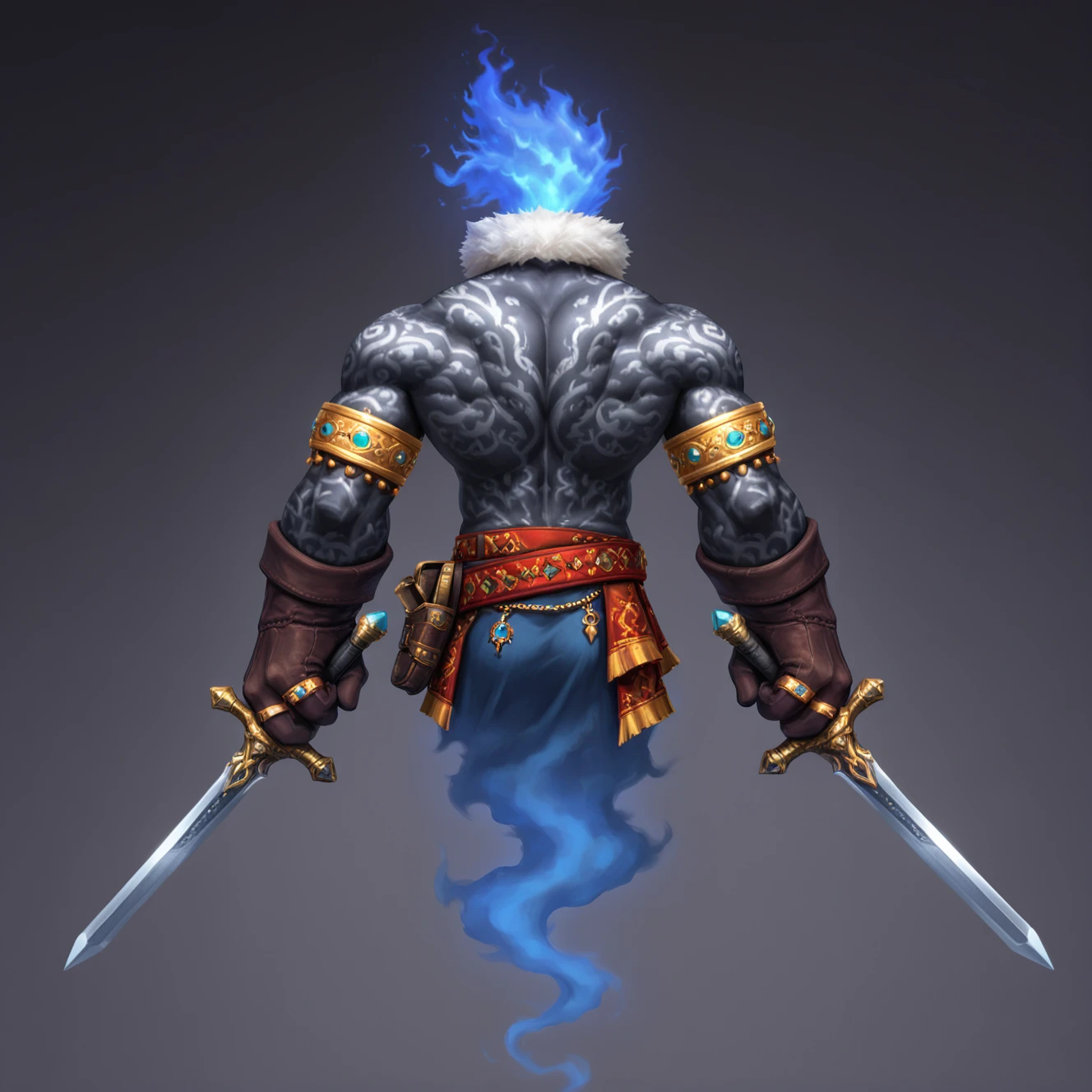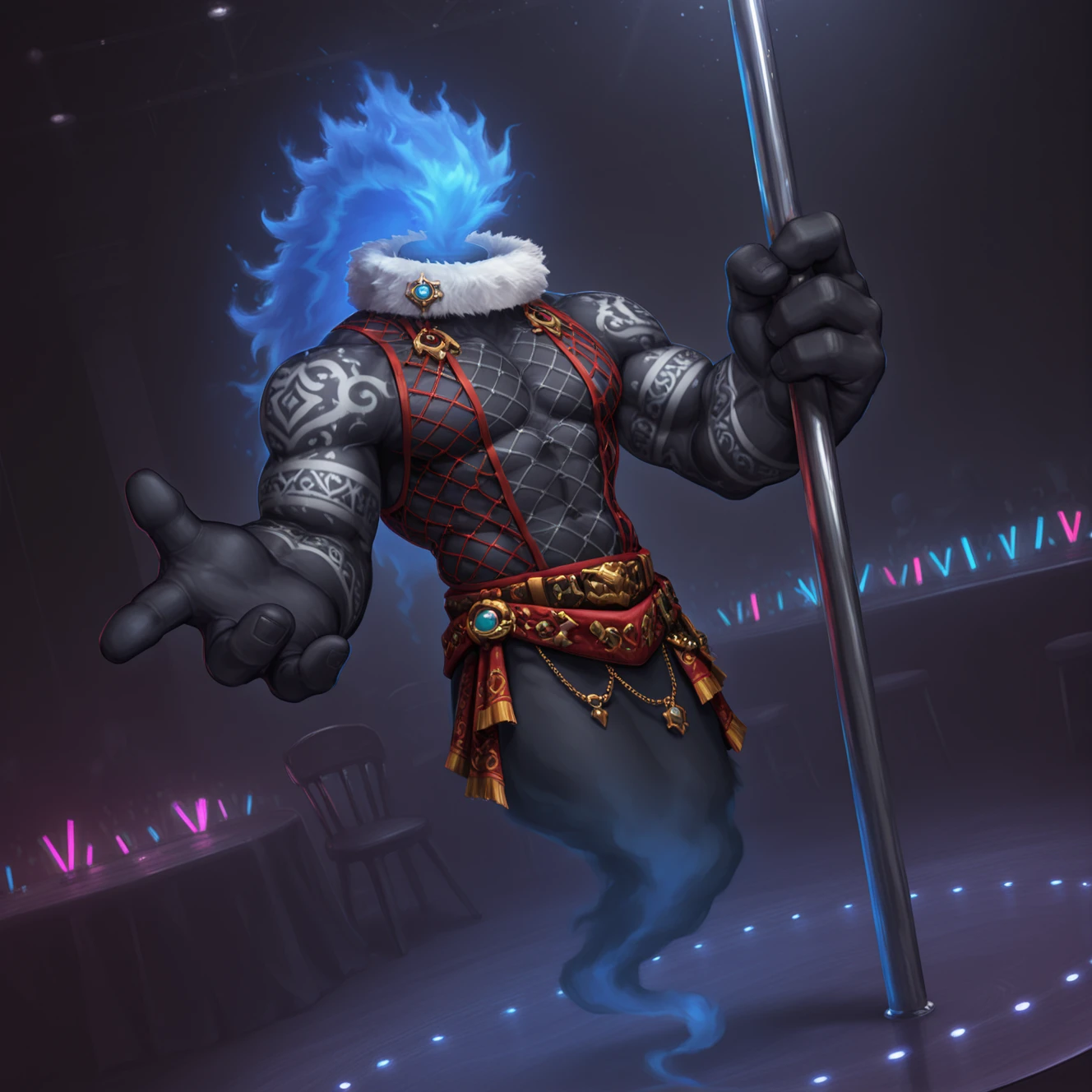 dj1n_h0mmV, shaded, not furry, solo, ghost, genie, flaming hair, blue hair, navel, , , muscular male, black body, black skin, white tattoo, full body tattoo, ornament, headless, head feathers, blue feather hair, white collar, fur collar, 5 fingers