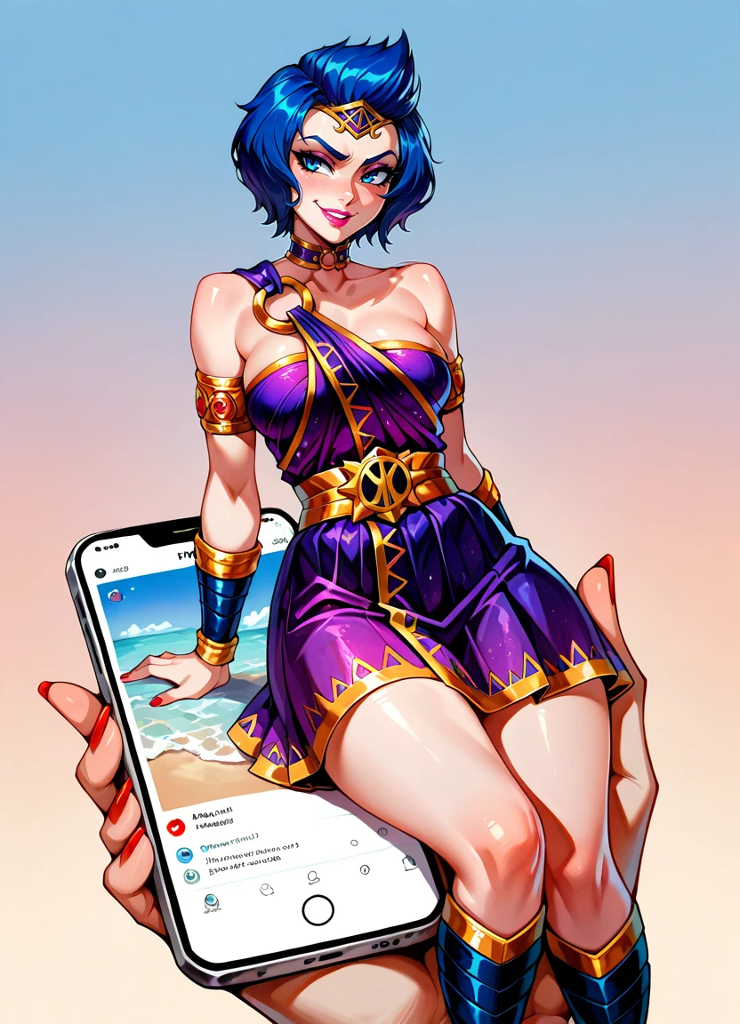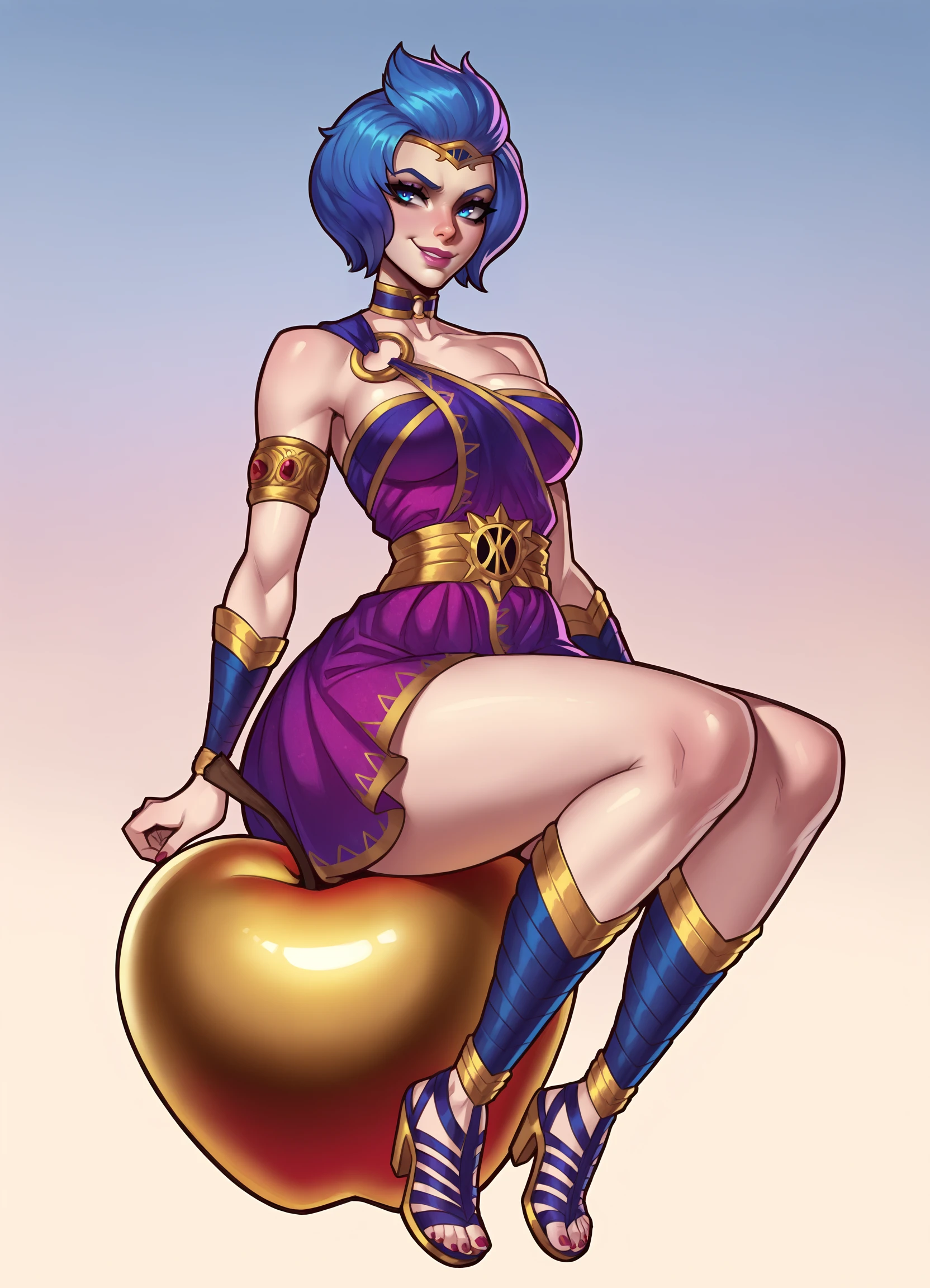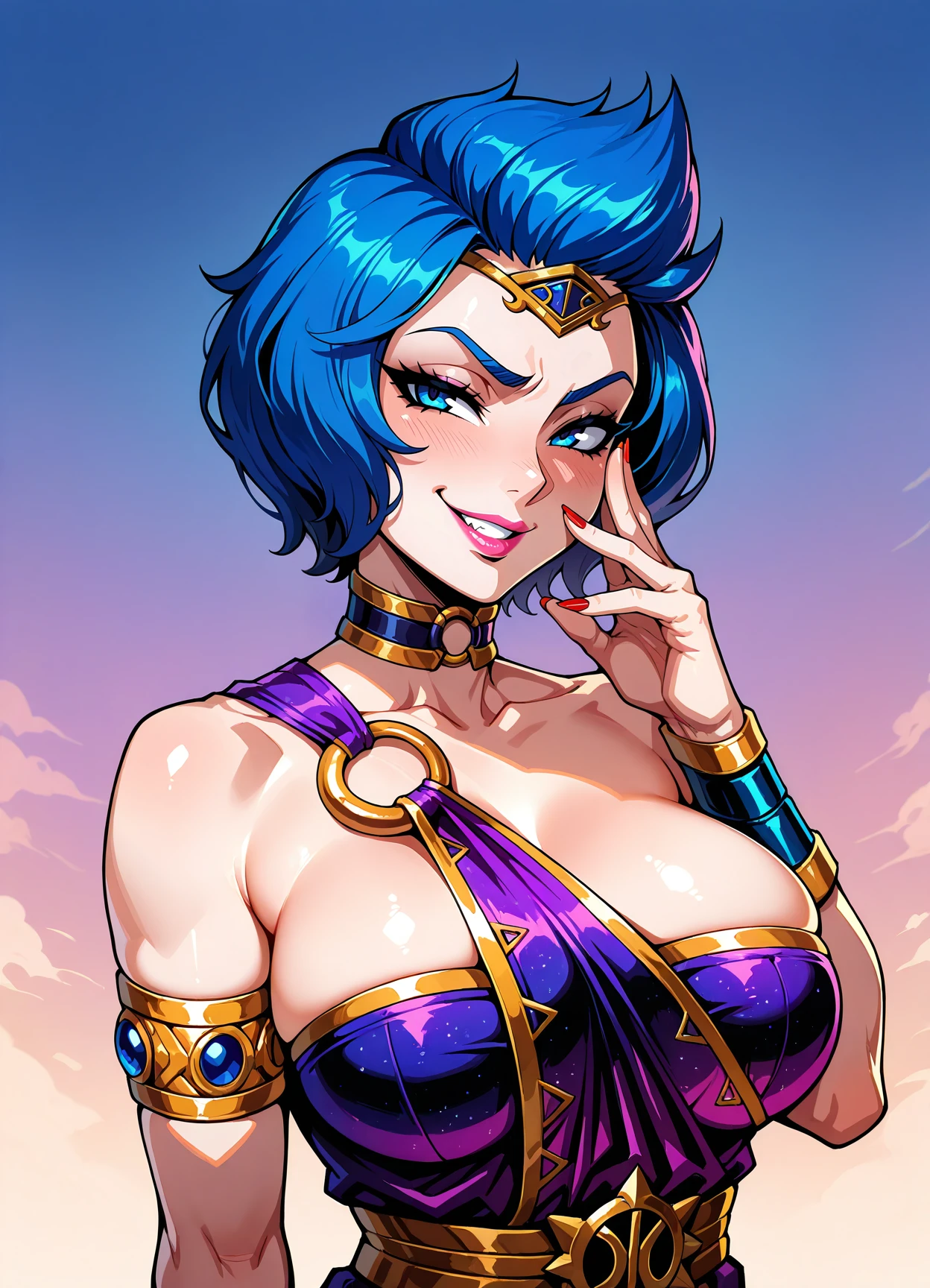 blue hair, short hair, bare shoulders, blue eyes, red nails, pink lips, o-ring dress, choker, armlet, purple dress, gladiator sandals