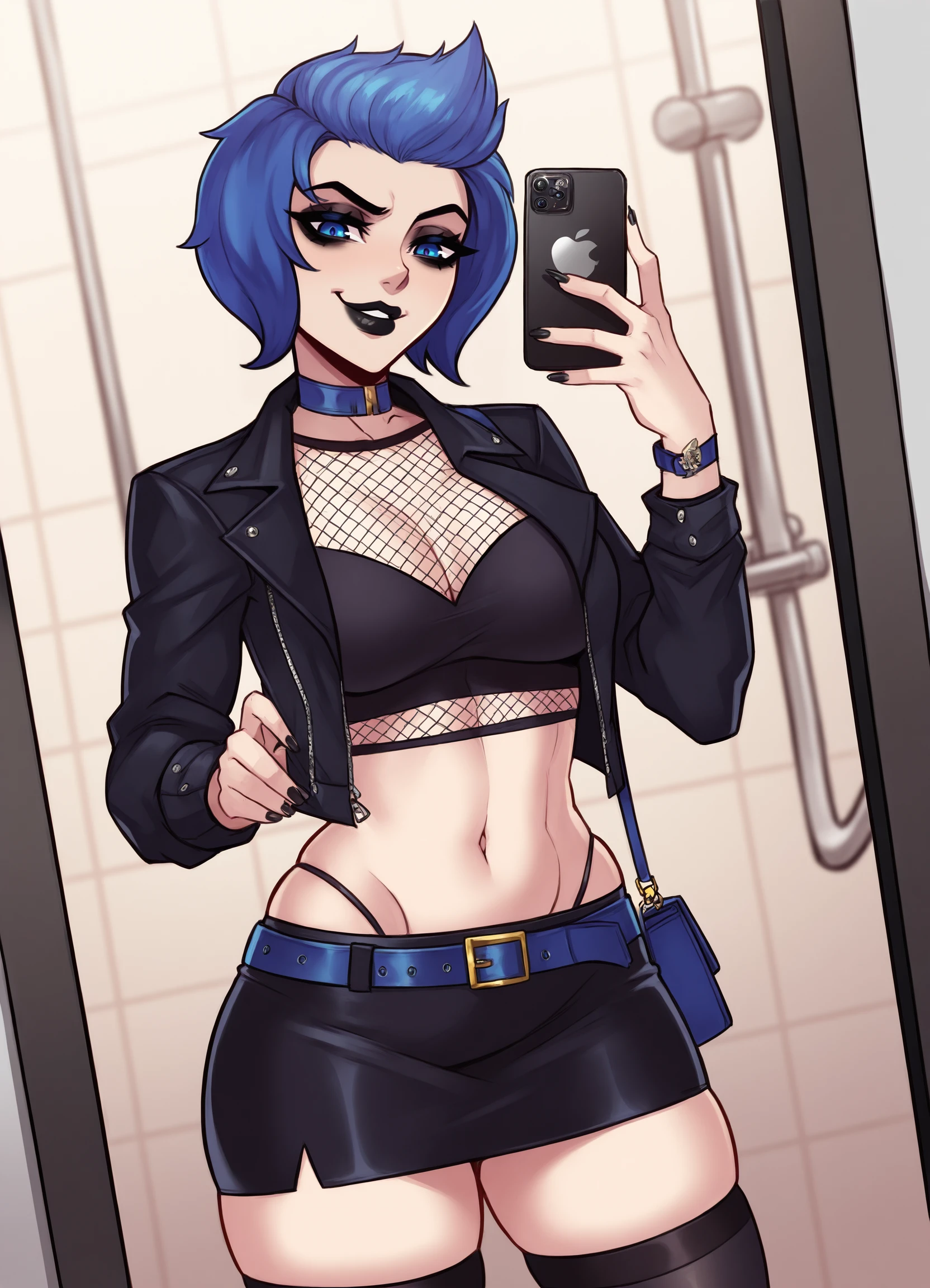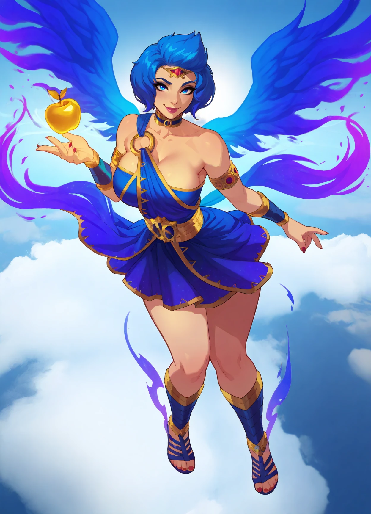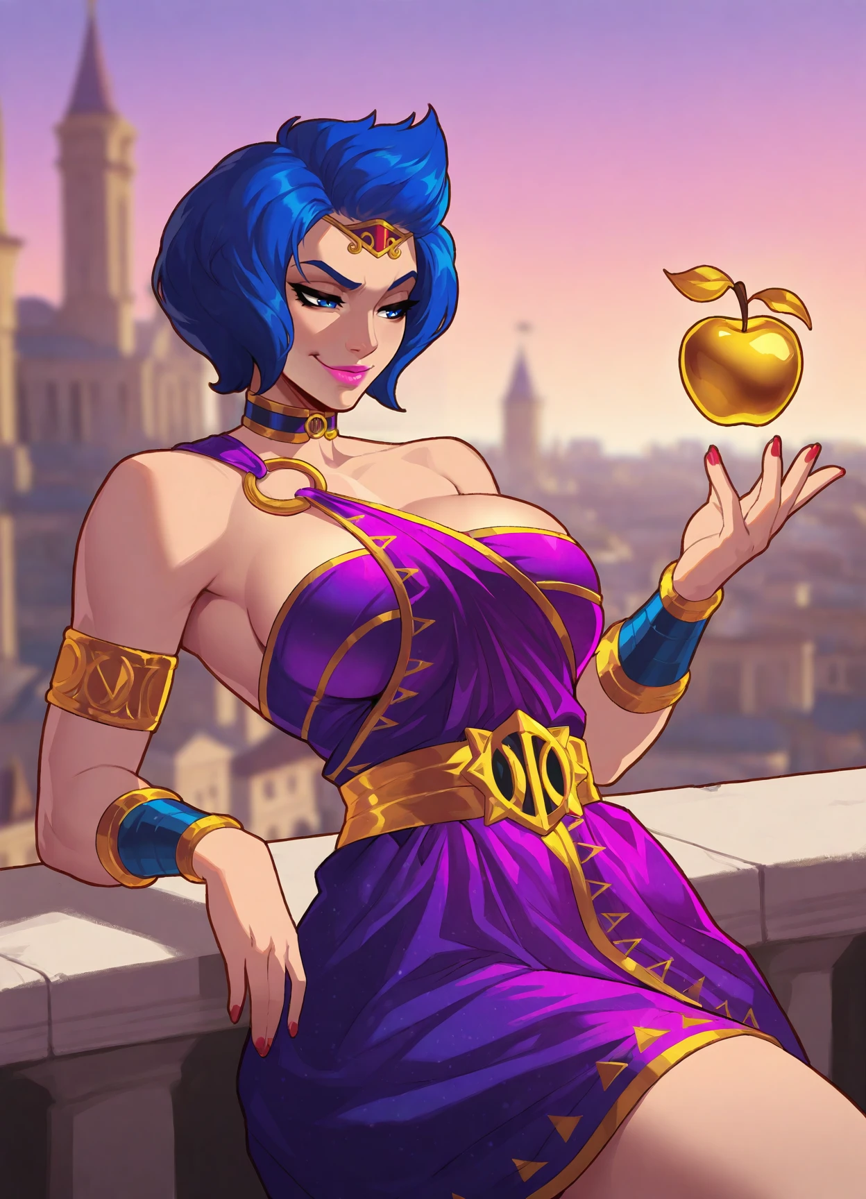 blue hair, short hair, bare shoulders, blue eyes, red nails, pink lips, o-ring dress, choker, armlet, purple dress, gladiator sandals