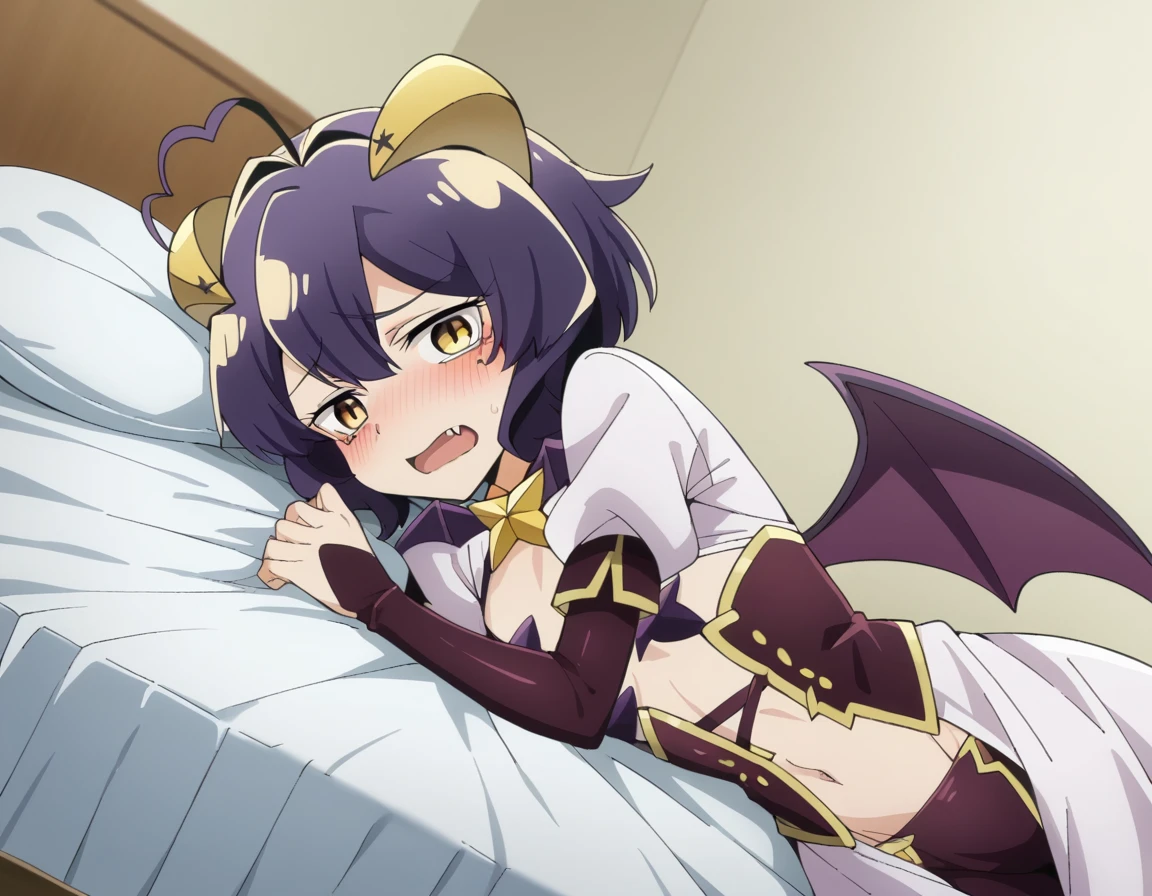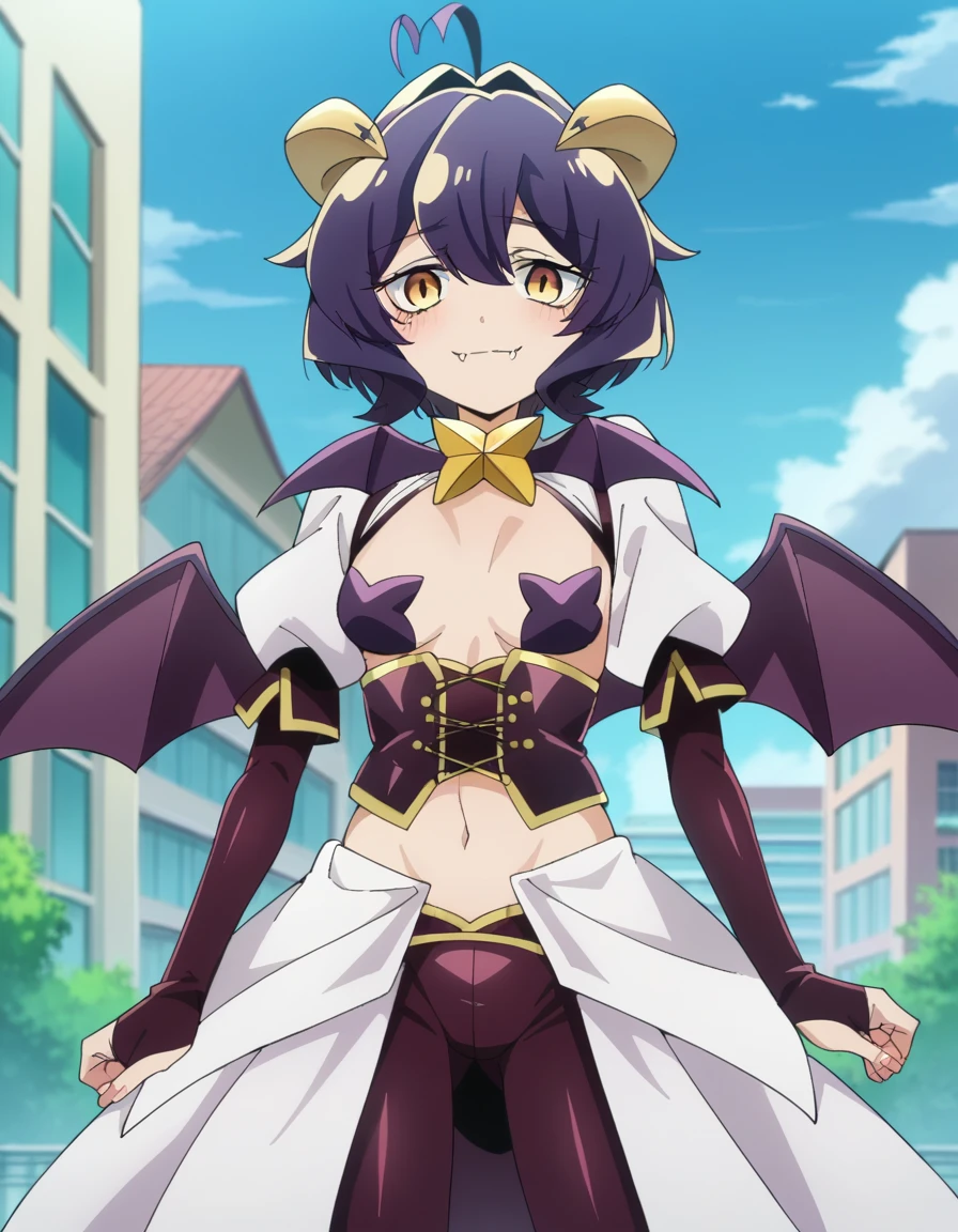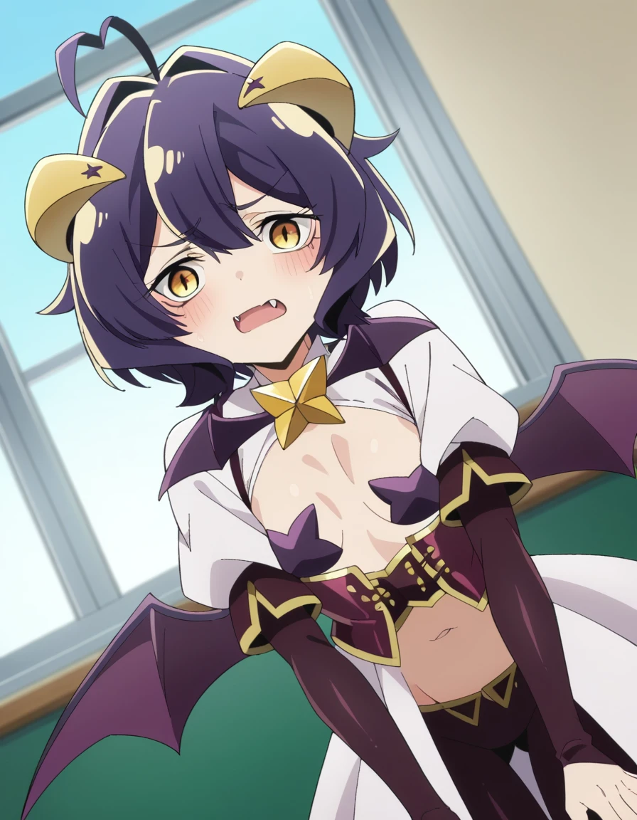 navel, wings, horns, fang, demon girl, demon horns, demon wings,