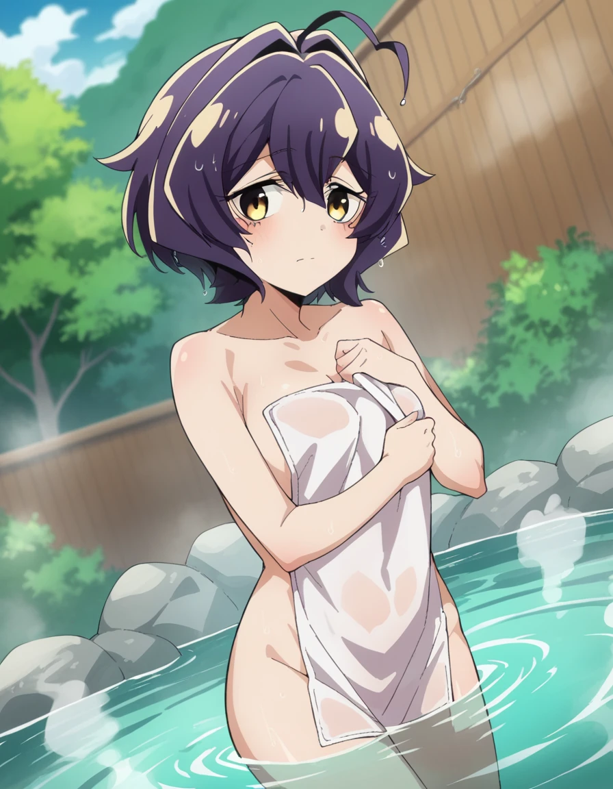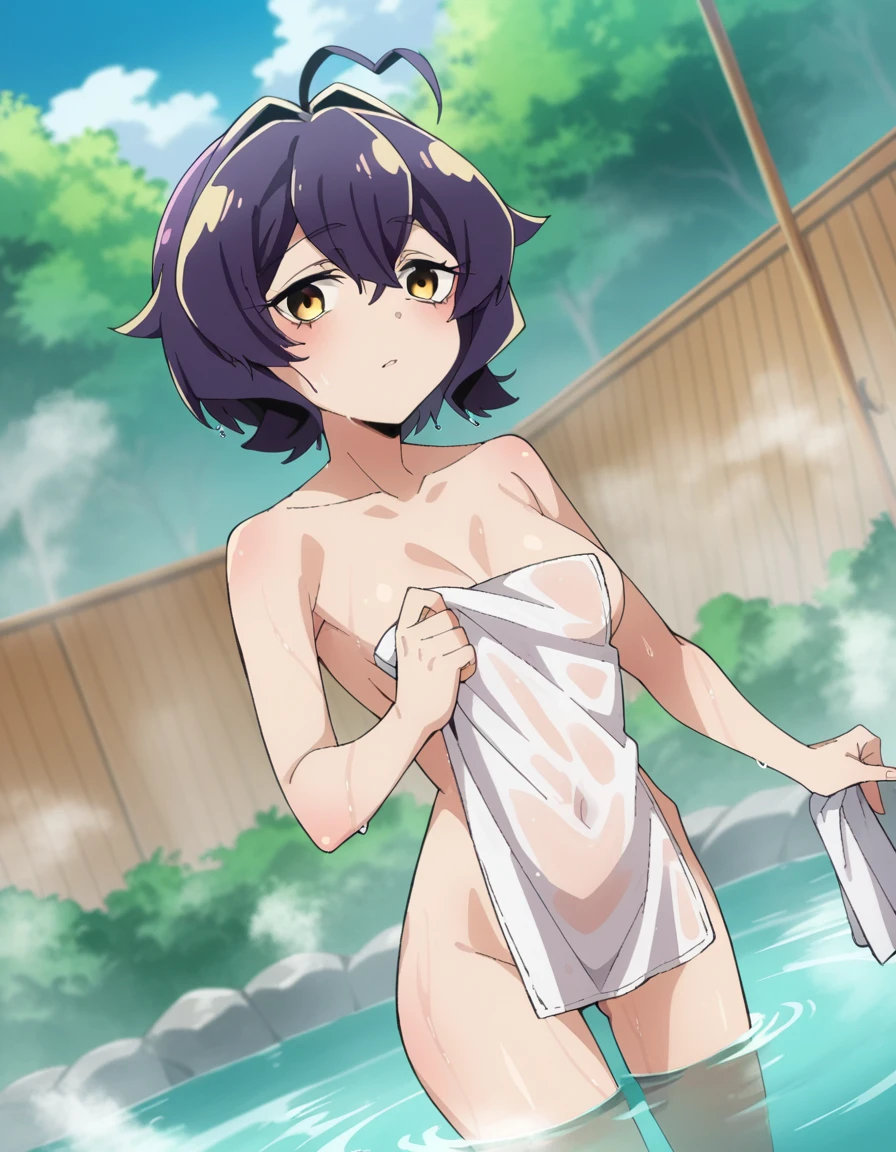 utena hiiragi, short hair, yellow eyes, purple hair, ahoge, hair intakes,