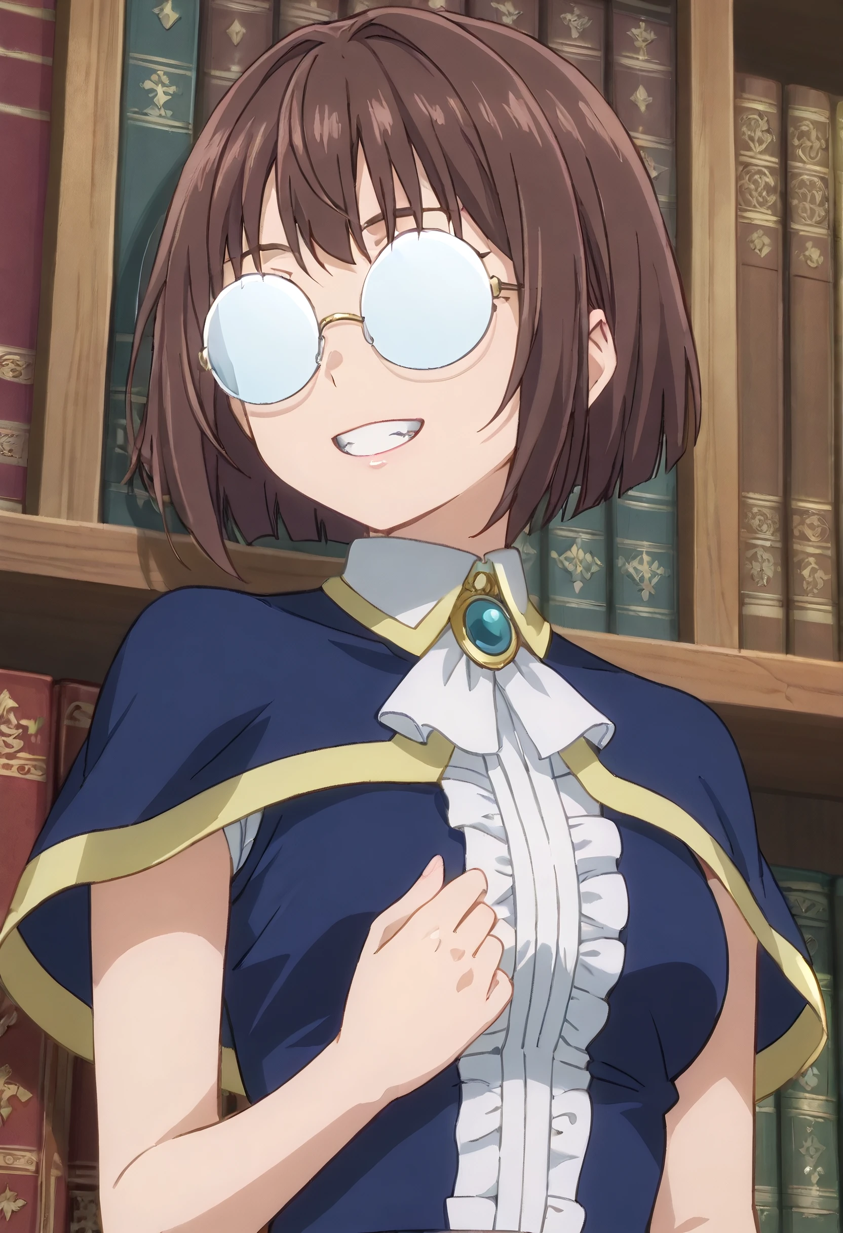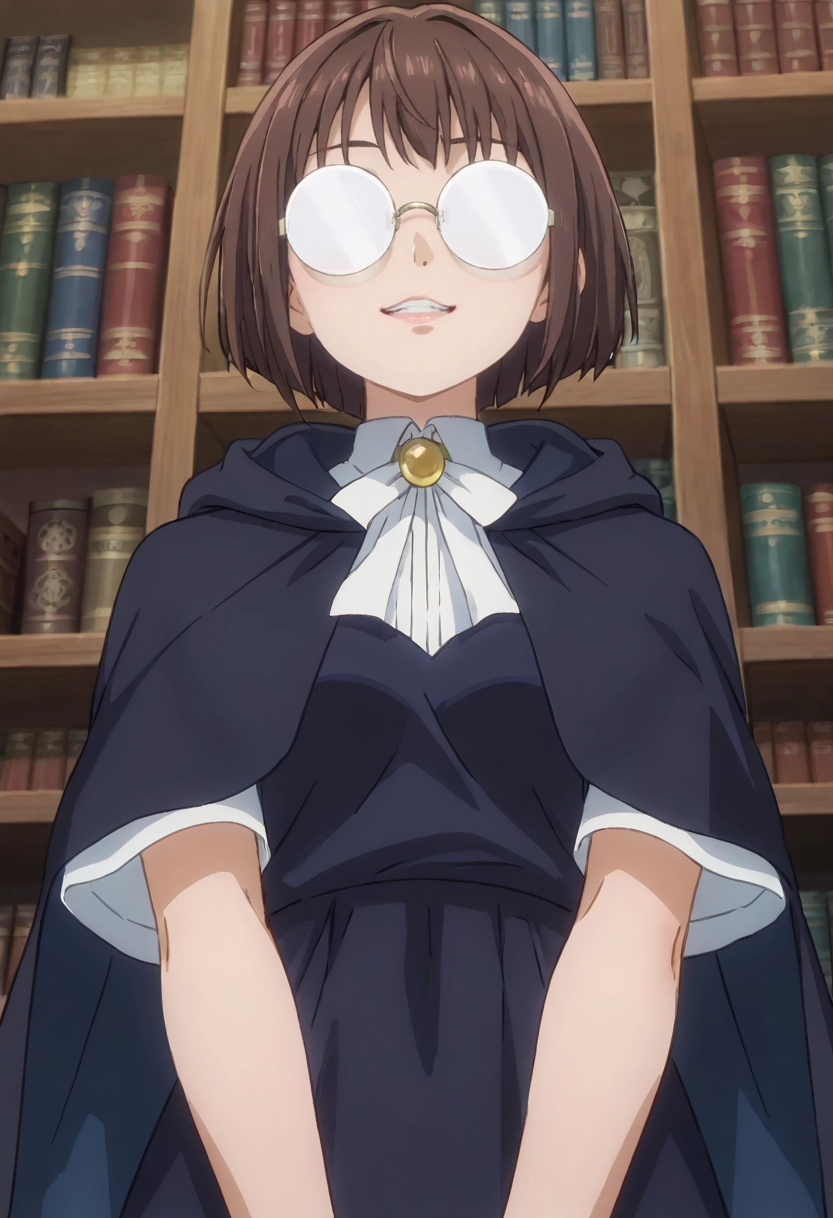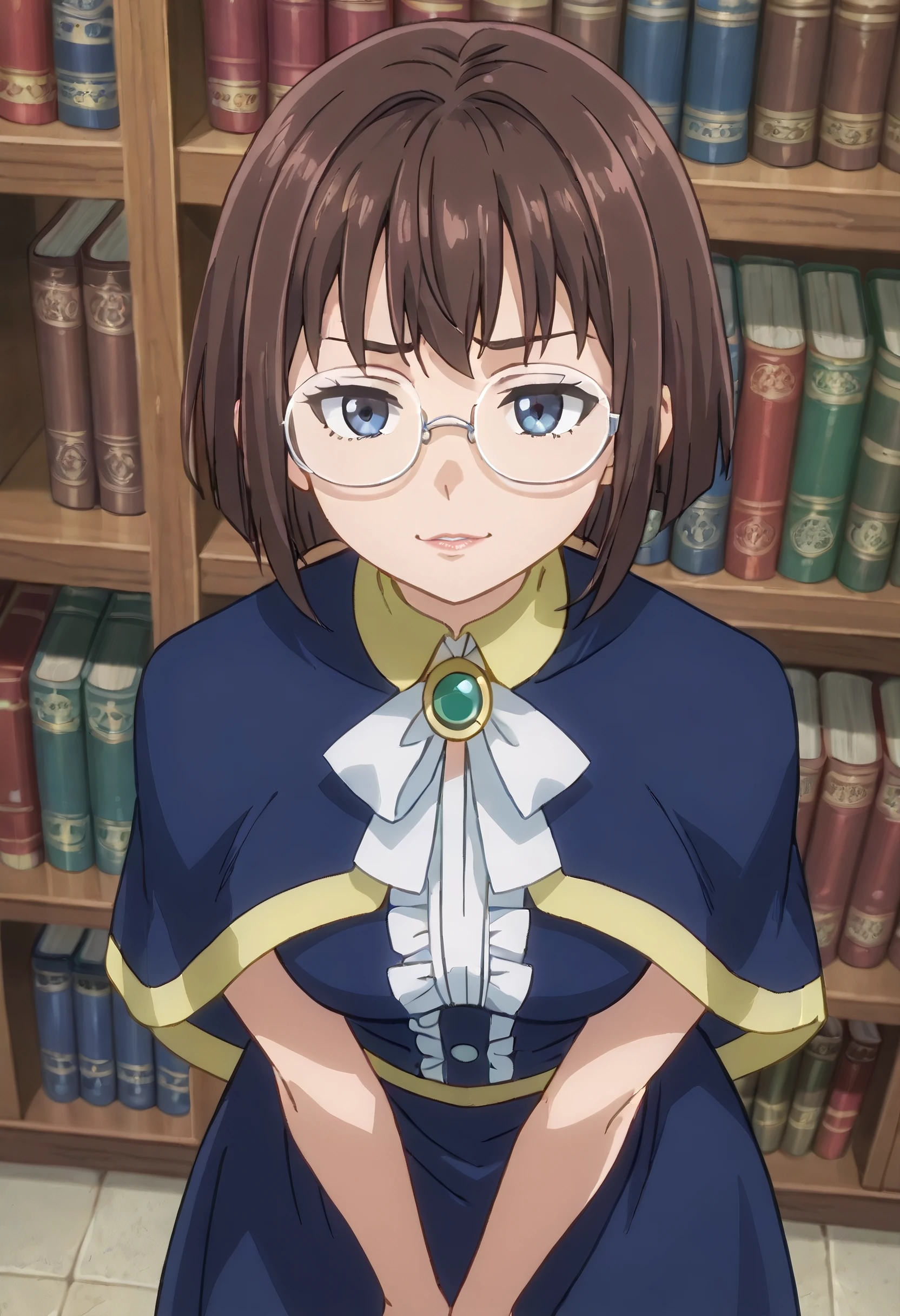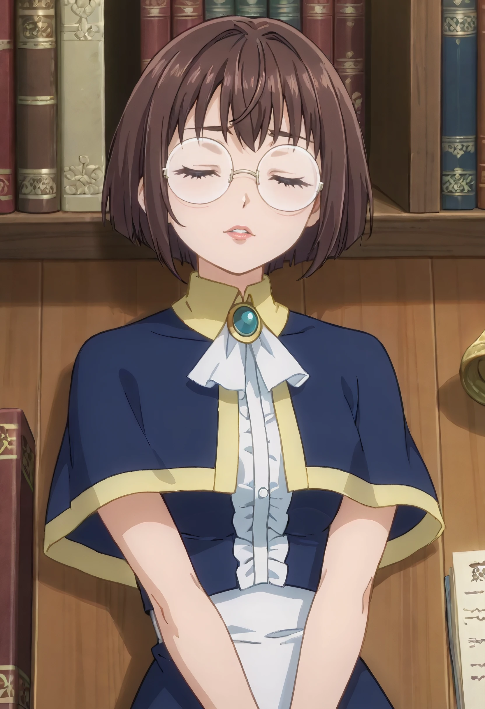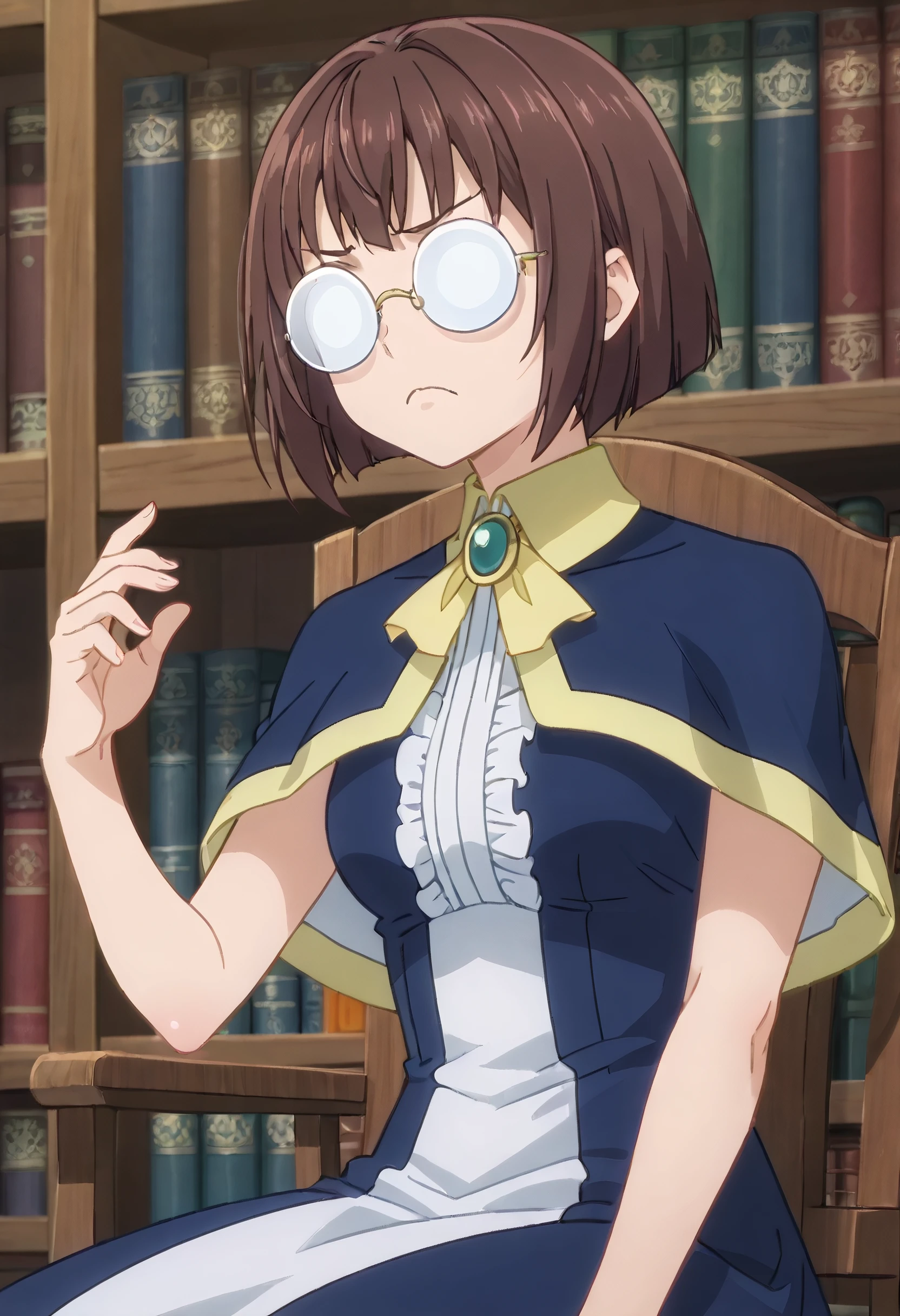 KYTReceptionist, short hair, bob cut, bookshelf, brown hair, glasses, opaque glasses, round eyewear, rimless eyewear,