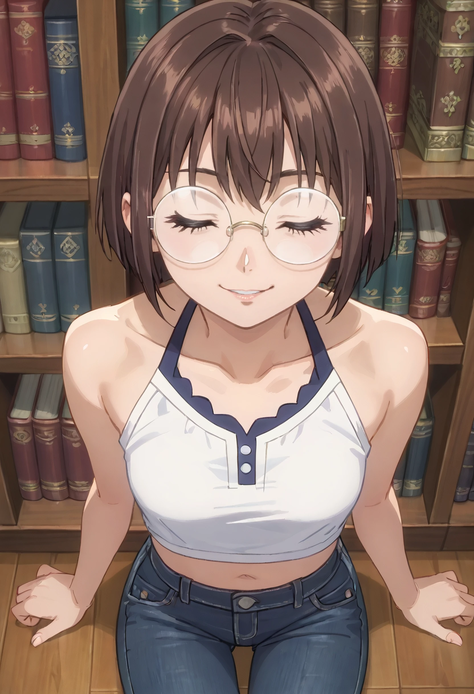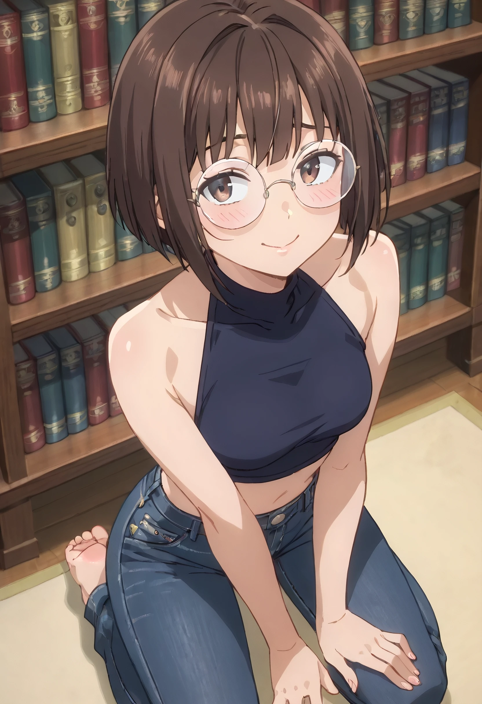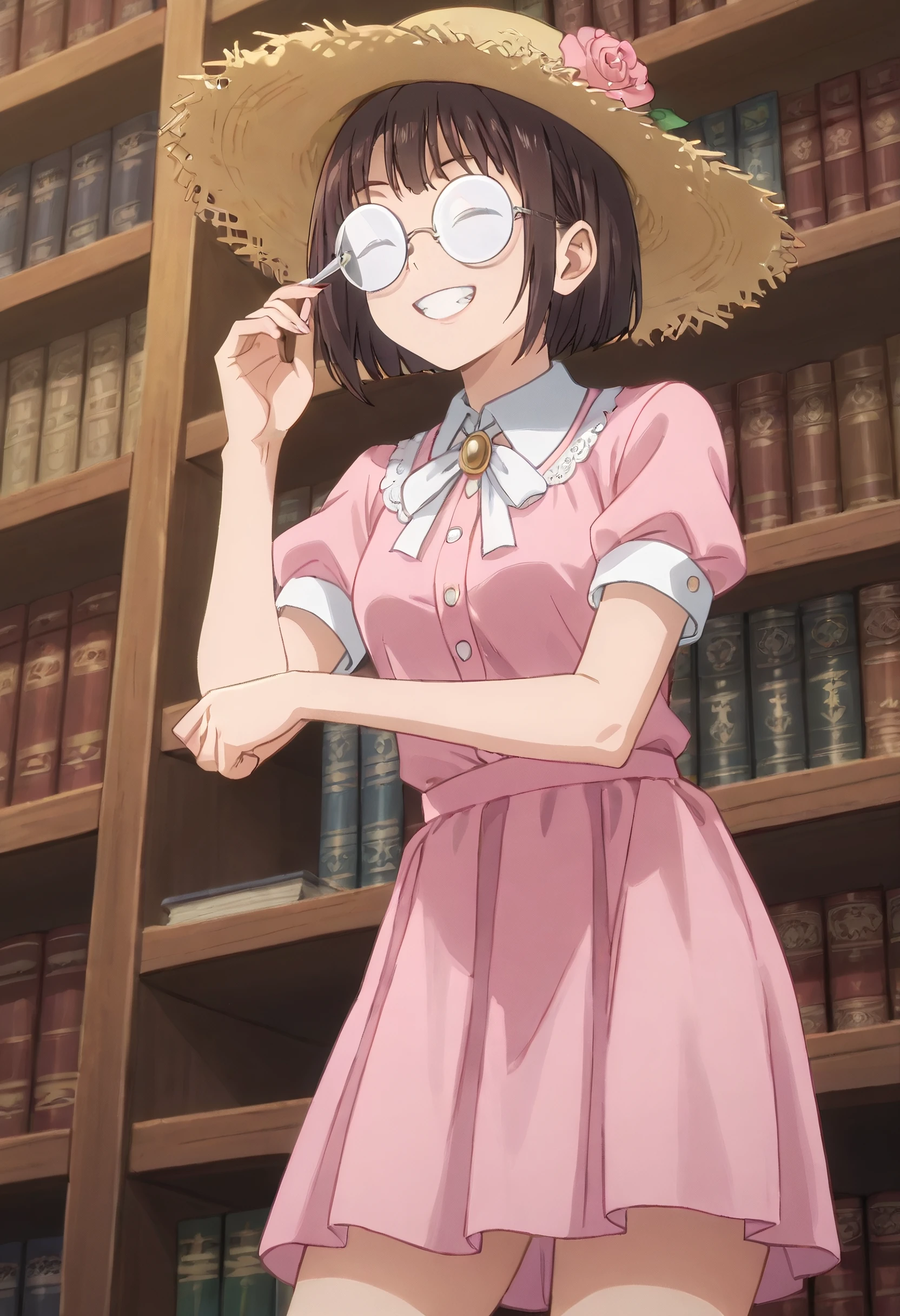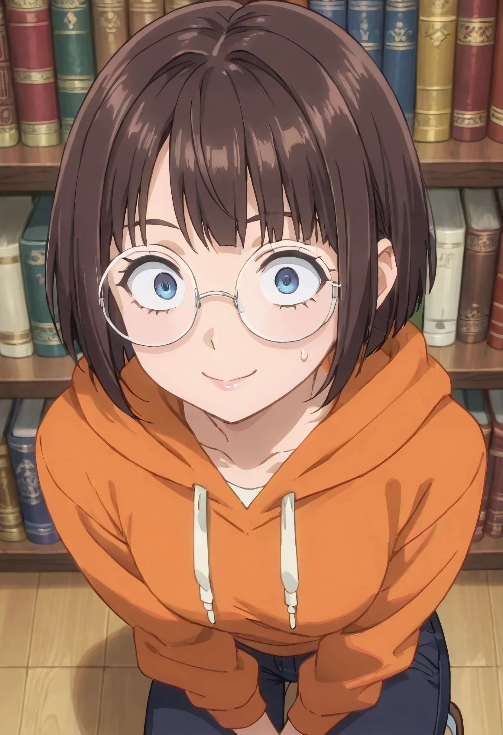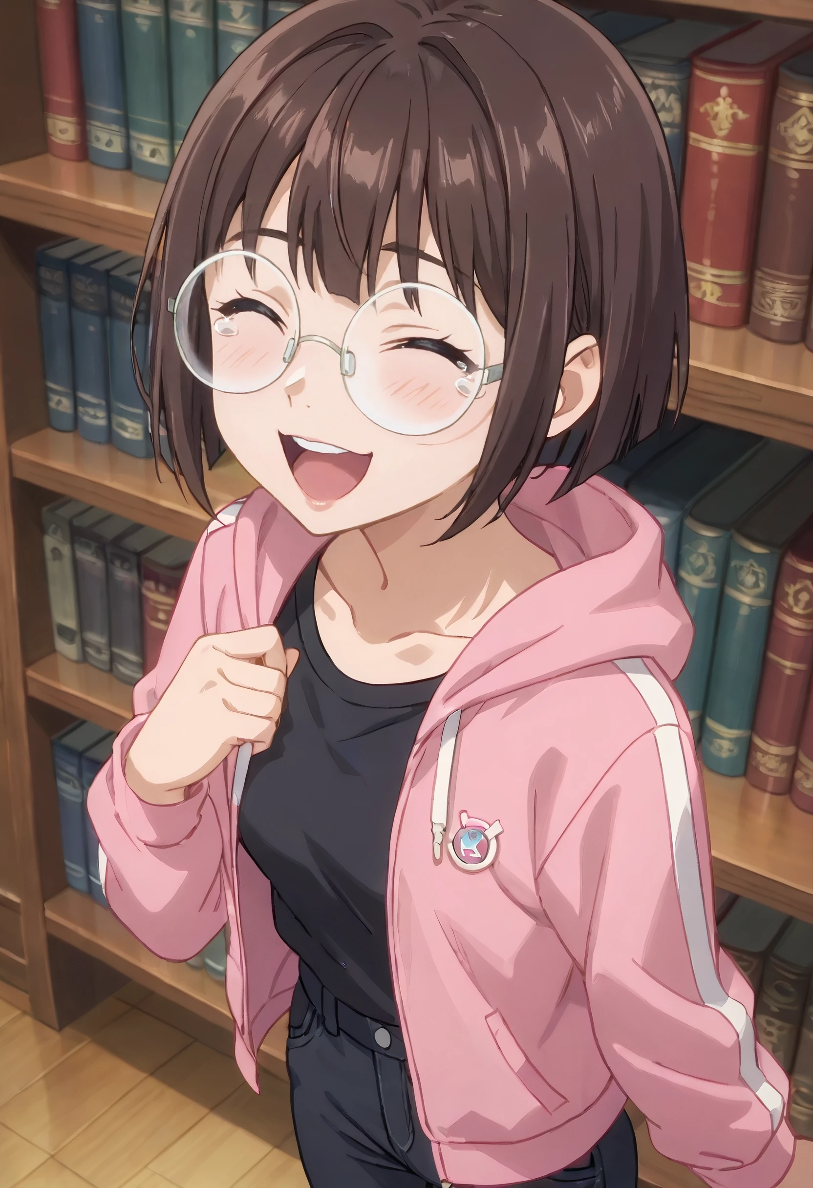 KYTReceptionist, short hair, bob cut, bookshelf, brown hair, glasses, opaque glasses, round eyewear, rimless eyewear,