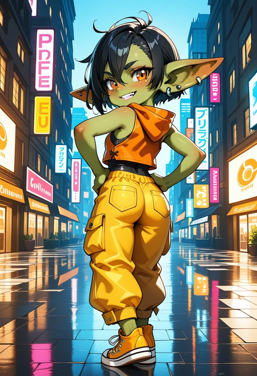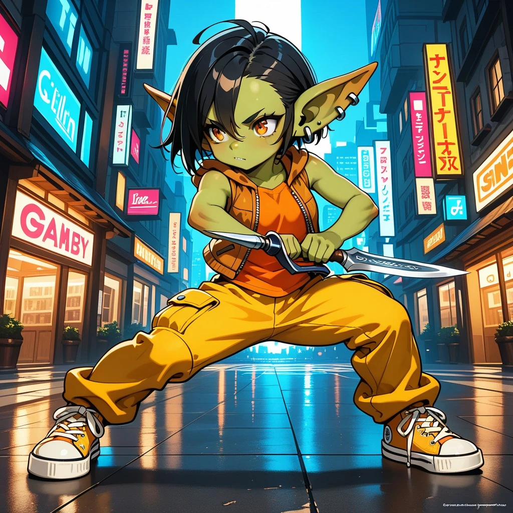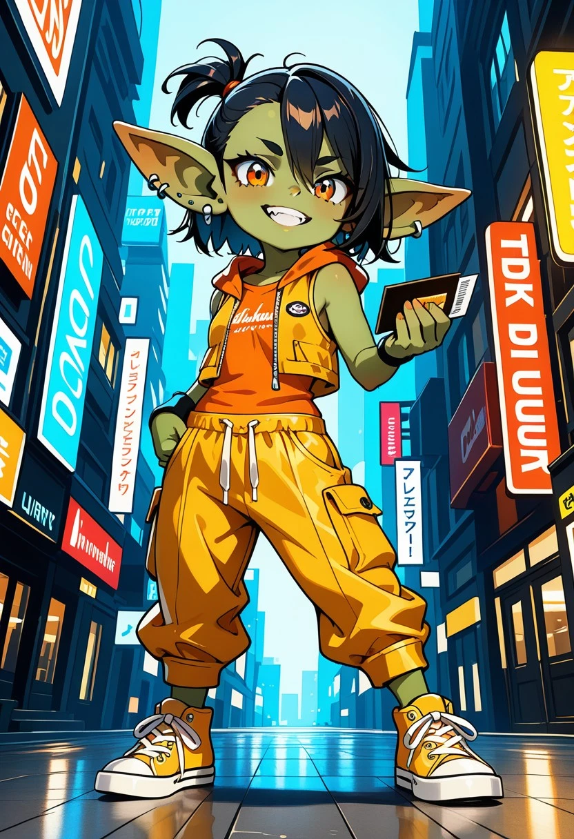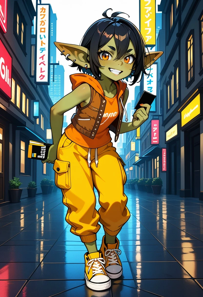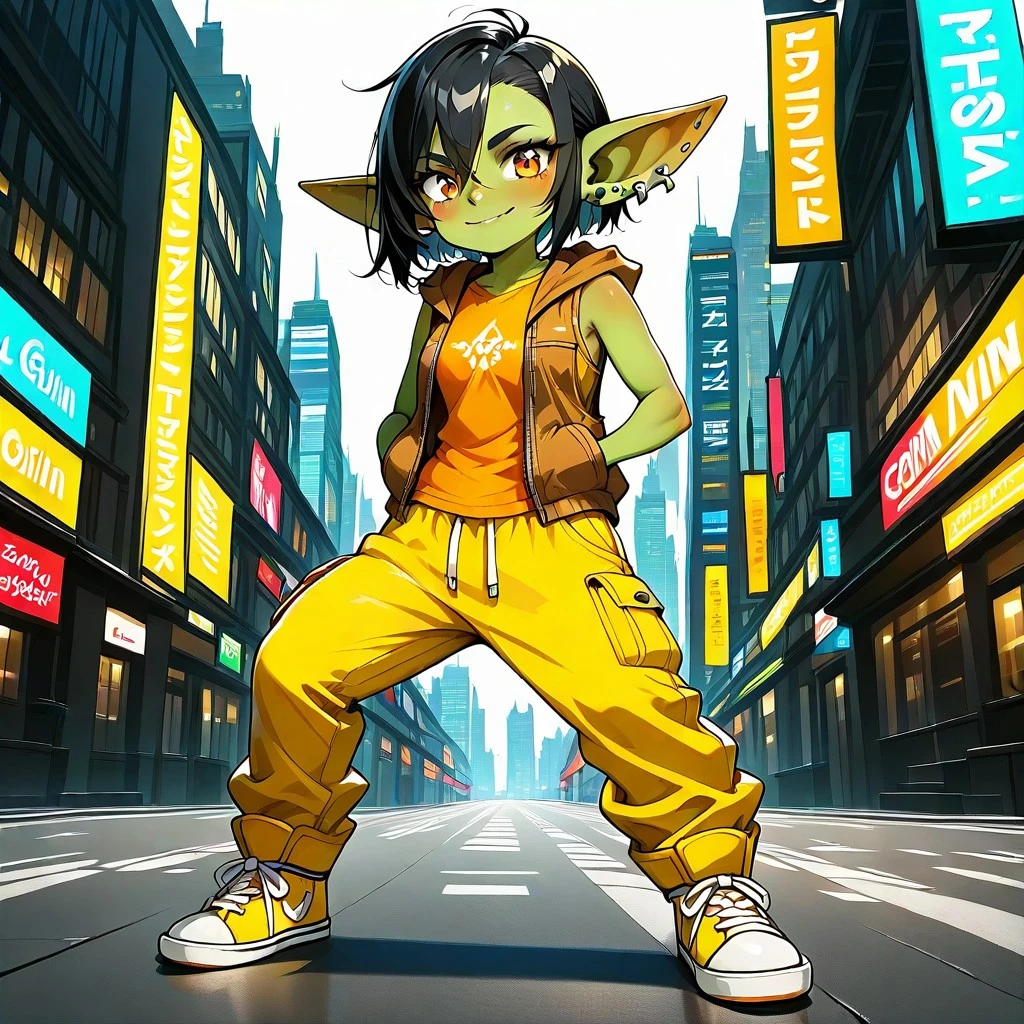 female goblin, green skin, short messy black hair with one side shaved, large pointed ears with multiple earrings, amber eyes, wearing an orange t-shirt, sleeveless brown hooded vest, yellow cargo pants, plain orange converse sneakers,