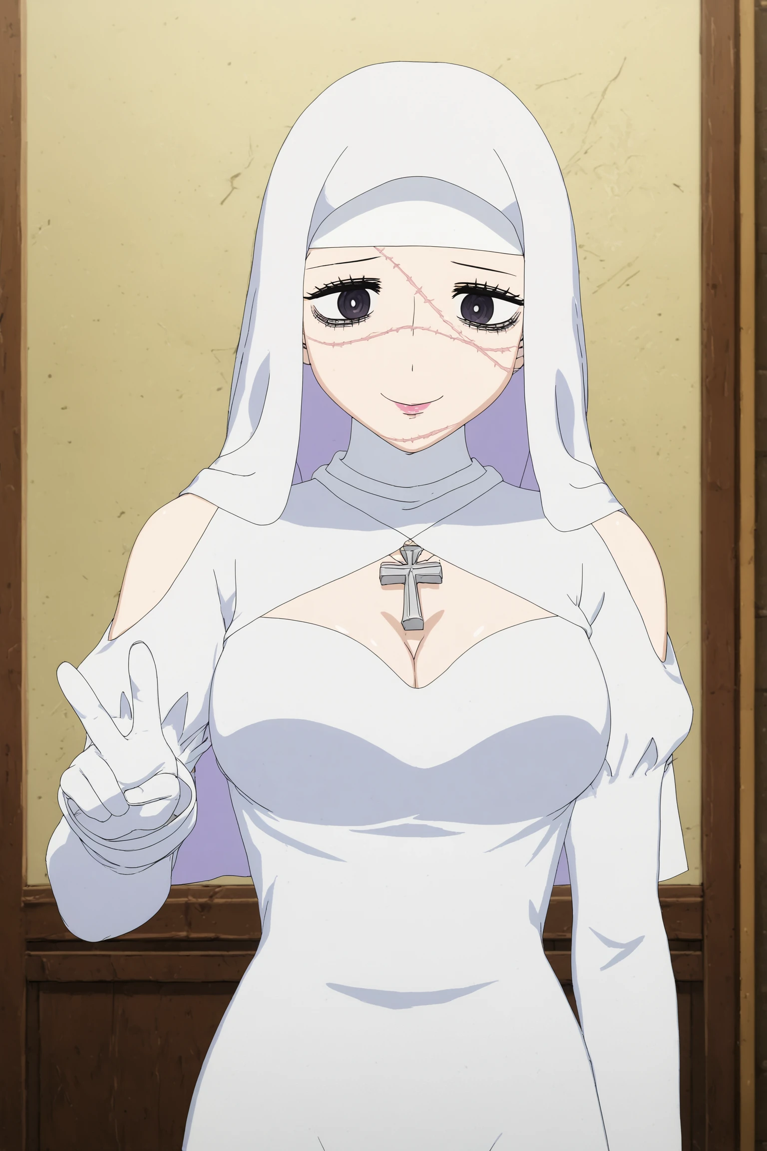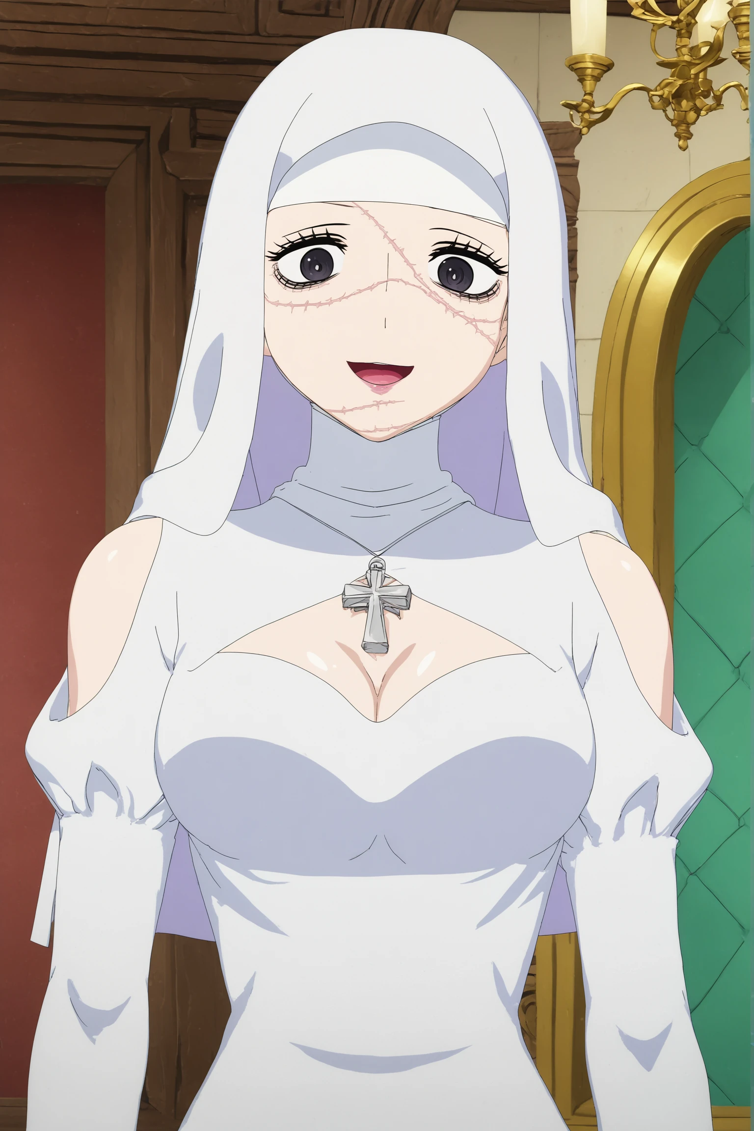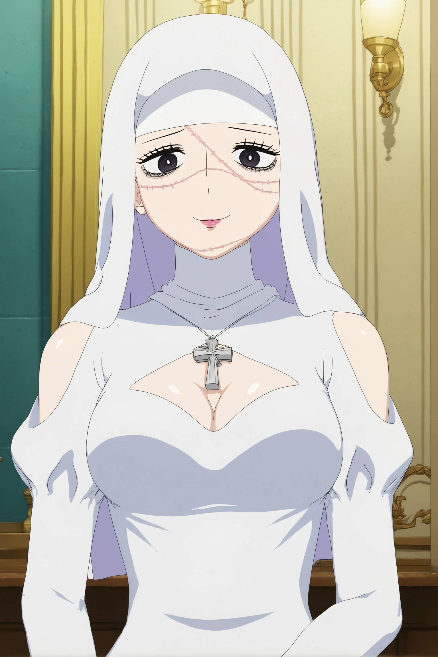 Triggers : aleth,1girl,solo,breasts,mature_female,clothing_cutout, cleavage, cleavage_cutout, scar,dress,long_sleeves, white habit,white dress,white gloves,smile,jewelry, black eyes,cross_necklace, shoulder cutout,