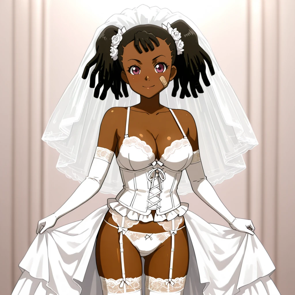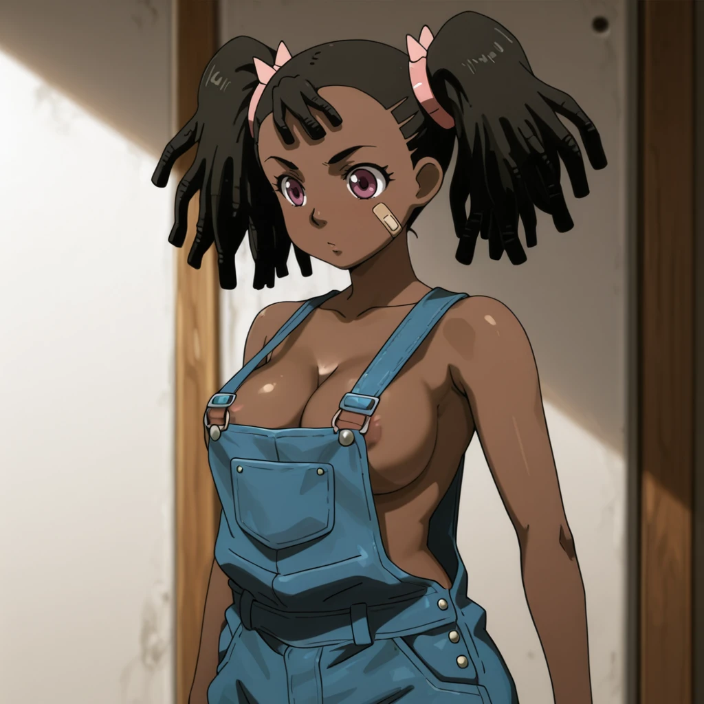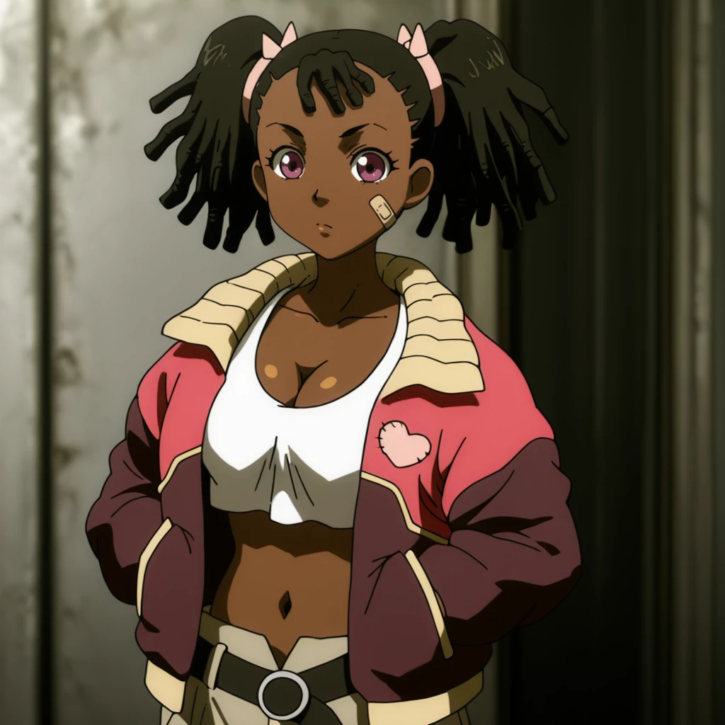 Trigger : Miyuki, 1girl, very dark skin, dreadlocks, dark-skinned female, bandaid on face, jacket, twintails, midriff, cleavage, medium breasts, hands in pockets, black hair, crop top, navel, purple eyes