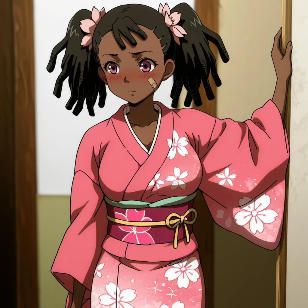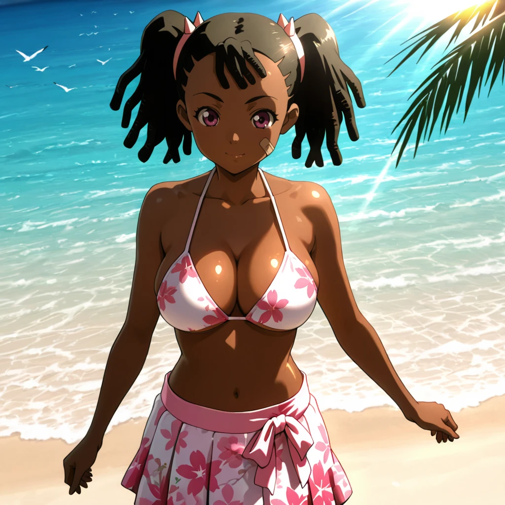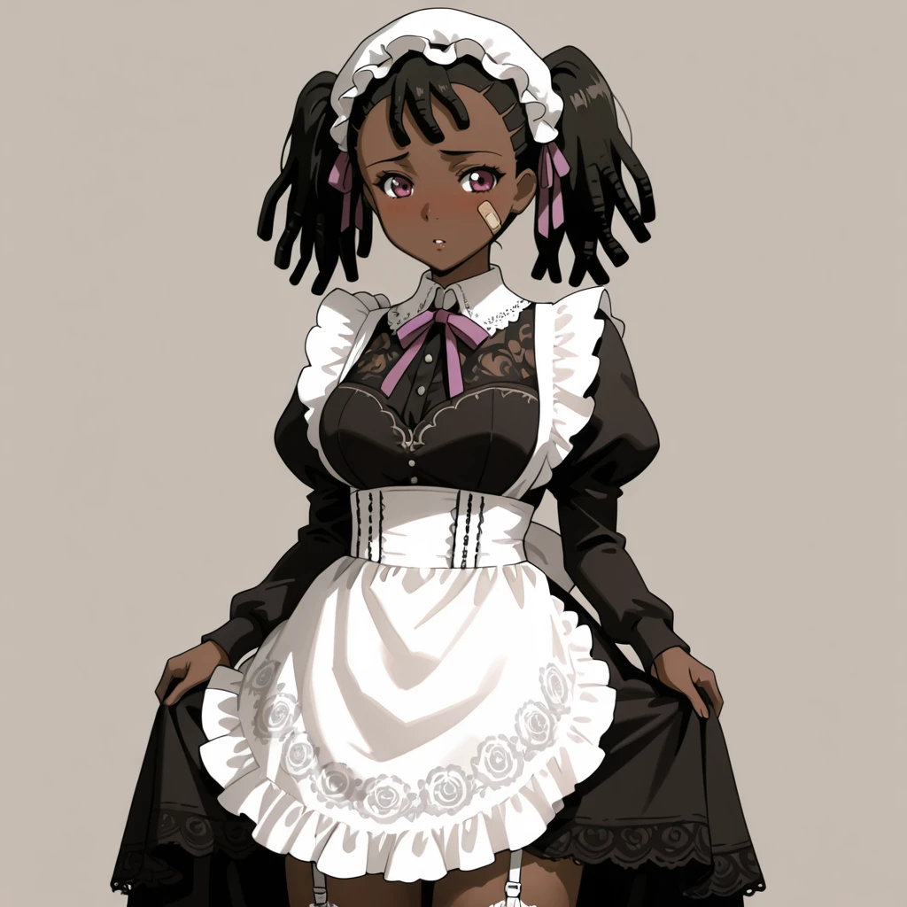 Trigger : Miyuki, 1girl, very dark skin, dreadlocks, dark-skinned female, bandaid on face, jacket, twintails, midriff, cleavage, medium breasts, hands in pockets, black hair, crop top, navel, purple eyes