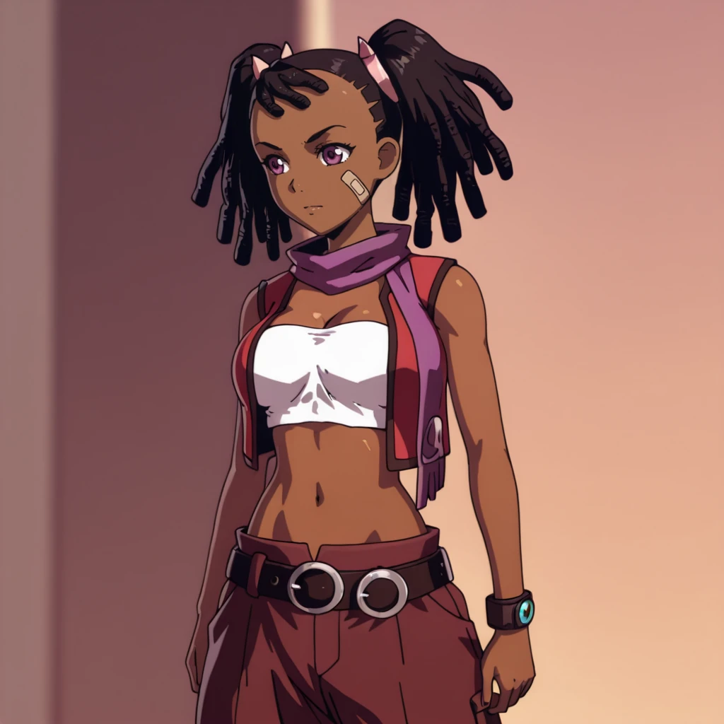 Trigger with scarf: MiyukiScarf, 1girl, dark skin, dark-skinned female, dreadlocks, midriff, black hair, bandaid on face, navel, vest, belt, tube top, purple eyes, scarf, pants, strapless, crop top