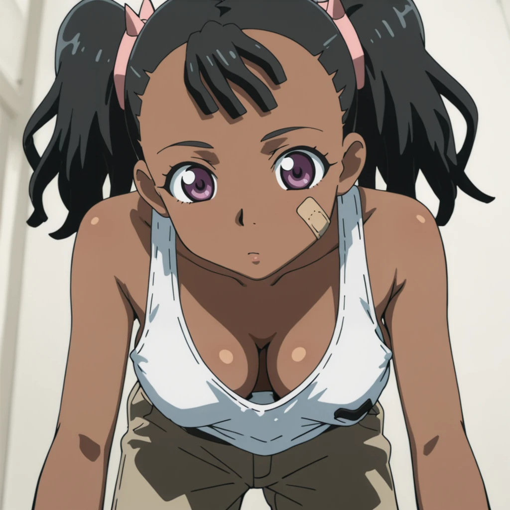Trigger with white shirt: MiyukiWhiteShirt, 1girl, medium breasts, twintails, cleavage, bandaid, black hair, dark skin, tank top, downblouse, dark-skinned female, purple eyes