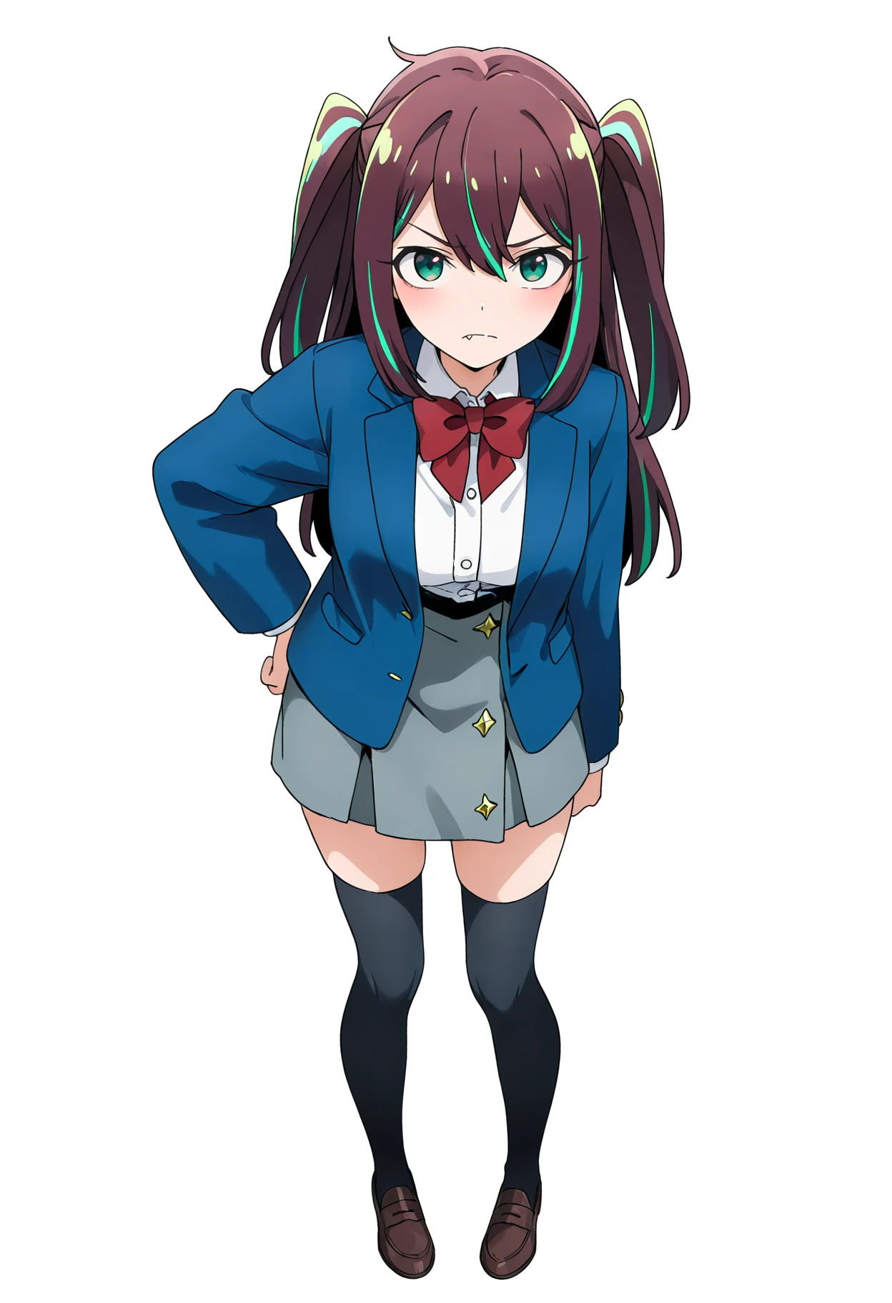 blue jacket, red bowtie, white shirt, long sleeves, grey skirt, black thighhighs, loafers