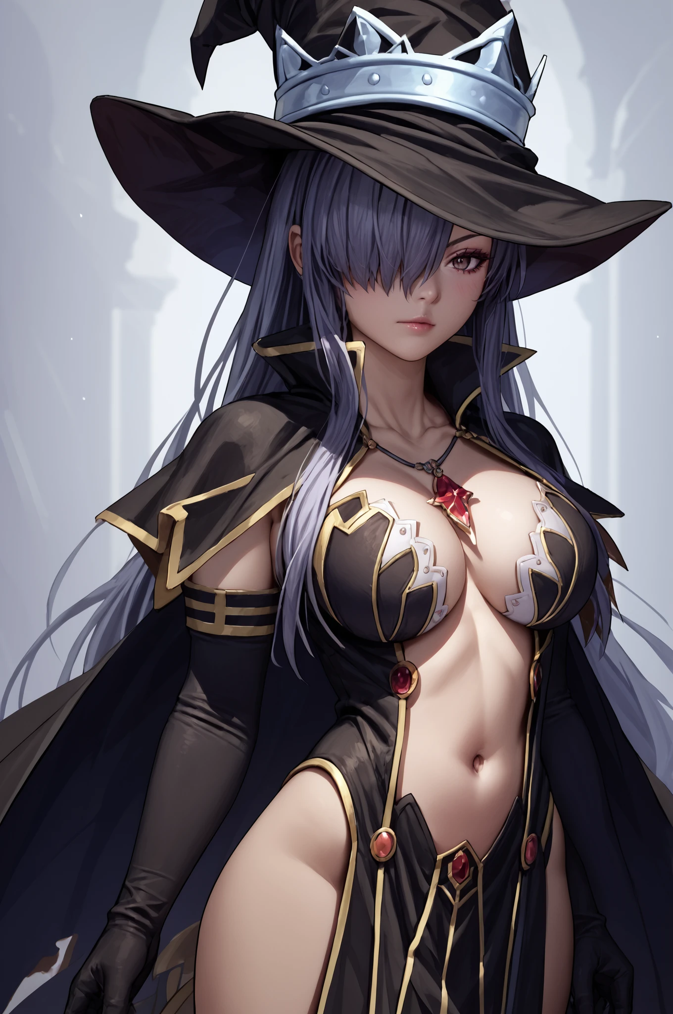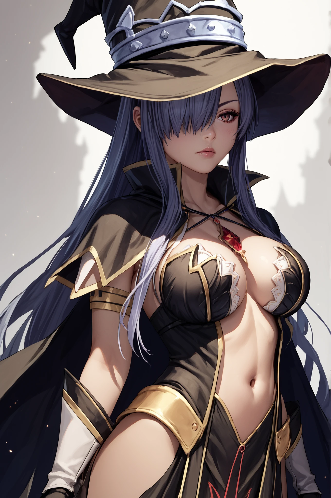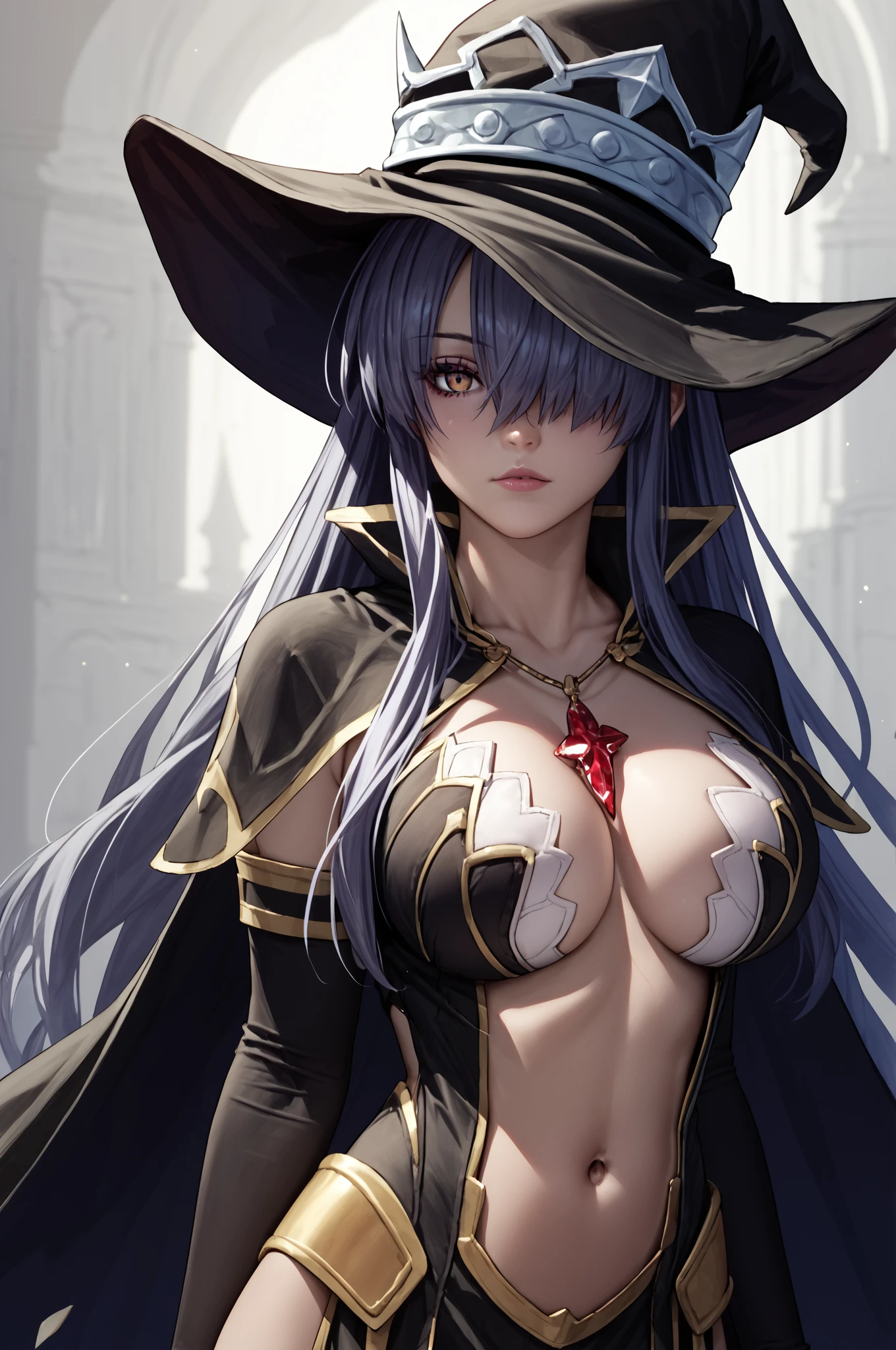 Basic Prompt: fatima_\(luminous_arc\), witch_hat, fati_dress, long_hair, hair_over_one_eye, navel, gloves, black_cape