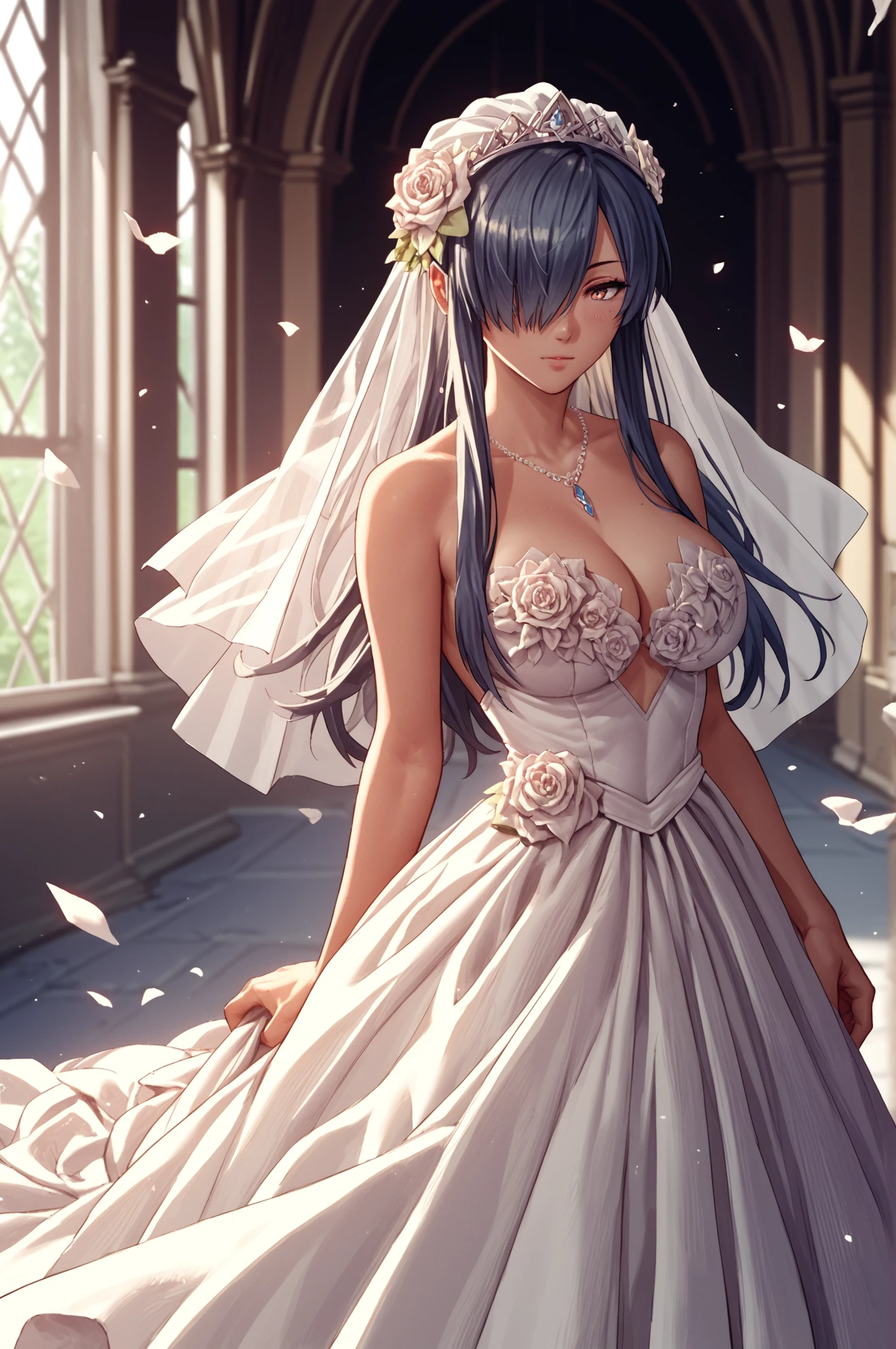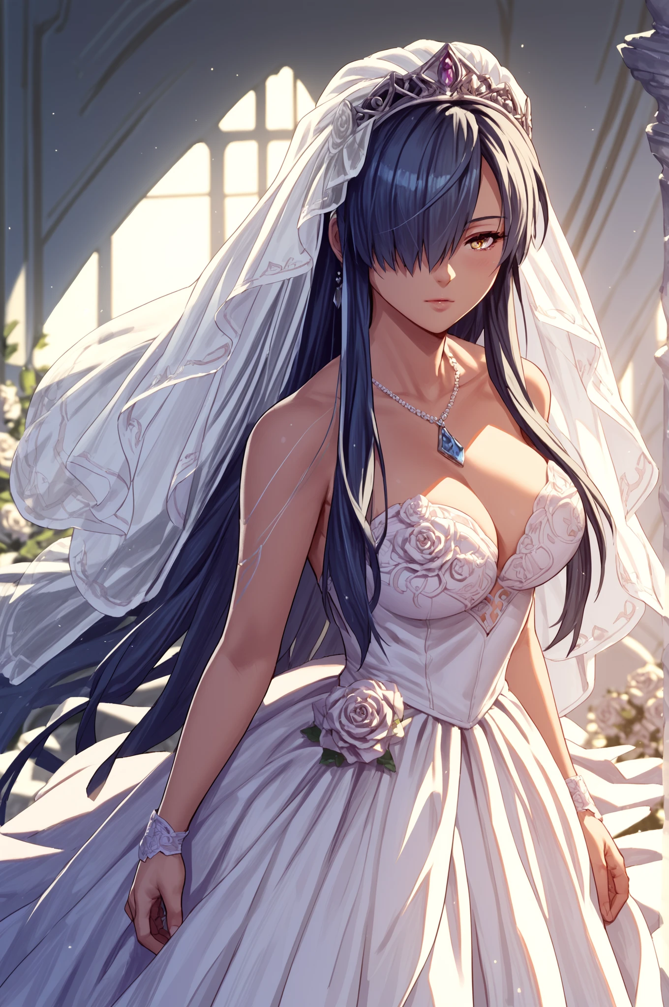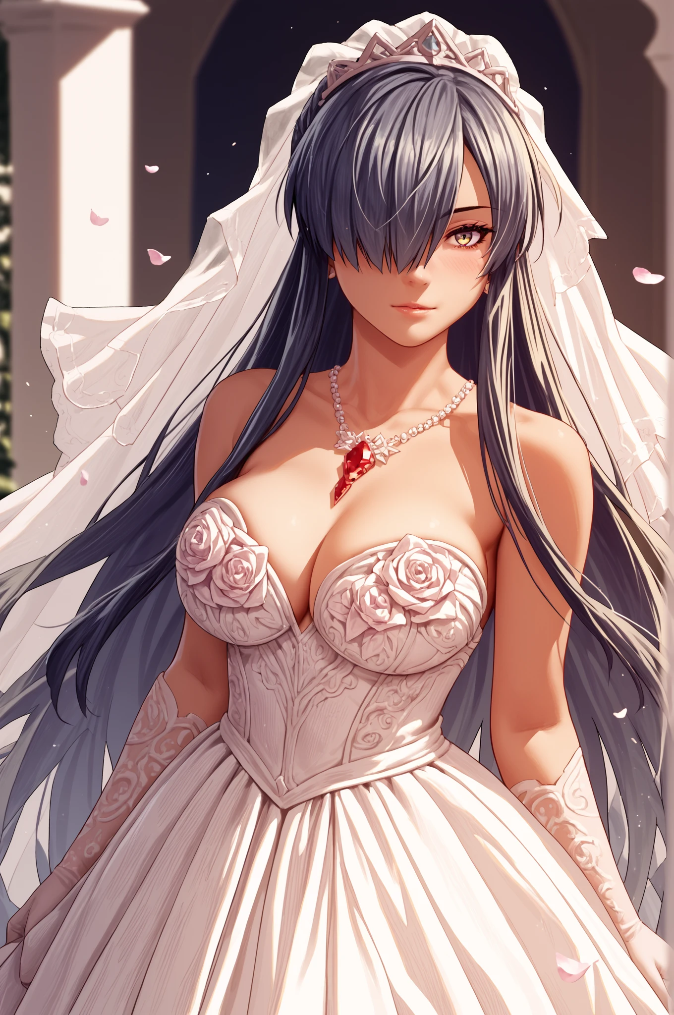 Basic Prompt: fatima_\(luminous_arc\), witch_hat, fati_dress, long_hair, hair_over_one_eye, navel, gloves, black_cape