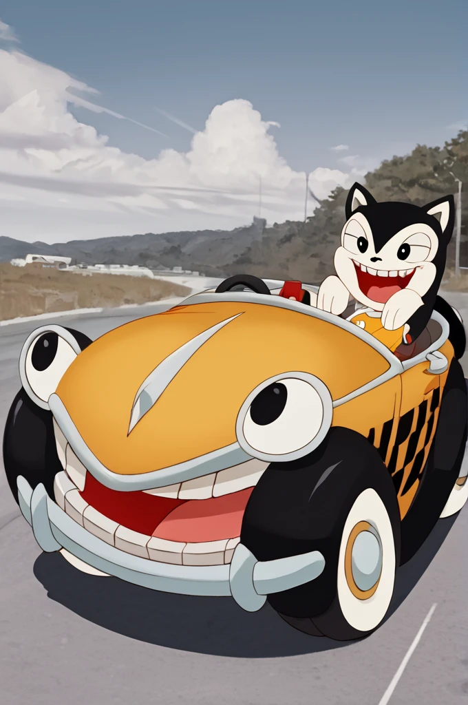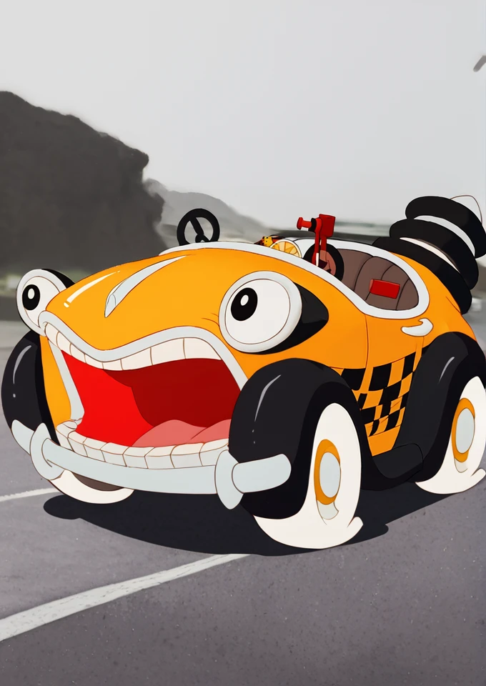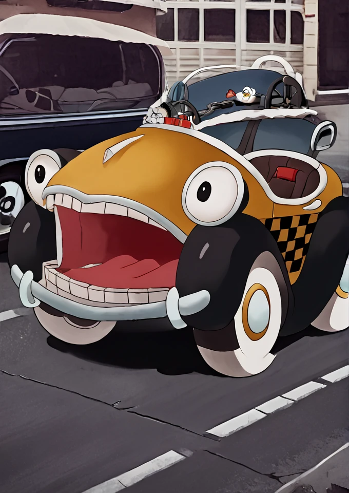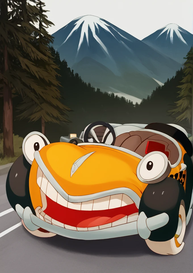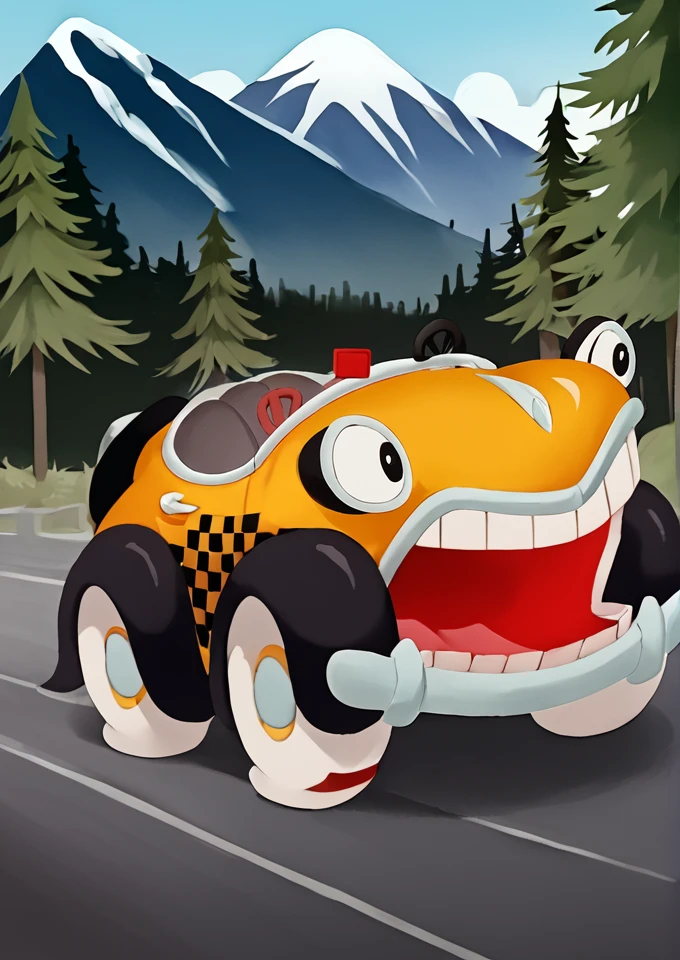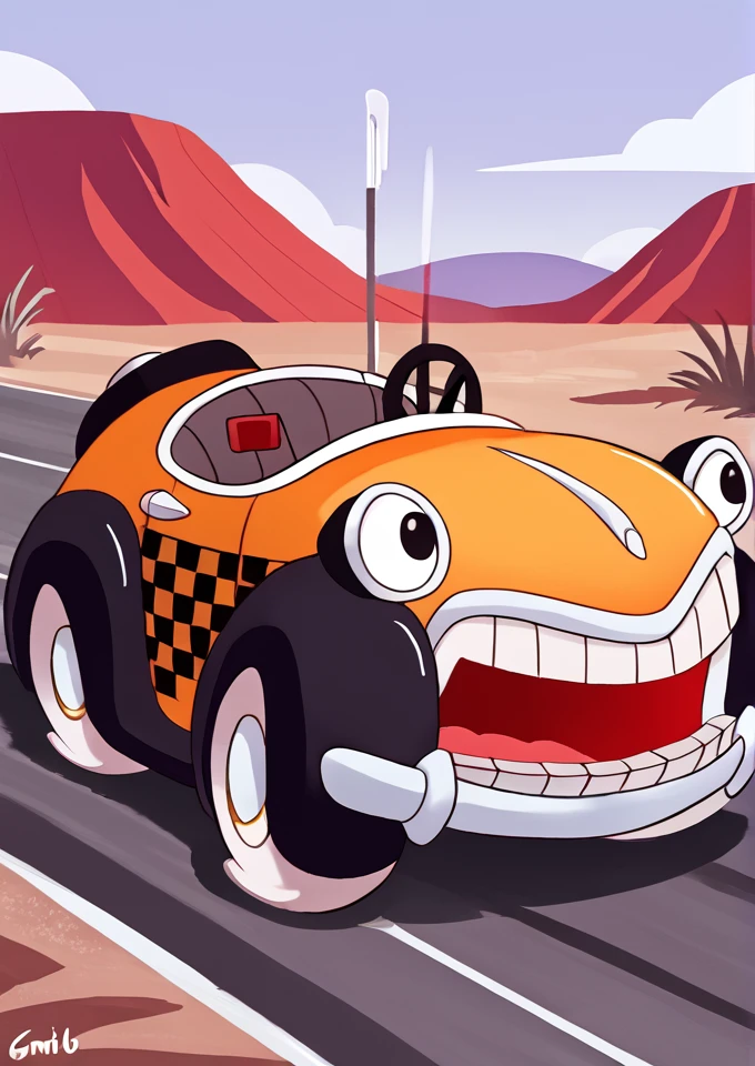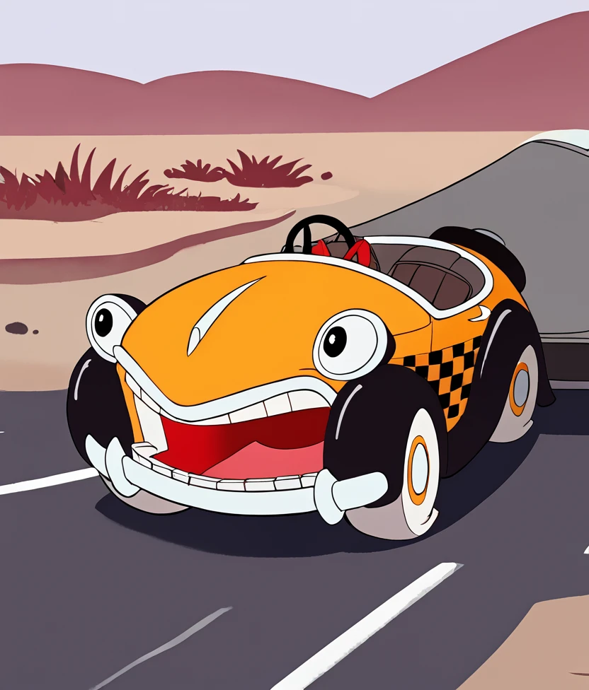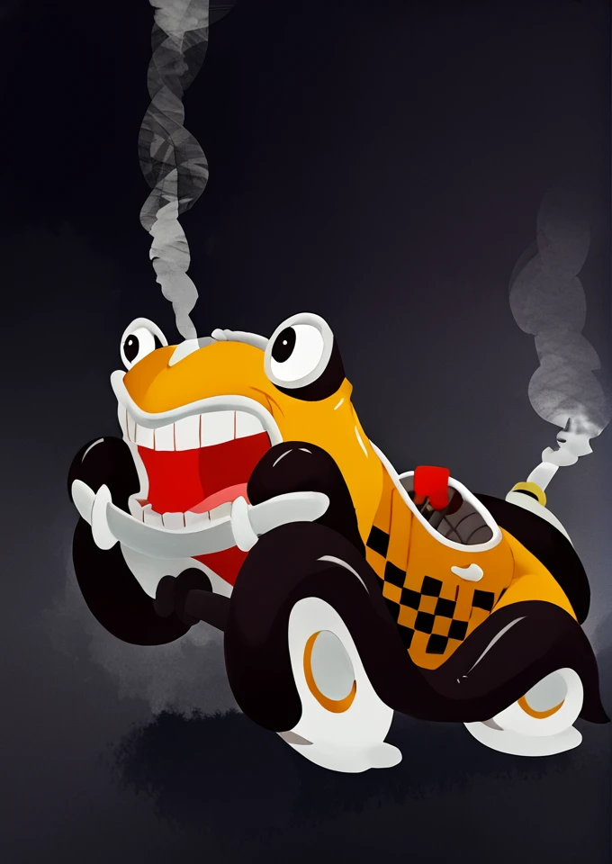 prompt: benny, cartoon car, cartoon taxi, large eyes, headlight eyes, grill mouth, happy expression, yellow cab, steering wheel, checkered pattern, white tires, flat tires