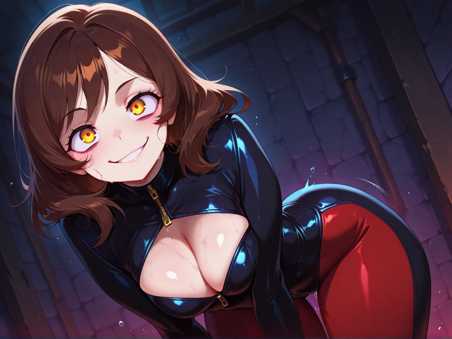 This was built to include red eyes, crazy eyes, crazy smile, torn clothing, steaming body, sweat, and copious pussy juice. If those things are showing up where you don't want them stick them in the negative tags.