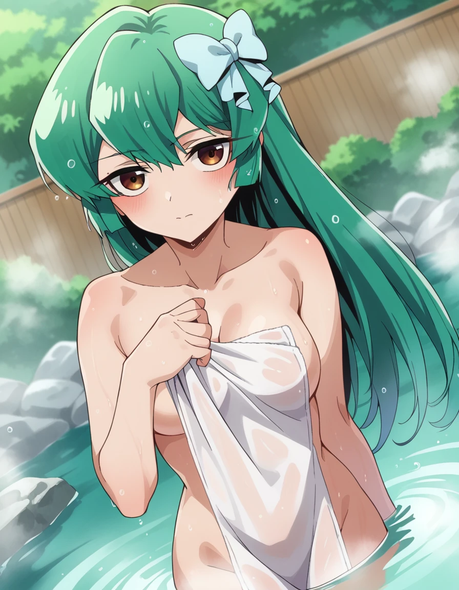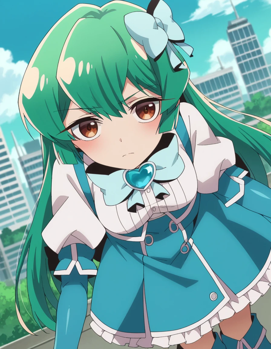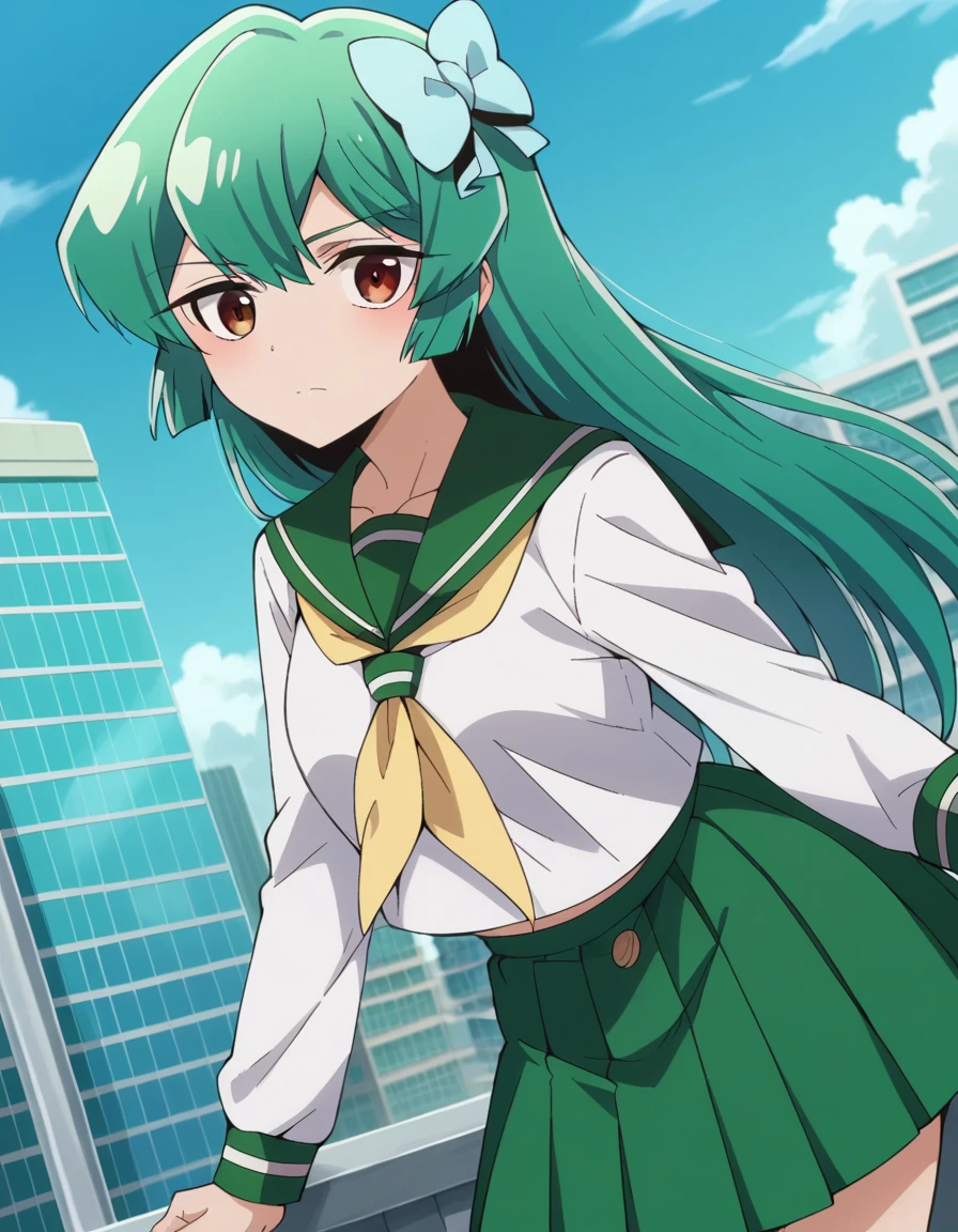 sayo minakami, long hair, brown eyes, bow, hair bow, green hair,