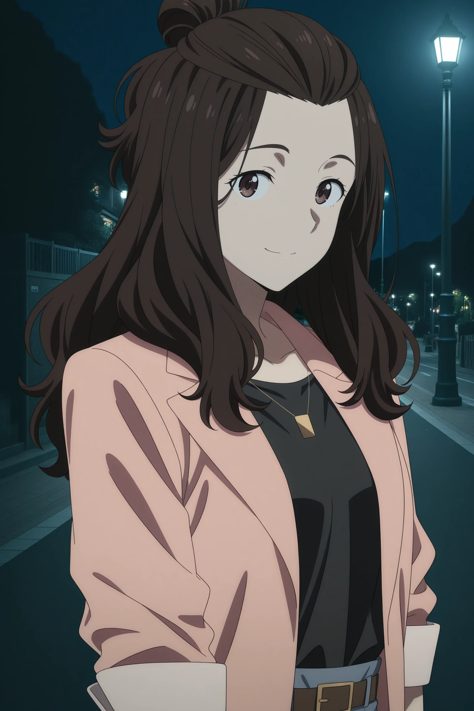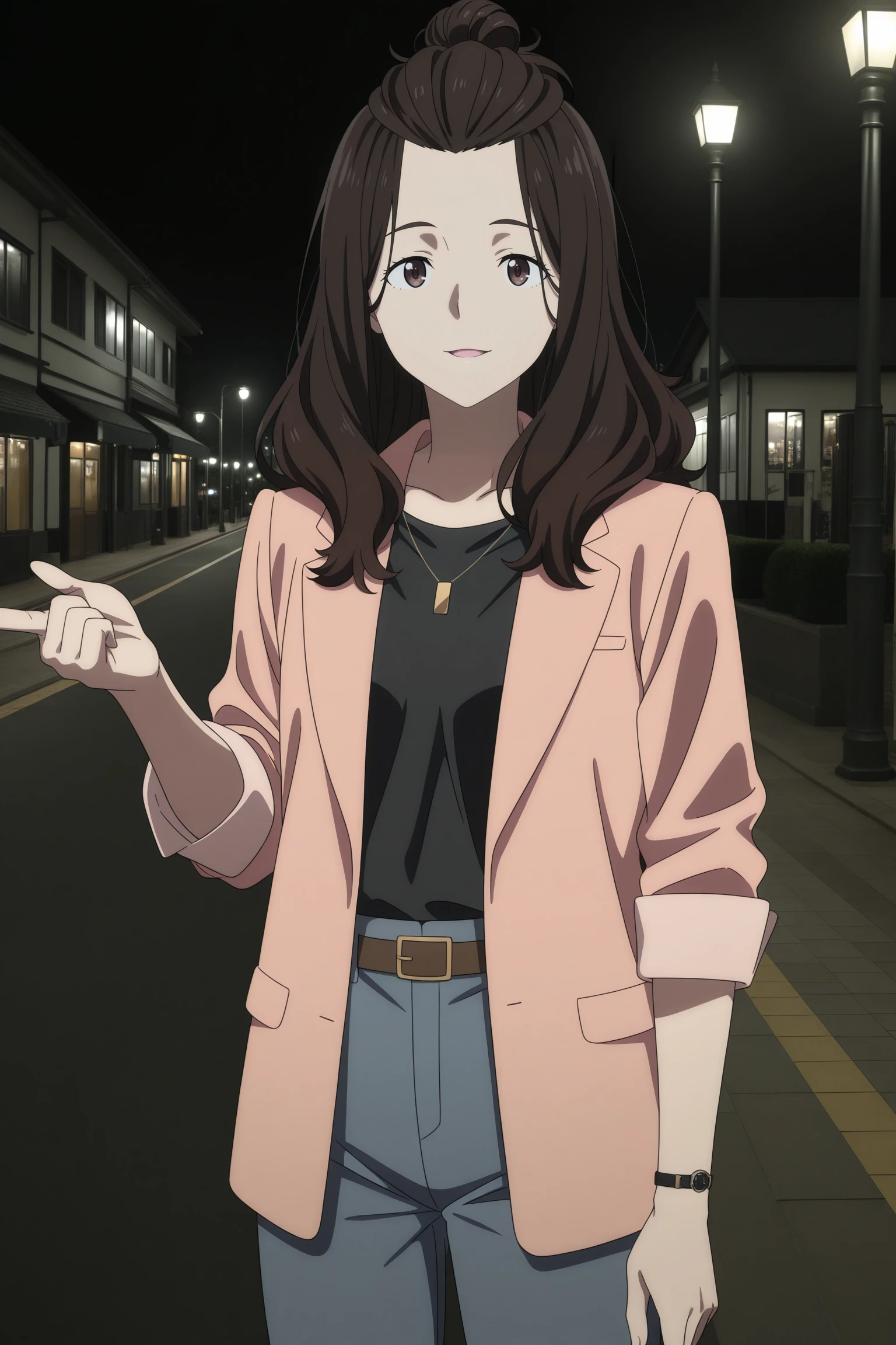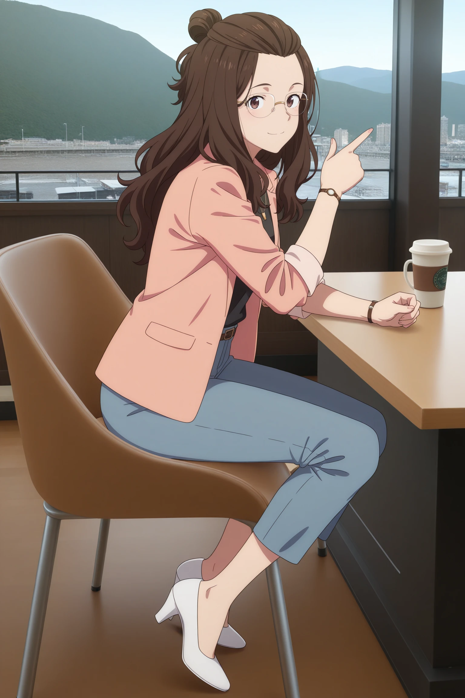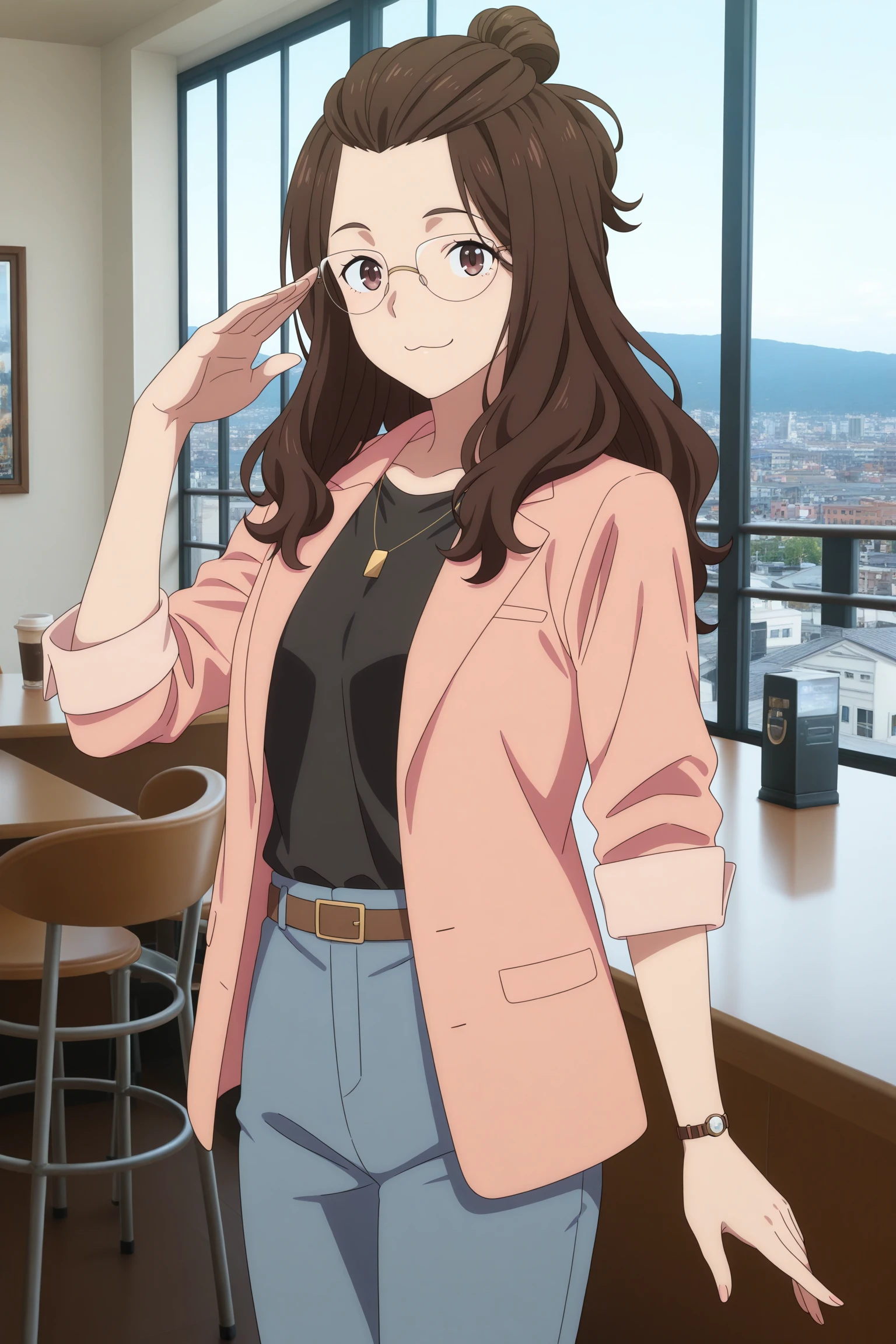 shinohara saori, long hair, brown hair, wavy hair, half updo, hair bun, bangs pinned back, brown eyes, rimless eyewear, necklace, three-quarter sleeves, pink jacket, open jacket, wristwatch, black shirt, belt, blue pants, capri pants, white shoes, high heels
