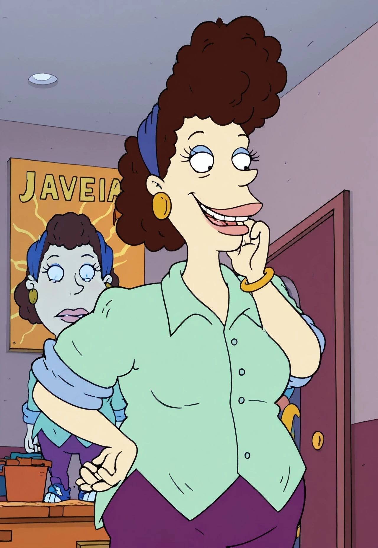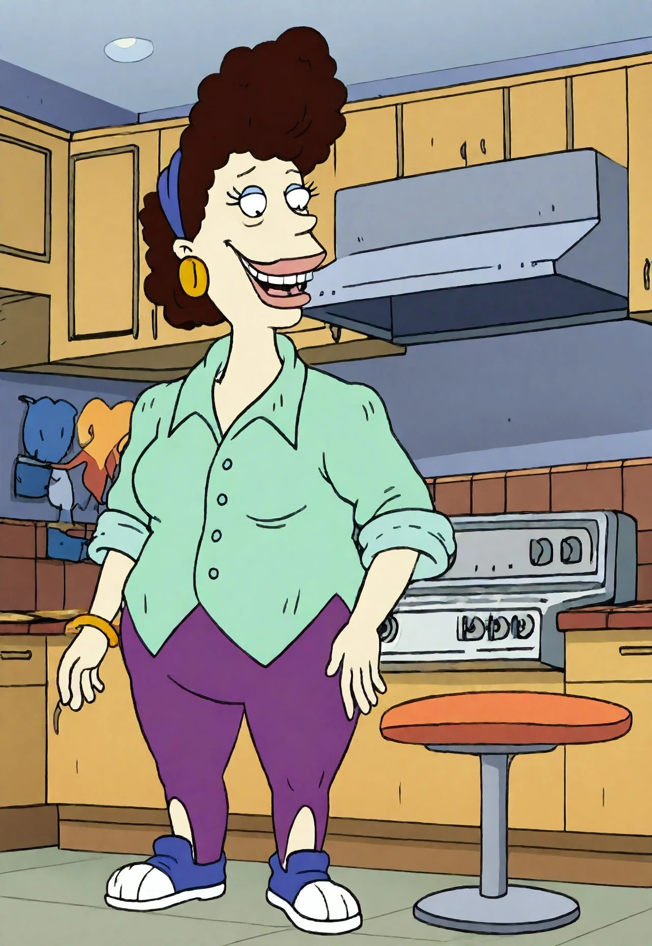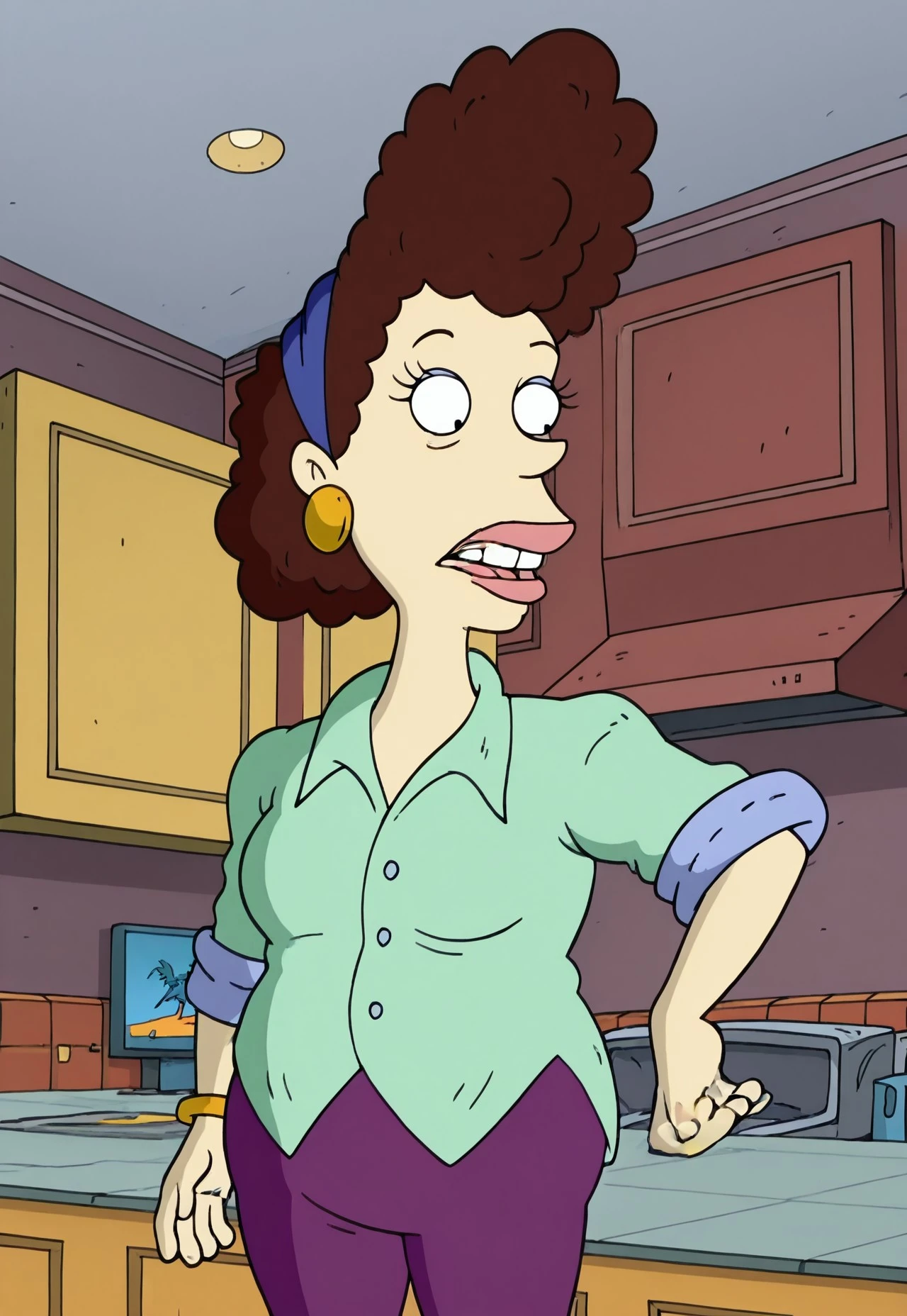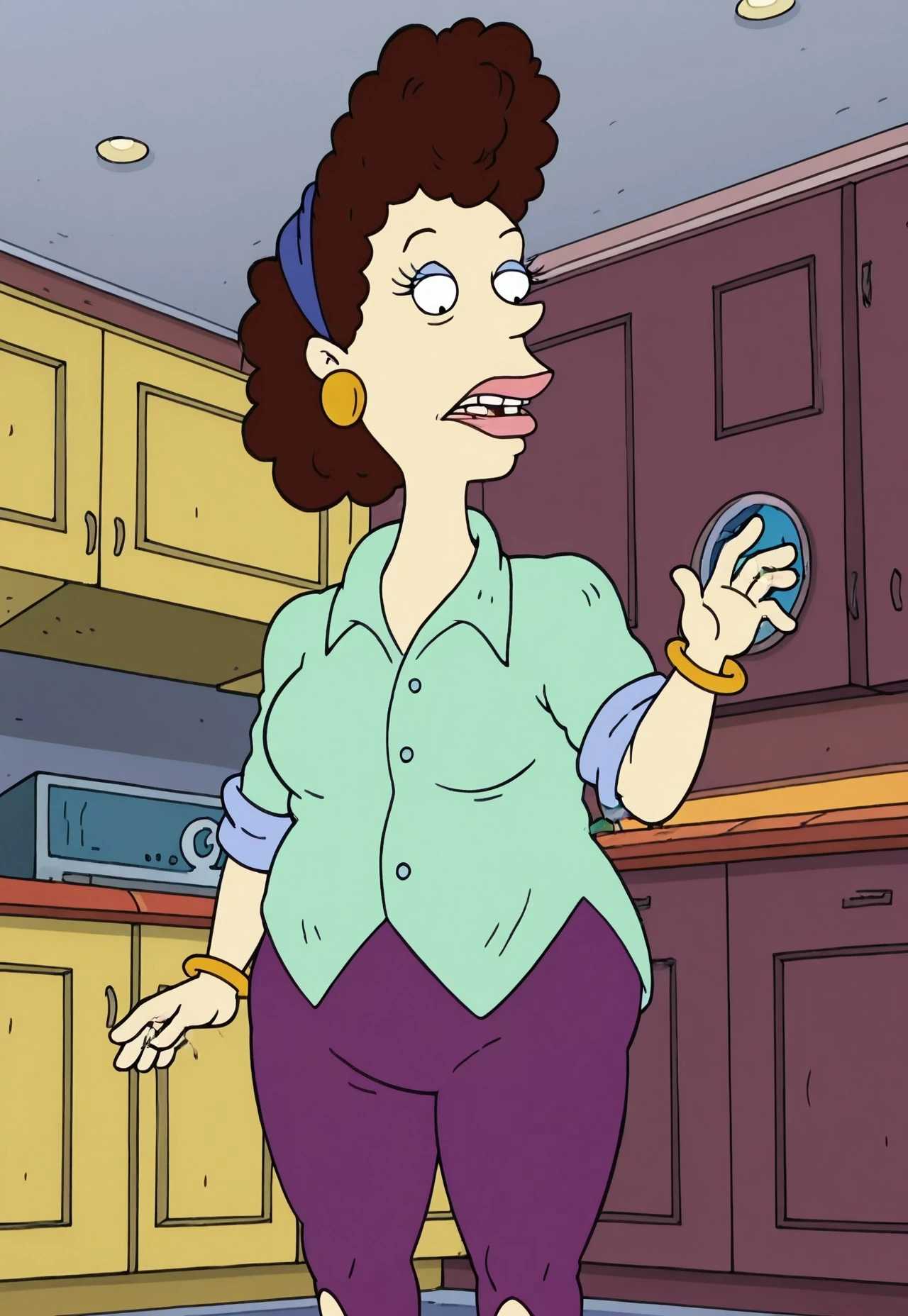 Betty DeVille, 1woman, short bushy dark brown hair, blue bandana, big earrings, lime green shirt, purple pants