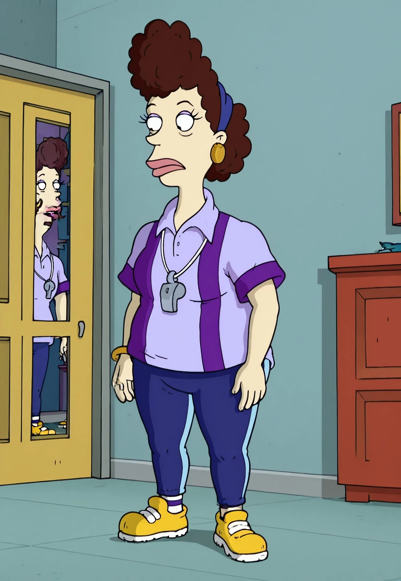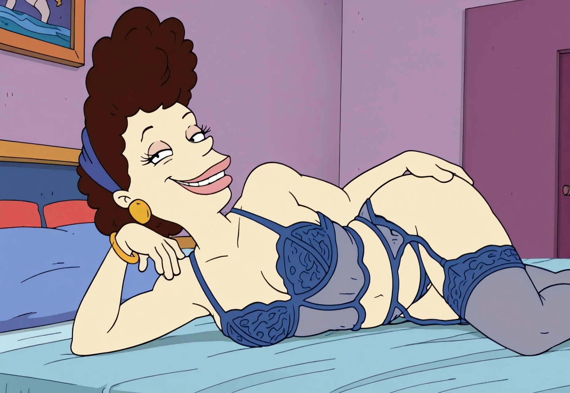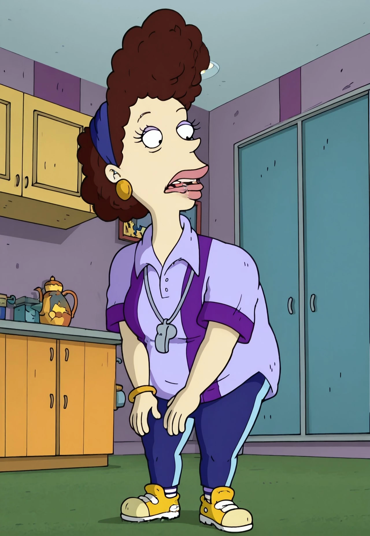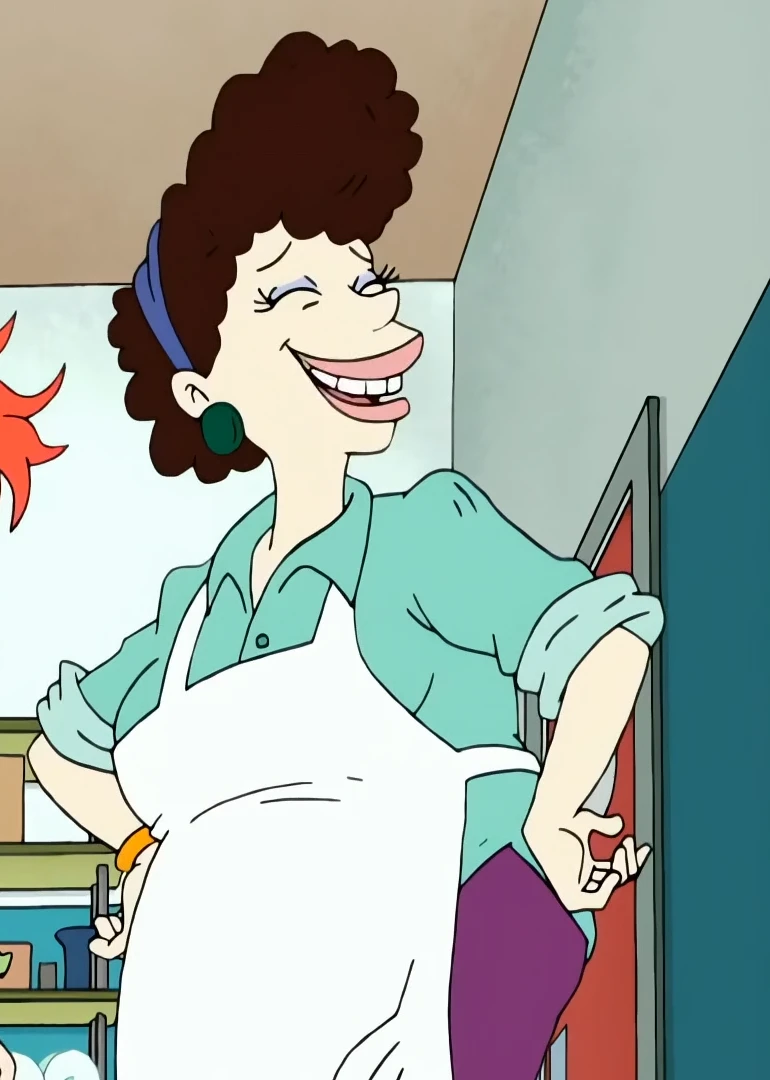 Betty DeVille, 1woman, short bushy dark brown hair, blue bandana, big earrings, lime green shirt, purple pants