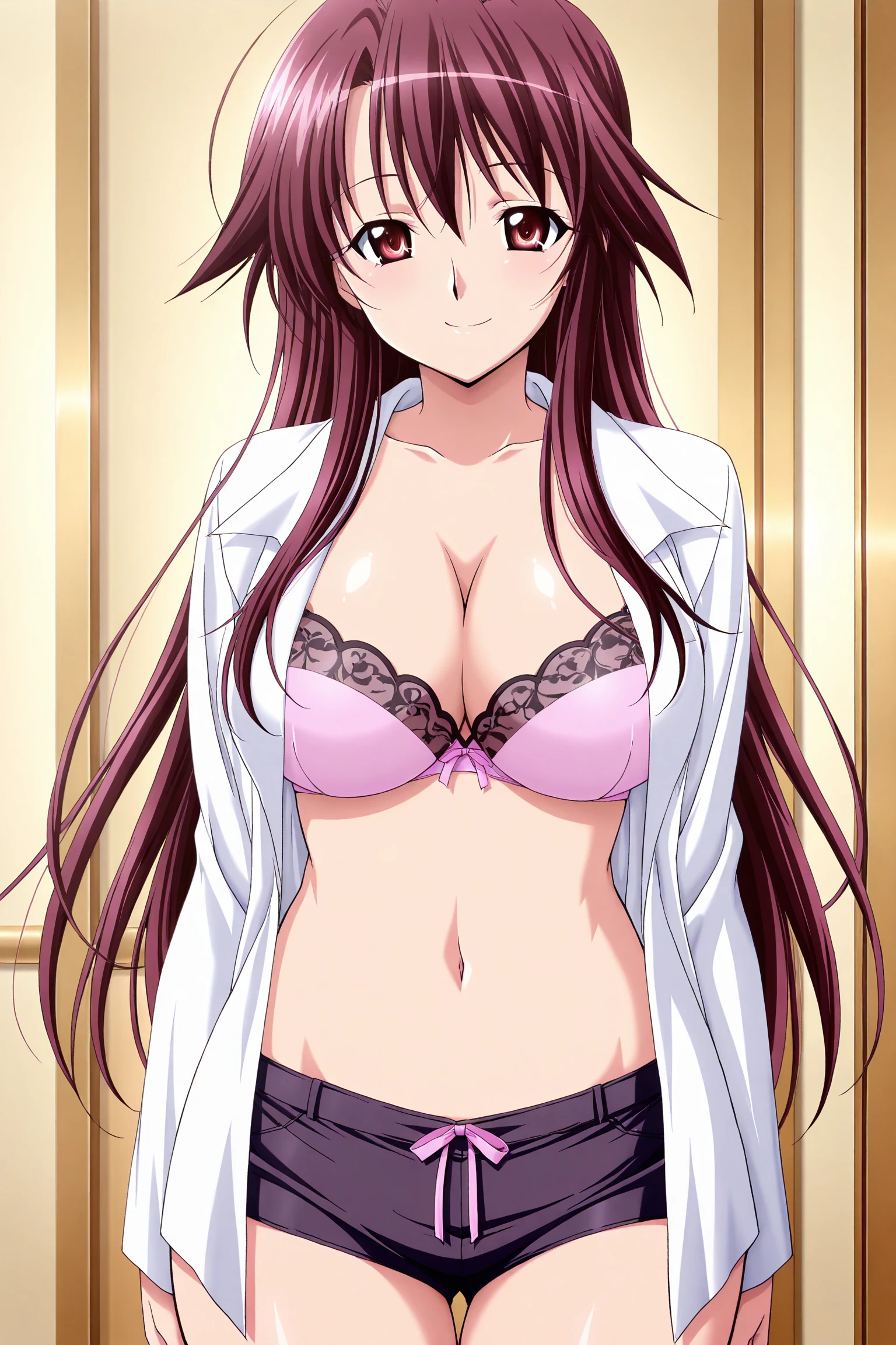 Essential keywords: 1girl, long hair, maroon hair, red eyes, large breasts
