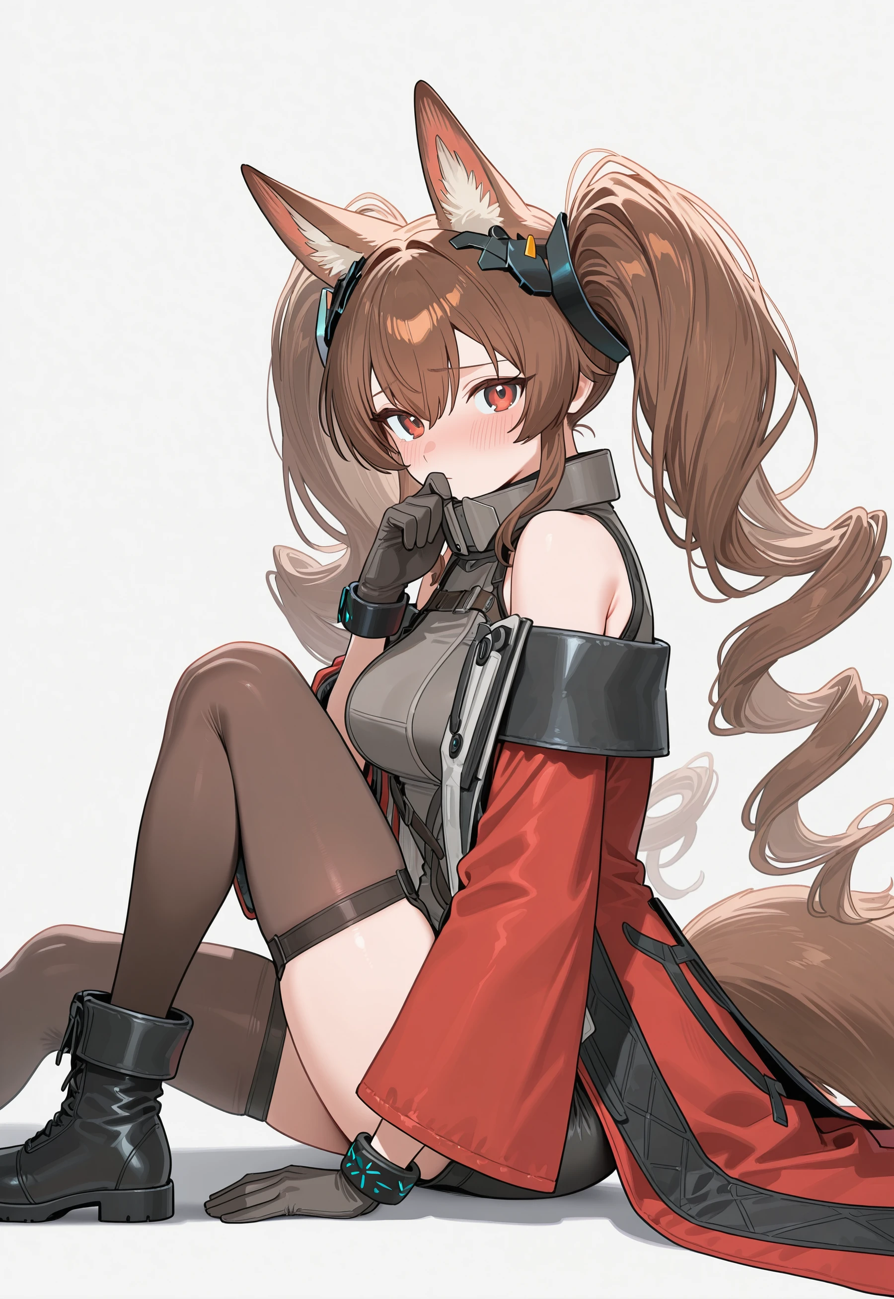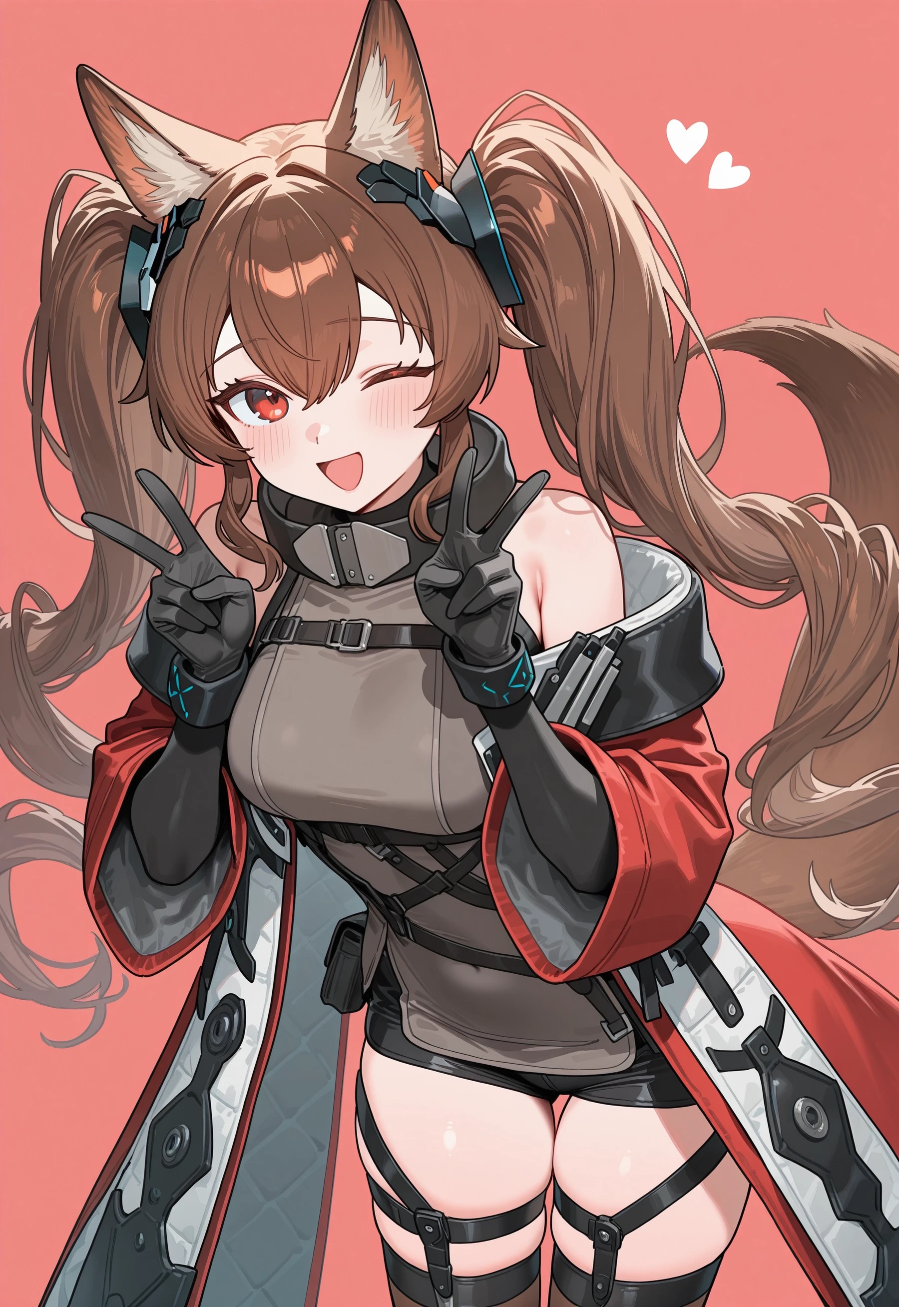 GILCH,1girl,solo,animal ears,red eyes,brown hair,long hair,twintails,thighhighs,gloves,medium breasts,tail,looking at viewe,fox ears,gil_coat,brown tail,red coat,hair ornaments,boots