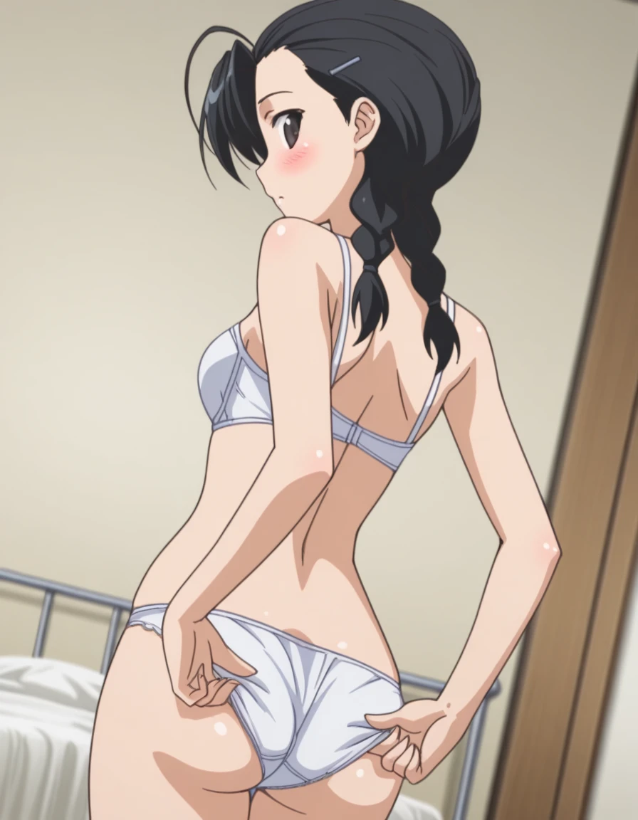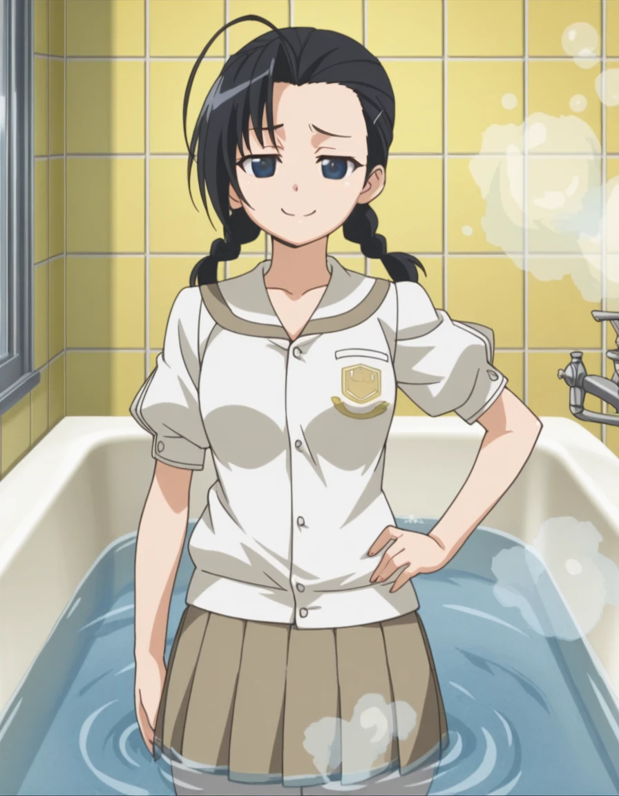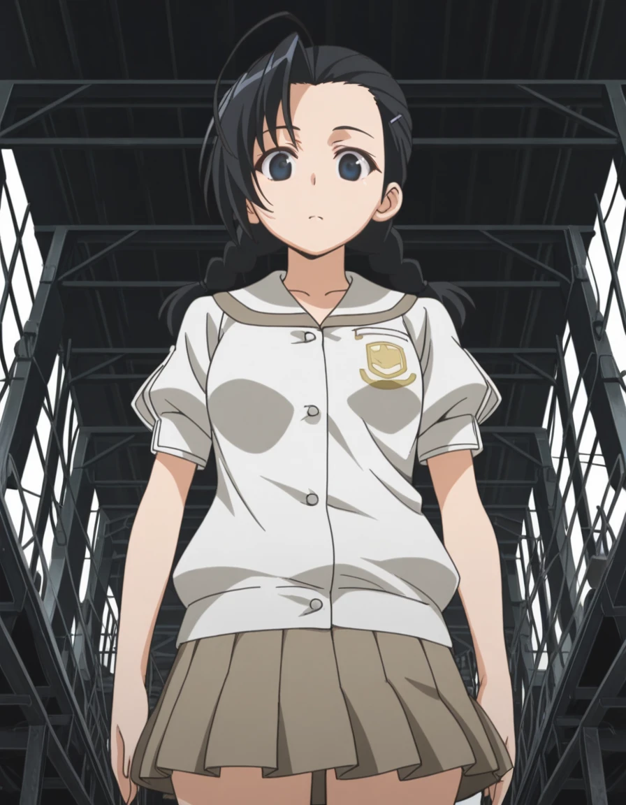 kozue kuranaga, black hair, twintails, braid, ahoge, black eyes, twin braids, mature female, small breasts, anime screencap